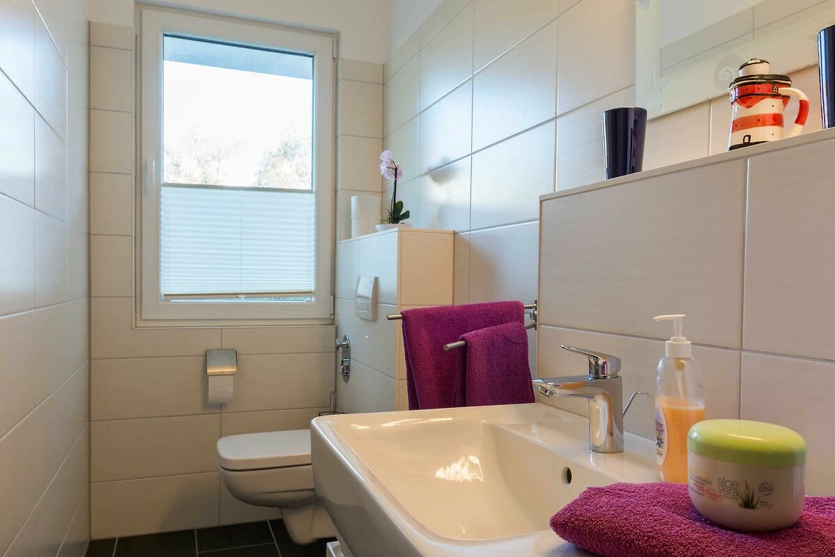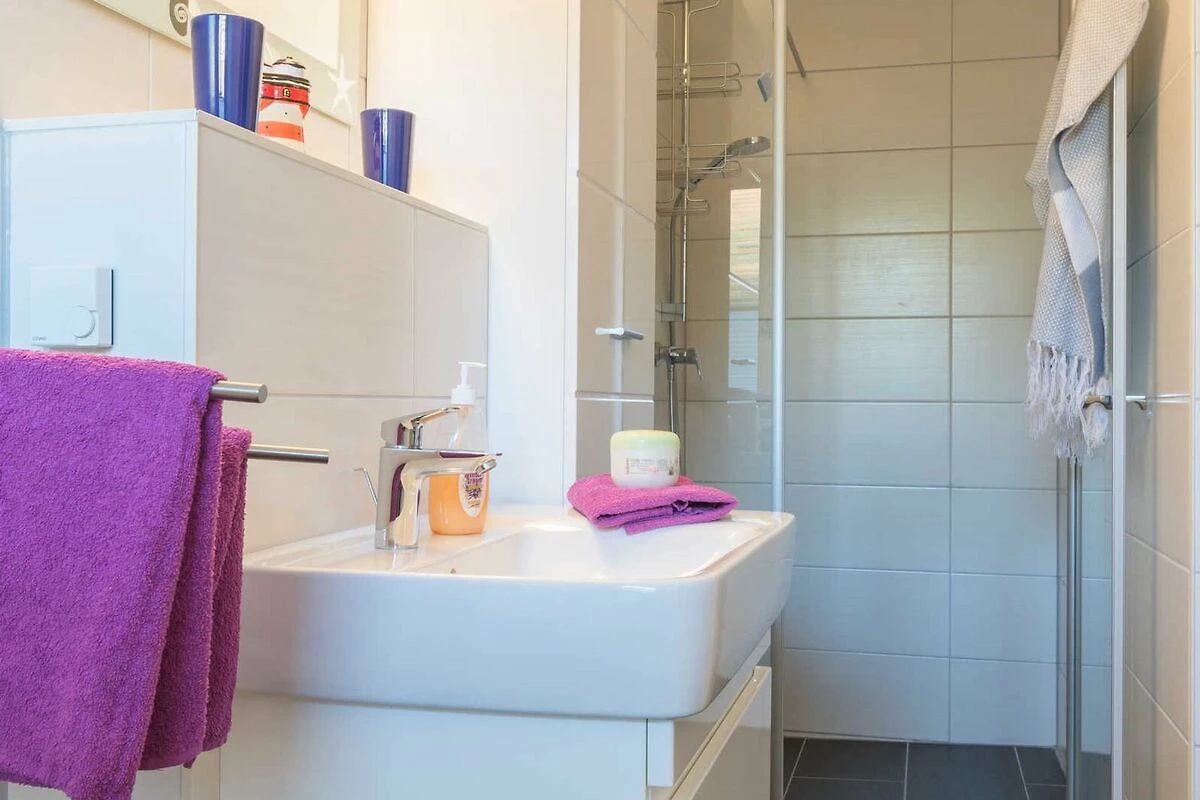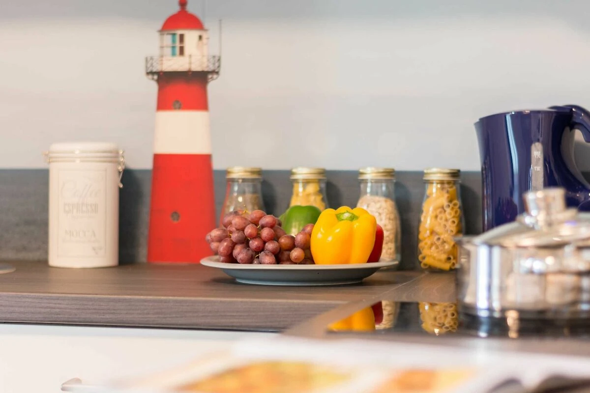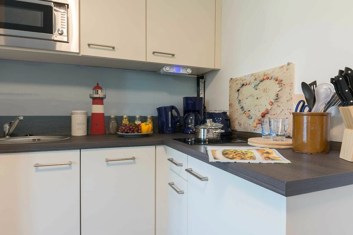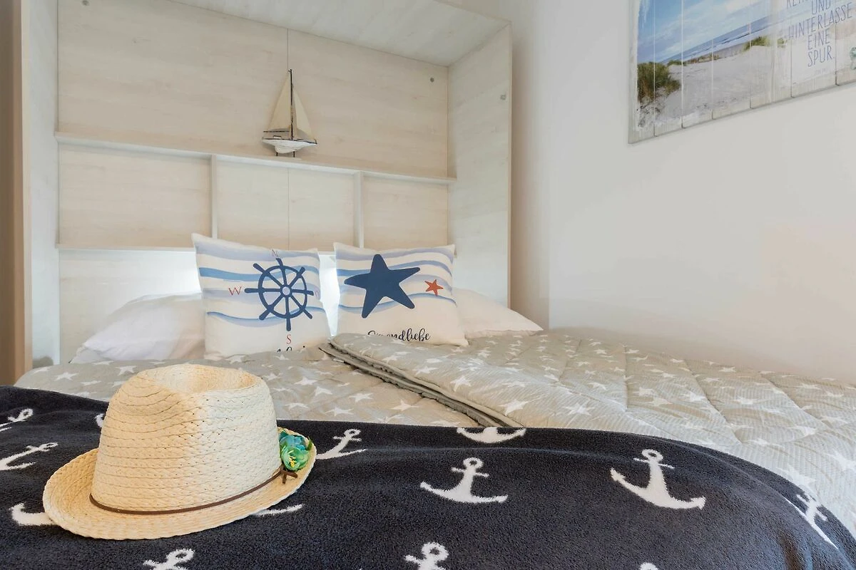 Das 2017 fertig gestellte Einraumapartment ist im maritimen Wohnstil eingerichtet und lädt in gemütlicher Atmosphäre für Zeit zu Zweit ein. Ein Wandschrank mit Sofa lässt sich mit nur einem Handgriff zum Doppelbett umfunktionieren (Liegefläche 160[nbsp] x 200cm ). In der modernen Einbauküche mit Geschirrspüler, Mikrowelle, Kühl-Gefrierkombination, Cerankochfeld, Wasserkocher, Toaster und Kaffeemaschine kann man nach Herzenslust kochen. Im grosszügigen Badezimmer befinden sich neben WC und ebenerdiger Glasdusche ein Badspiegel, ein Handtuchtrockner und ein Fön. Im Wohnbereich finden Ihre Sachen in einem grossen Kleiderschrank mit integriertem Spiegel Platz. Zum besseren Einschlafen oder für gemütliche Abende sorgen das Radio oder der wandhängende 43-Zoll Flat-TV. Das kostenfreie WLAN der Unterkunft ist ausschliesslich für die Verwendung von Social Media und den Austausch von Bildern mit Familie und Freunden gedacht. Die Nutzung zum Streamen von Filmen ist nicht vorgesehen.
