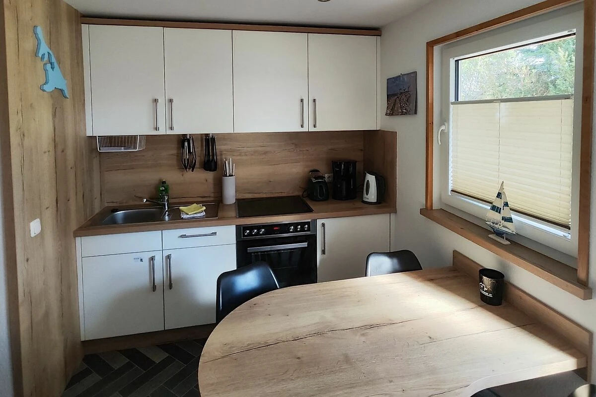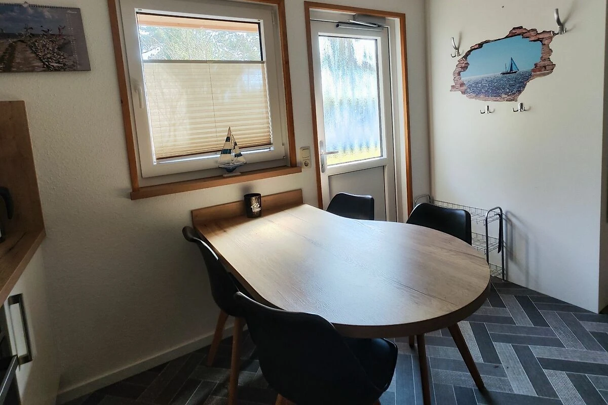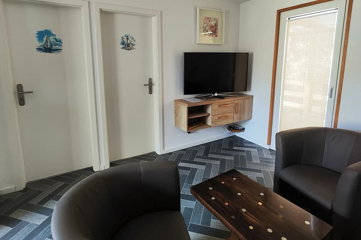 Bungalow mit 2 Schlafzimmern und einem gemütlichen Wohnraum mit Essecke, Küchenzeile und einer Couch.