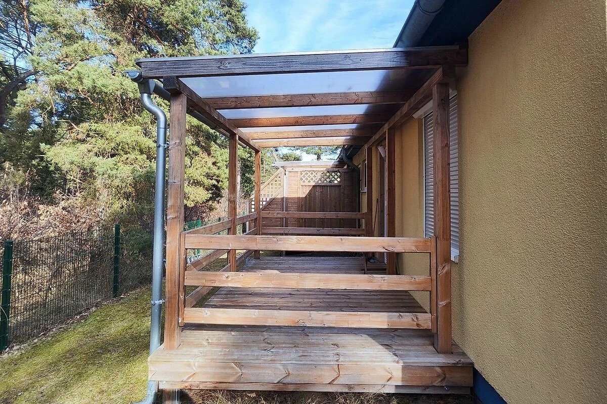 Die 10qm grosse überdachte Terrasse, umgeben von Kiefern in einer ruhigen Ferienanlage, lädt zum Relaxen und Verweilen ein. Hier können Sie die Natur geniessen und den Alltag hinter sich lassen. Gartenmöbel stehen selbstverständlich für Sie bereit.