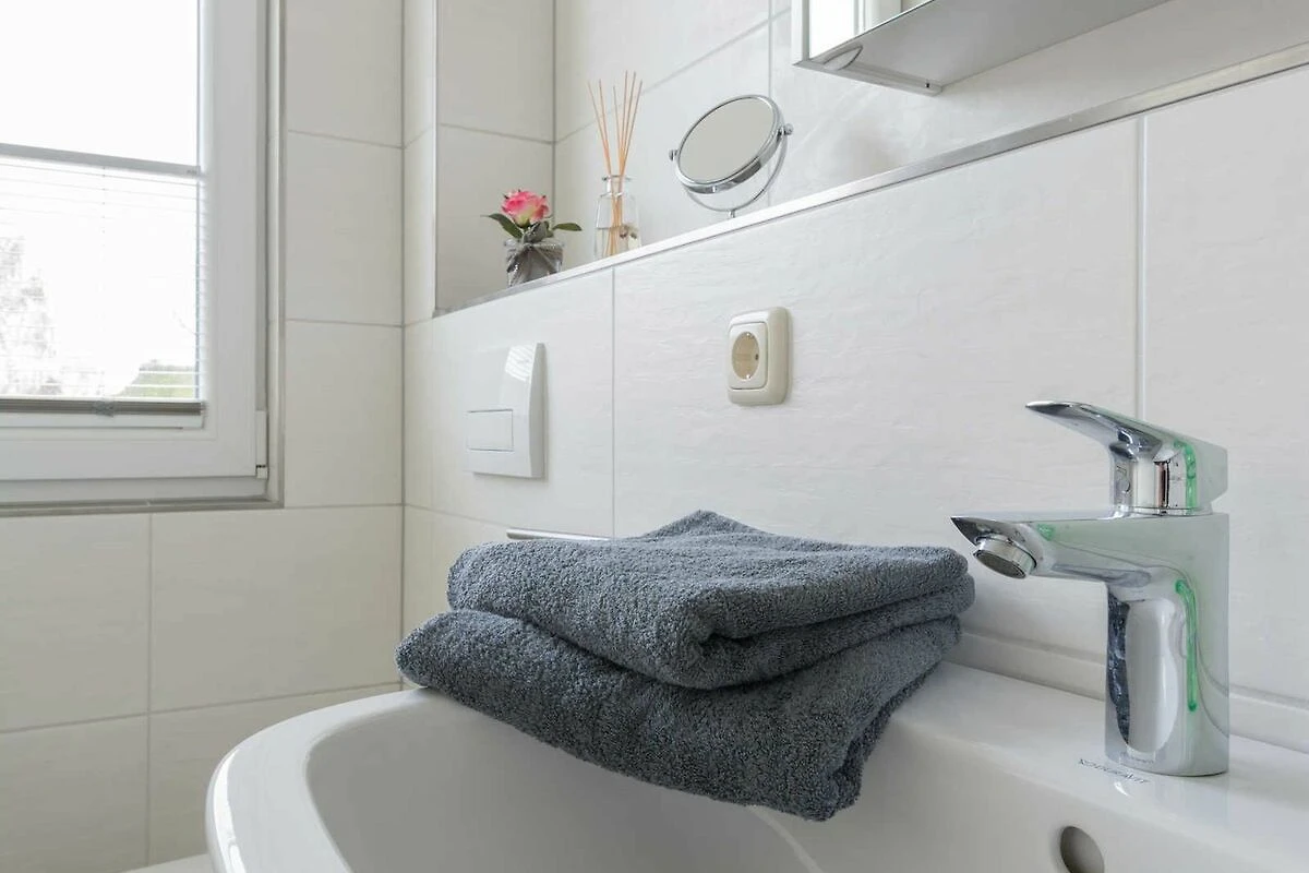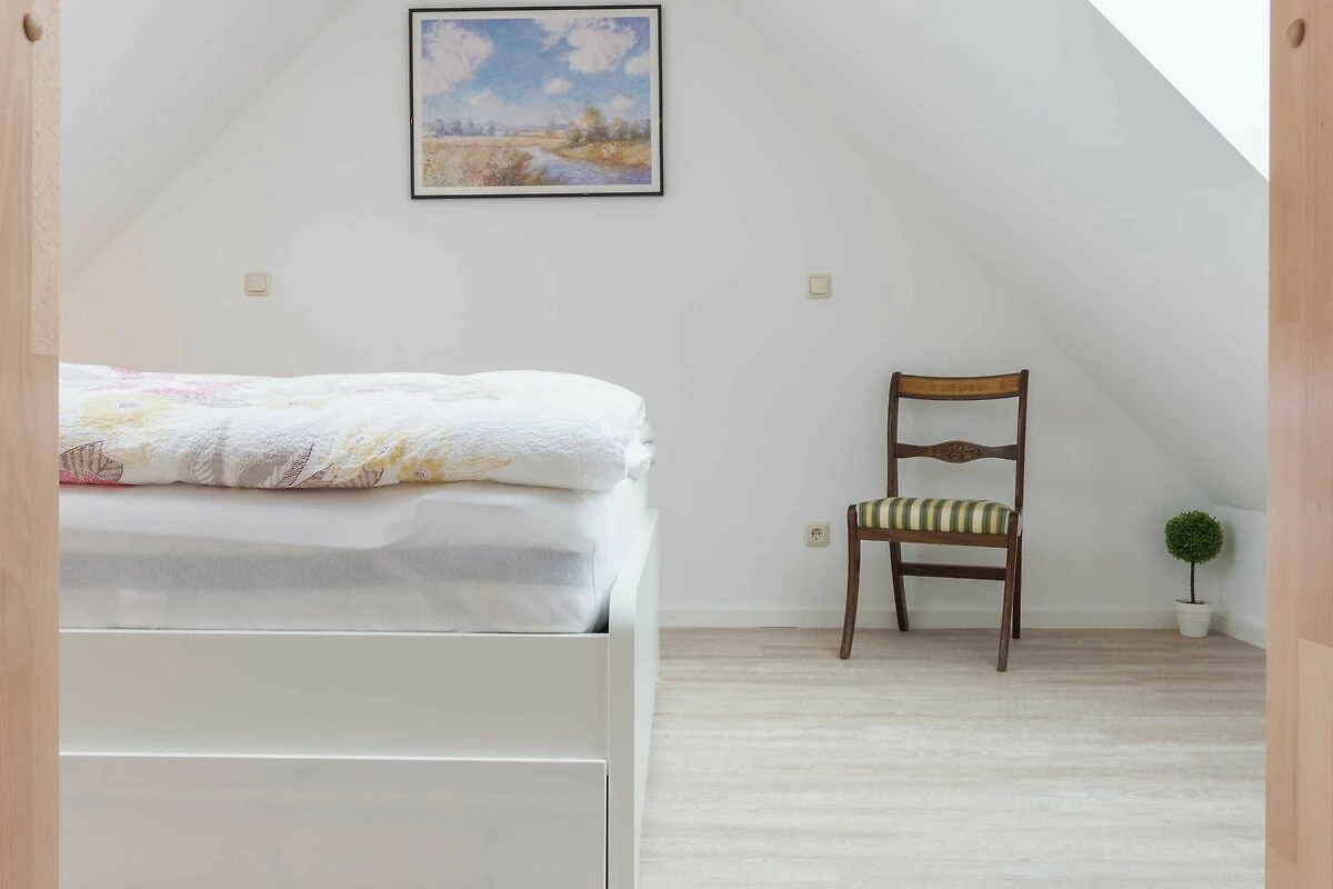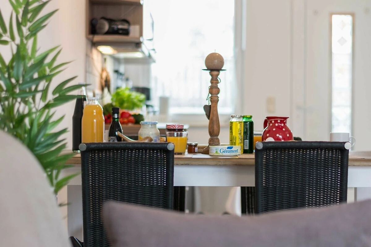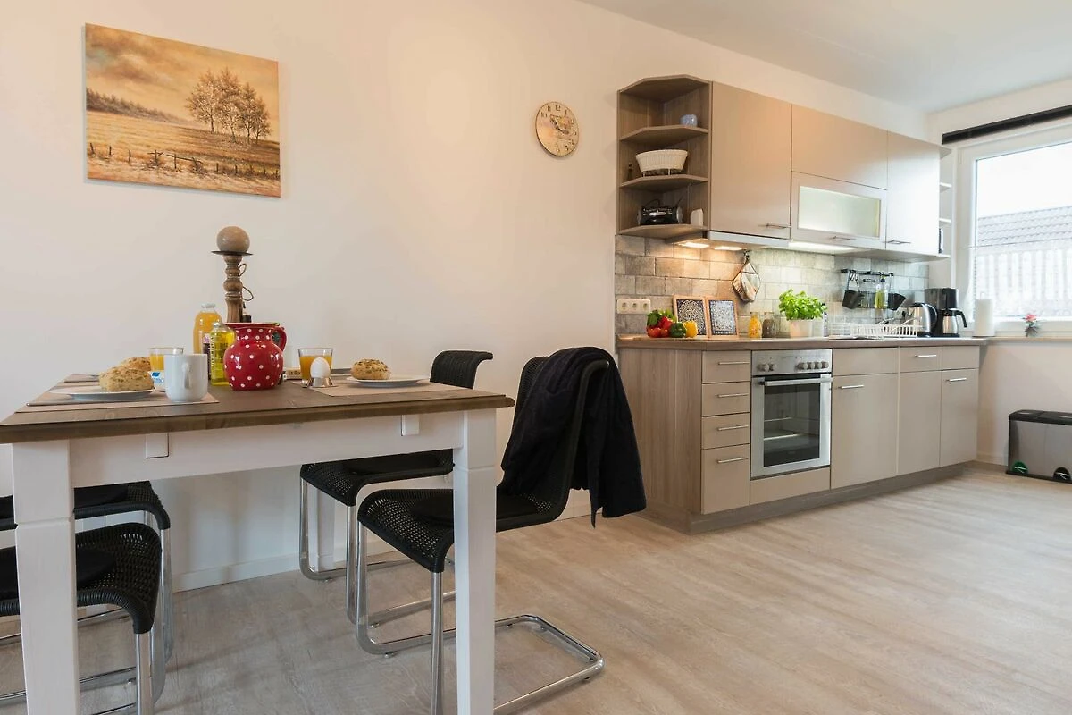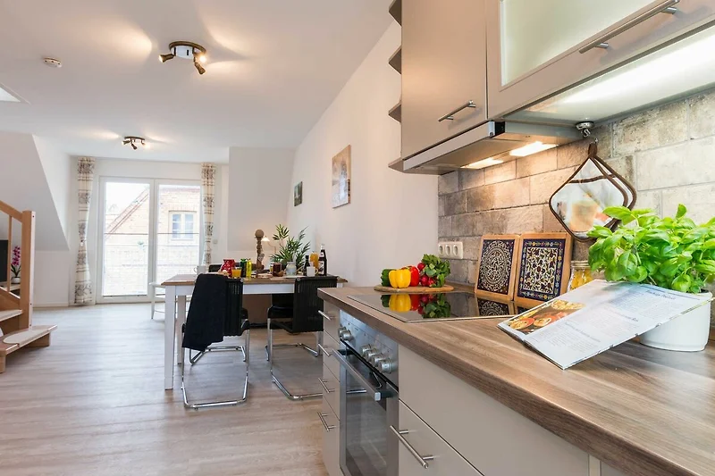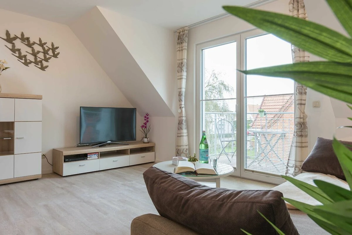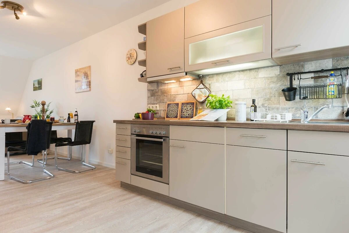 Der Wohnbereich bietet Ihnen ein gemütliches Sofa, einen internetfähigen Fernseher (49 Zoll) inkl. DVD-Player, eine Sitzecke und eine Einbauküche, welche über einen Geschirrspüler, einen Kühlschrank mit Gefrierfach, einen Backofen und einen Herd mit Ceranfeld verfügt. Die Küche ist zudem mit elektronischen Geräten, wie z.B. einem Wasser- und Eierkocher, einer Kaffeemaschine mit Thermoskanne, einem Toaster, einem Radio sowie diversem Geschirr ausgestattet. Auf dem Balkon kann man die Nachmittags- und Abendsonne geniessen. Die Maisonette-Wohnung verfügt über zwei Zimmer, die über eine Treppe miteinander verbunden sind. Vom Schlafzimmer im Dachgeschoss ist mit einem Doppelbett 1,80 x 2,00 m ausgestattet (Einzelmatratzen). Von hier aus haben Sie einen wunderschönen Blick nach Heiligendamm und auf den Conventer See. Im Badezimmer kann man an kalten Tagen unsere Whirlpoolwanne geniessen. Es gibt zudem einen Föhn, einen Kosmetikspiegel und einen Wäscheständer. Für den Strand stehen zwei Klappstühle und ein Sonnenschirm zur Verfügung.