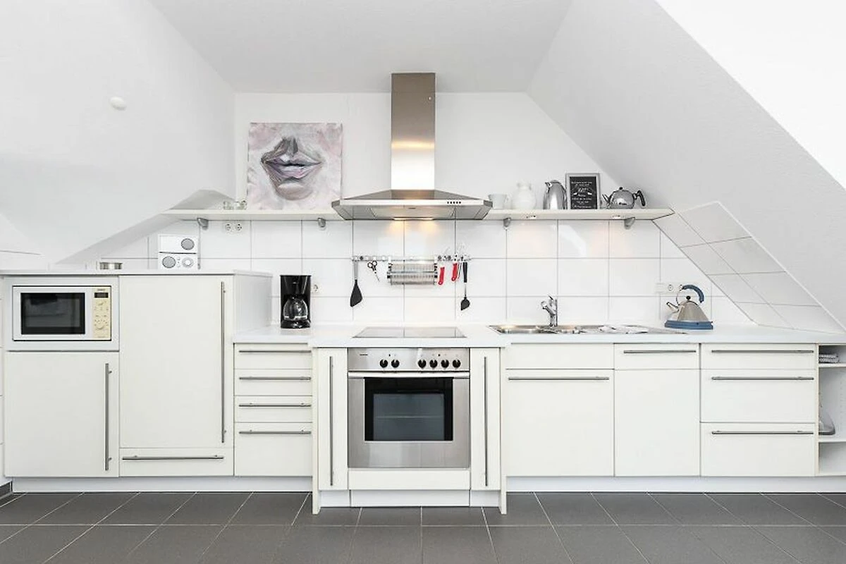 Sie spazieren durch die moderne überdachte „Deichpassage“ vorbei an netten Geschäften und moderner Gastronomie in ca. 50 Metern bis zum Deichausgang. Ein komplettes Einkaufszentrum ist im Haus vorhanden.