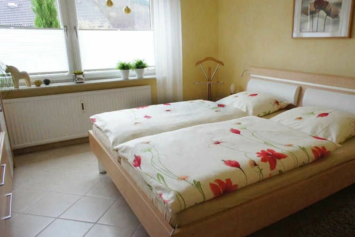 Das Schlafzimmer verfügt über ein Komfort-Doppelbett mit verstellbarem Rahmen. Die Betten sind bei Anreise bezogen. Am Schlafzimmerfenster befindet sich ein Fliegenschutz und ein Aussenrollo.