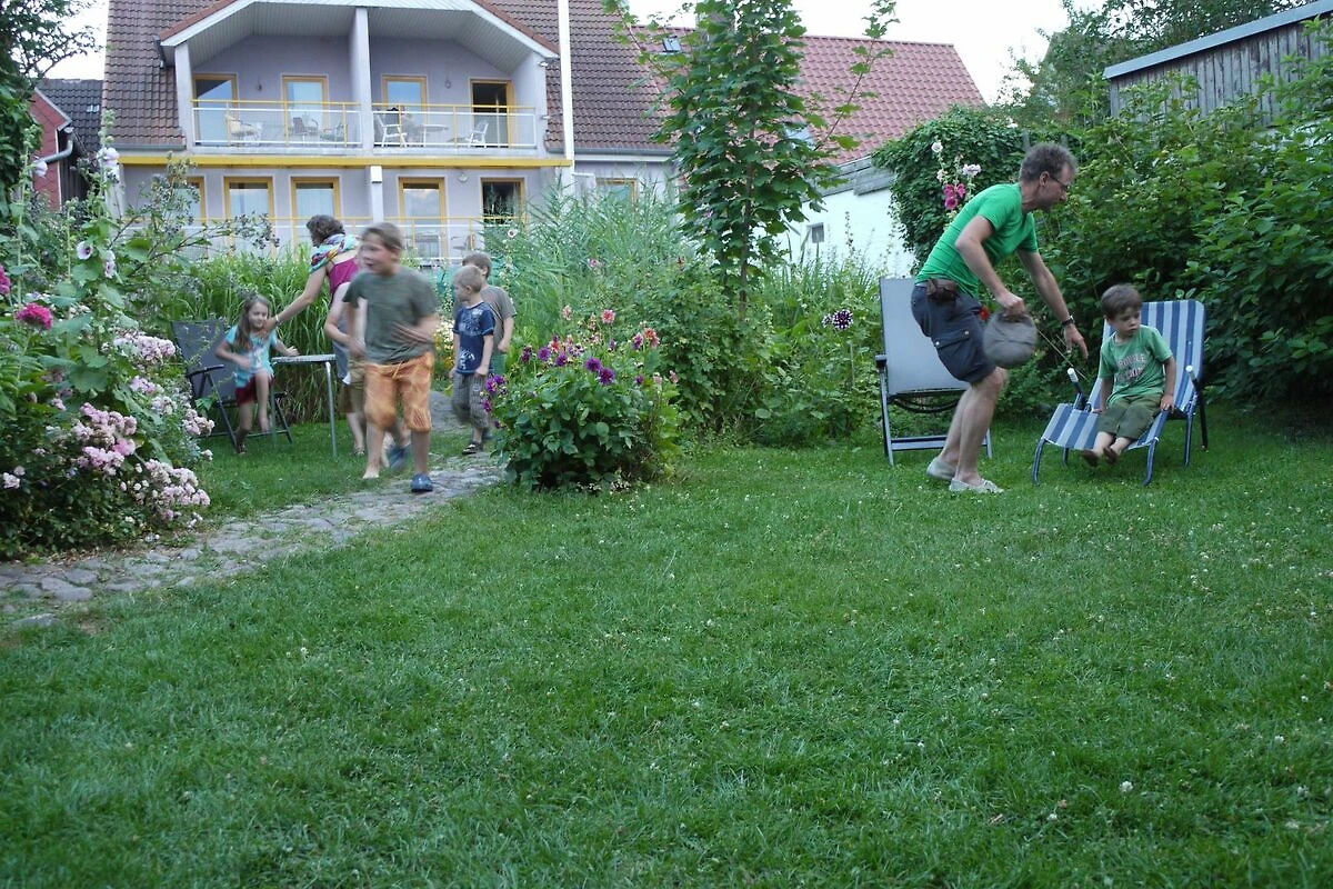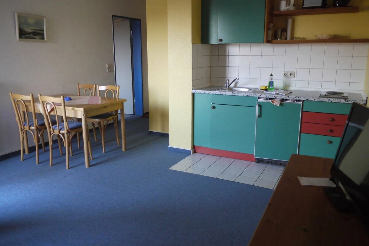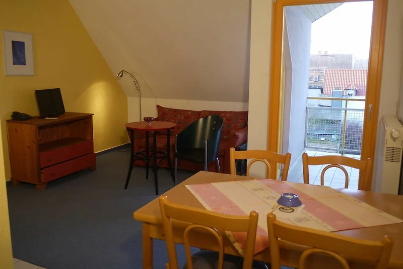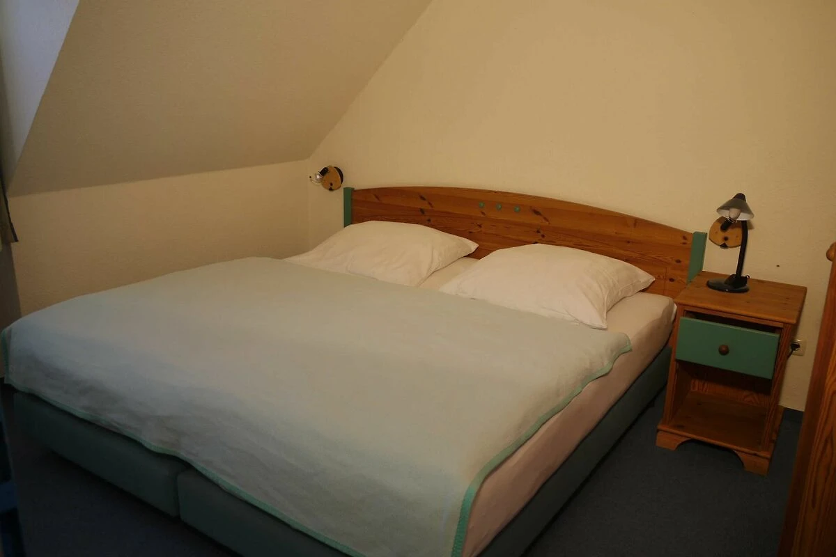 Ihre Ferienwohnung liegt im Dachgeschoss. Vom Treppenhaus gelangen Sie in den Wohnbereich mit Mini-Küche. Bei Bedarf kann ein Kind auf dem Sofa schlafen. Auf dem überdachten Balkon haben Sie einen schönen Blick in den Garten, den Sie ebenfalls nutzen können.