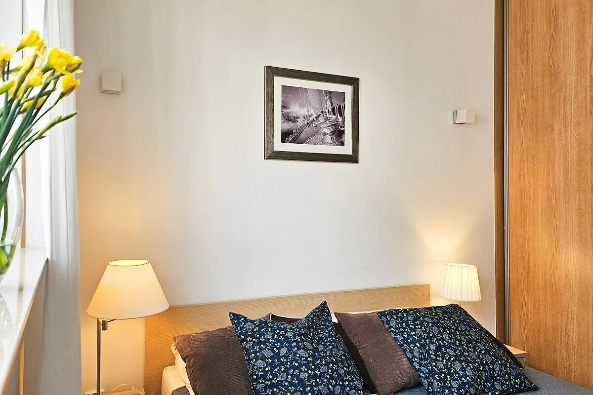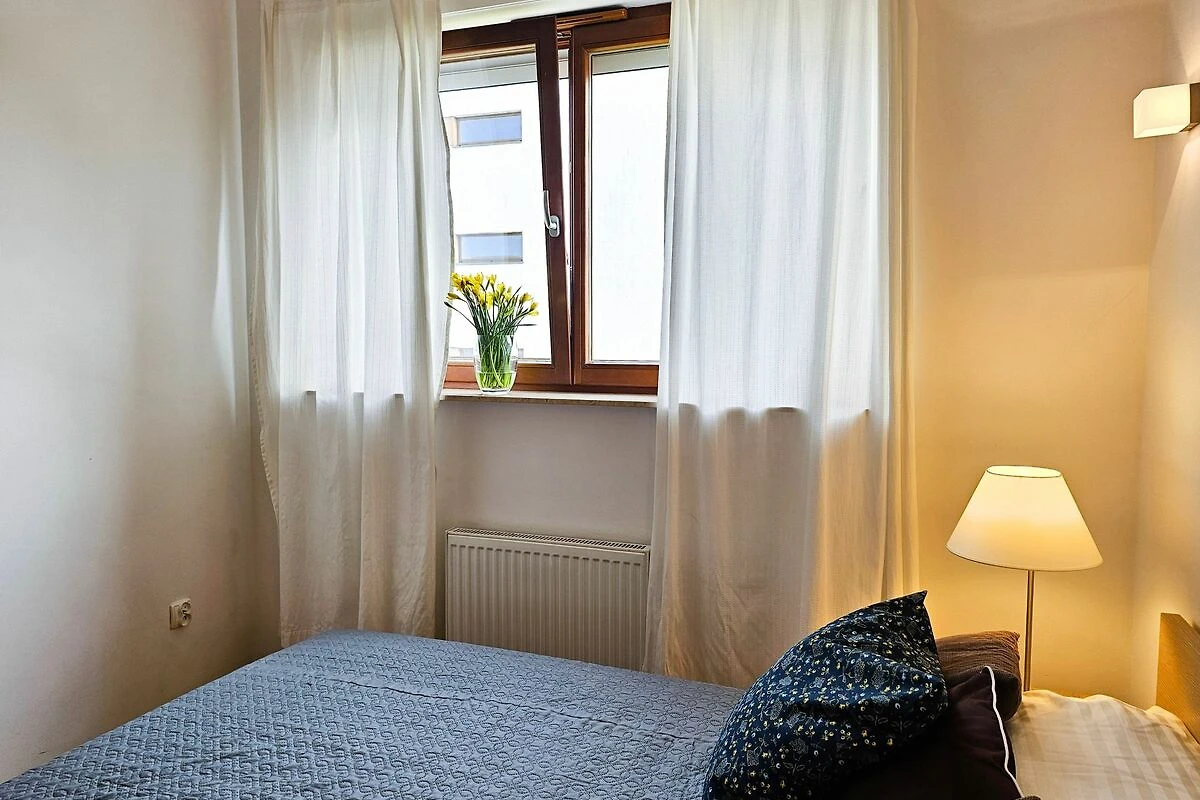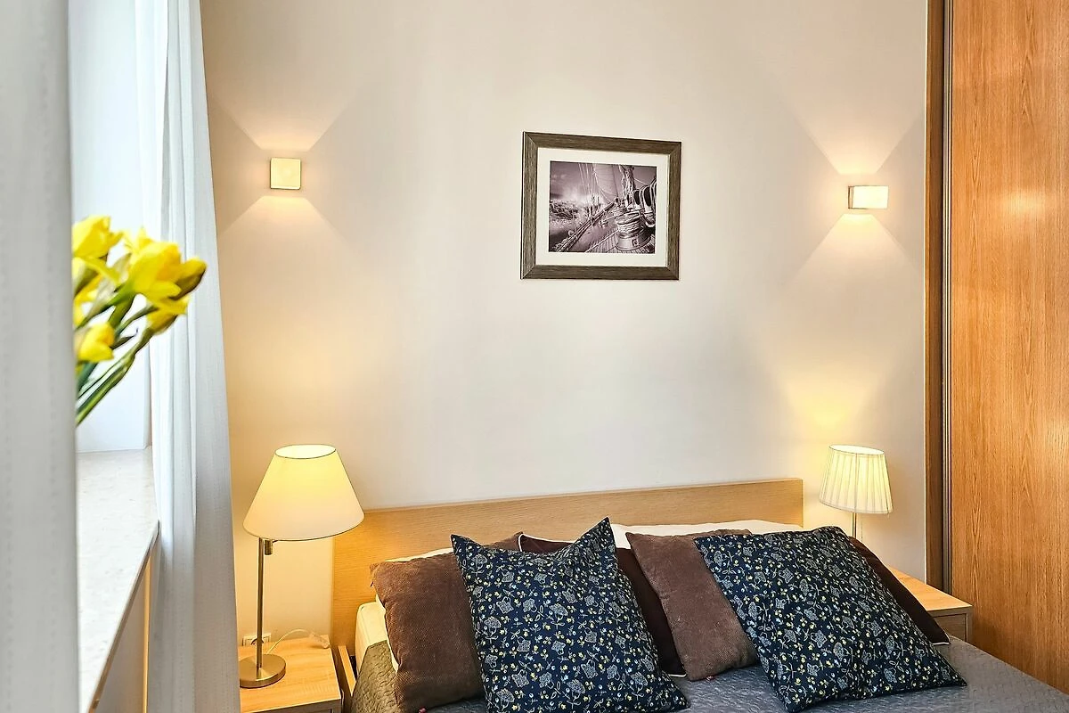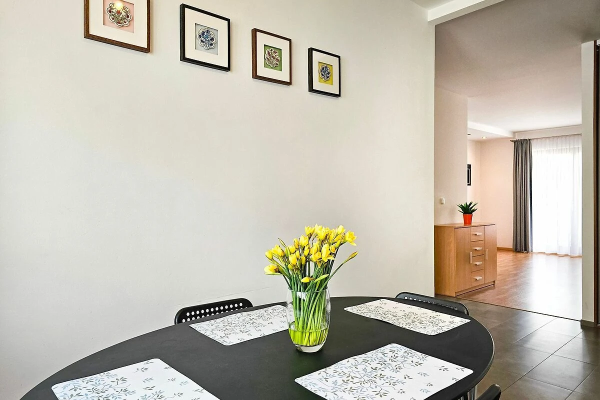 Eine geräumige (56m2) 2-Zimmer-Ferienwohnung im zweiten Stock eines Gebäudes im Wohngebiet Platan. Sie besteht aus einem Wohnzimmer mit Balkon, einem Schlafzimmer, Badezimmer und einer separaten Küche (die Küche ist kein abschliessbarer Raum).