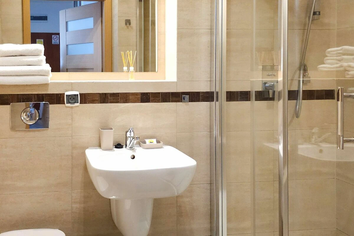 Das Badezimmer mit Dusche und WC ist zusätzlich mit einer Waschmaschine ausgestattet.