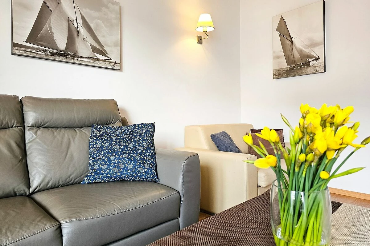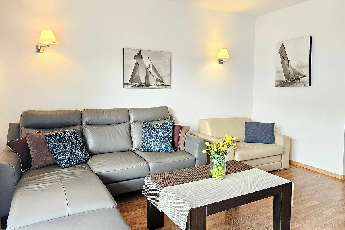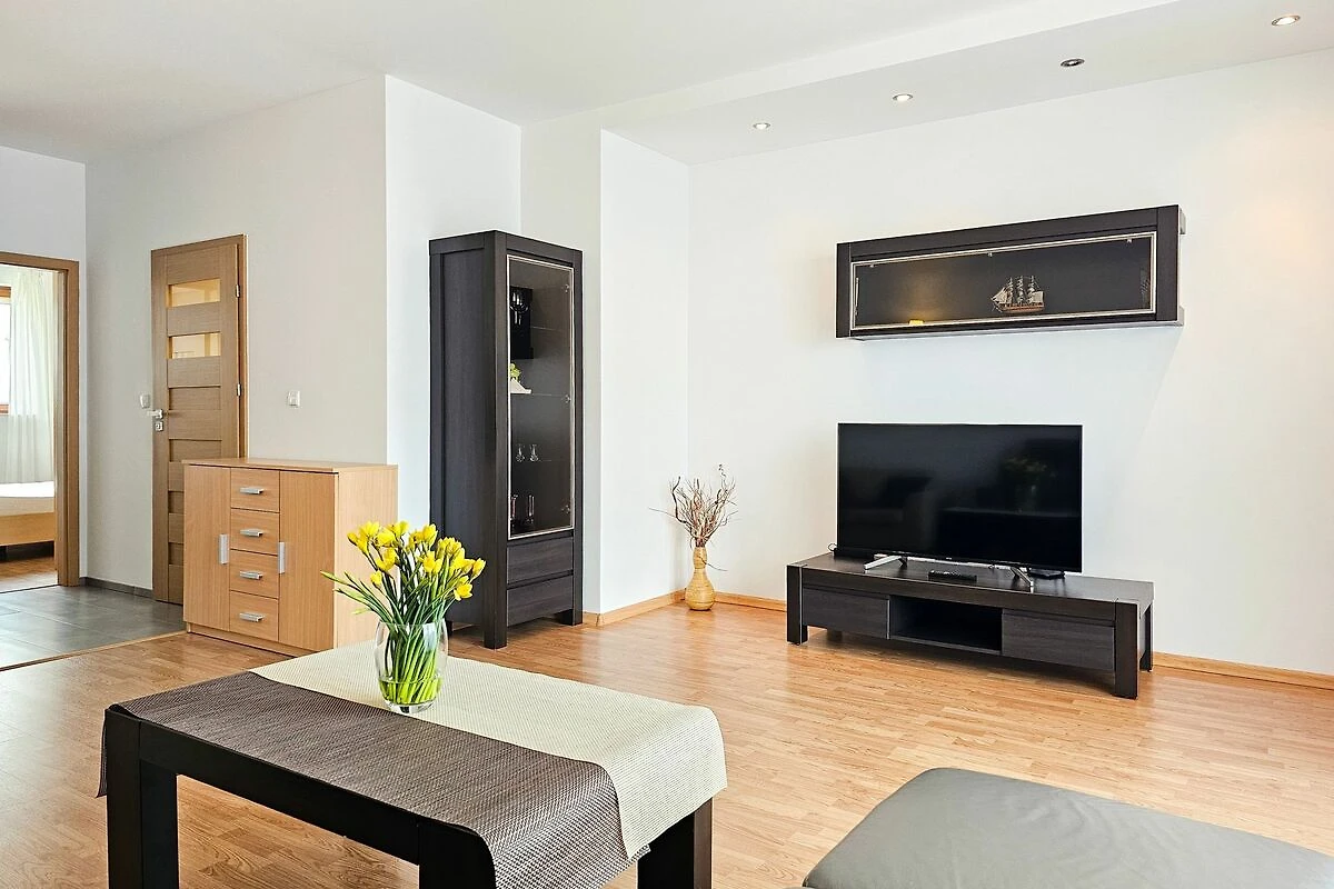 Im Wohnzimmer, mit Balkonausgang, steht eine Kommode mit einem LCD-TV mit Kabelanschluss, Glasvitrine, ein Couchtisch und zwei Schlafsofas (das erste mit einer Liegefläche von 130x190cm, das zweite mit einer Liegefläche von 90x190cm). Das Wohnzimmer schafft einen offenen Raum mit einem Flur (keine Tür). Die Fenster des Wohnzimmers, sowie der Balkon sind nach Westen gerichtet. Auf dem Balkon stehen zwei Holzstühle und ein Tisch.
