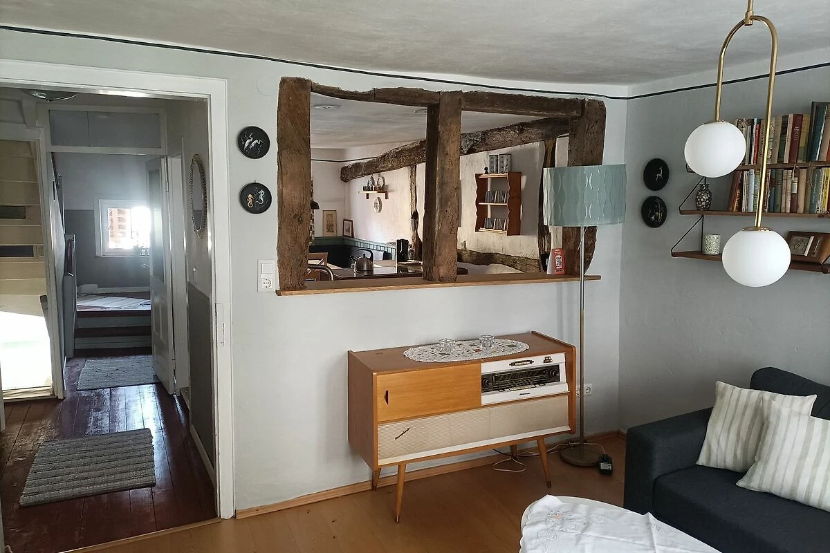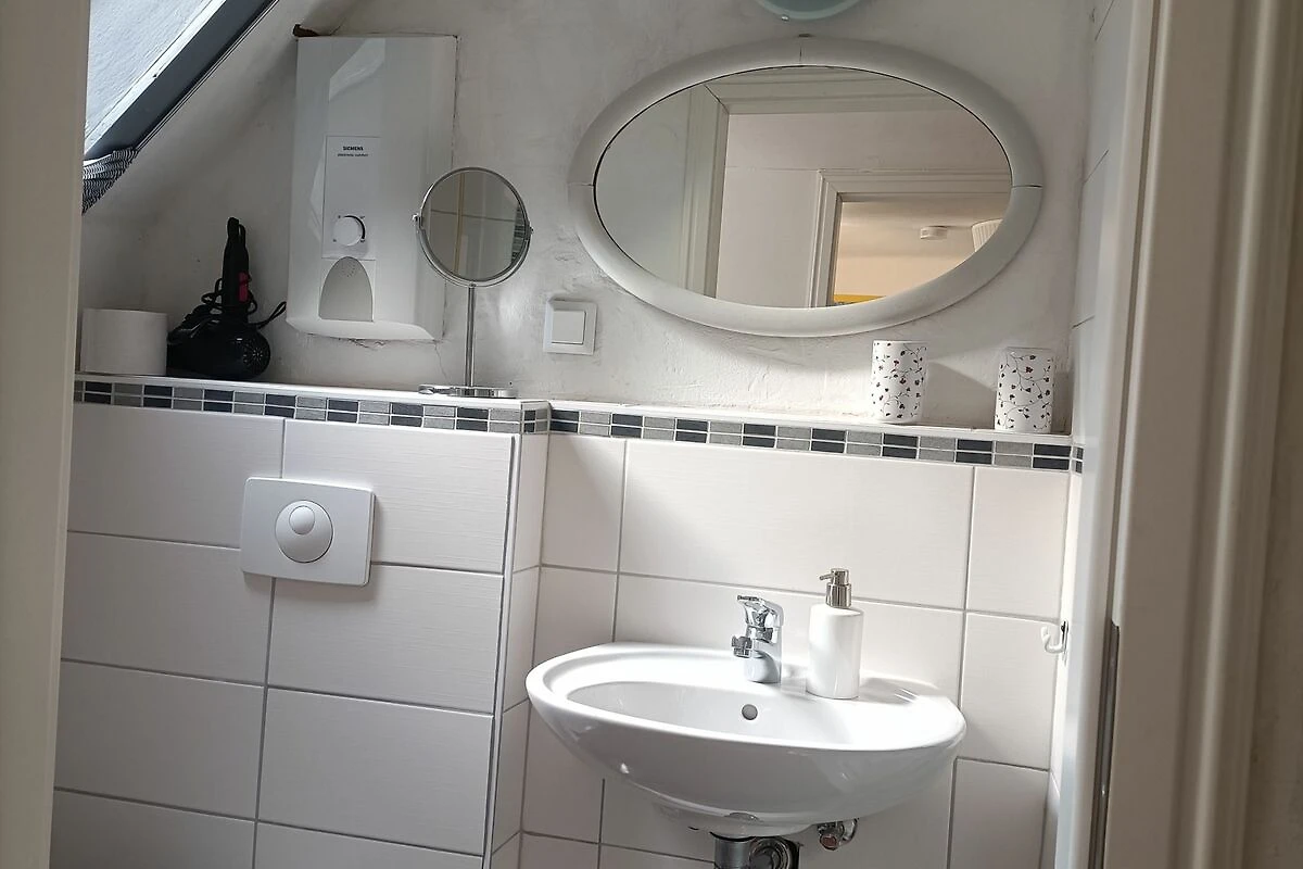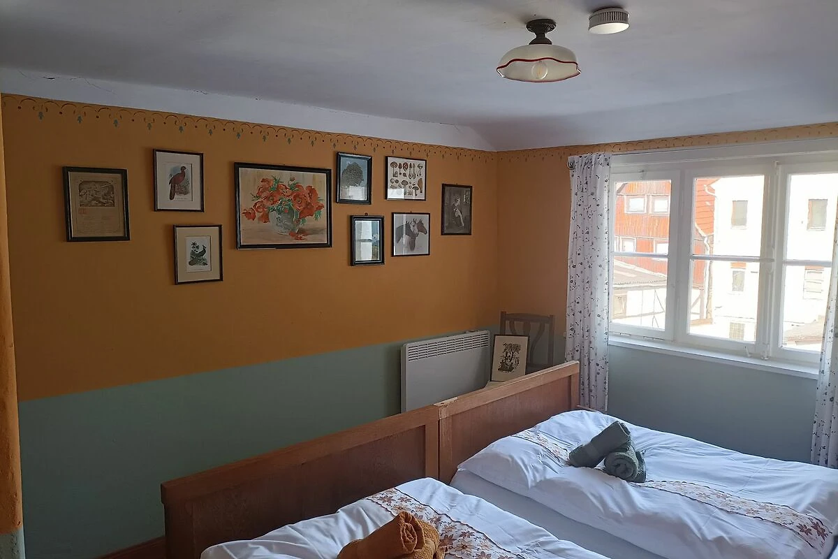 Die Ferienwohnung befindet sich in den oberen beiden Etagen. Über die Treppe geht es in den hellen Flur. Von dort geht es in das liebevoll eingerichtete Wohnzimmer. Die Küche ist gleich daneben. Sie ist mit allem was man so braucht ausgestattet. Es gibt dort eine Sitzecke mit Blick in den begrünten Hof. Über eine innenliegende Treppe gelangen sie in das Dachgeschoss. Dort sind die beiden Schlafzimmer. Eines ist im Stil der 20er Jahre mit grossem Doppelbett und Blick in den Hof. Das andere gegenüber ist mit zwei, je 90 cm breiten Betten ausgestattet. Daran liegt das Tageslichtbad mit Dusche.