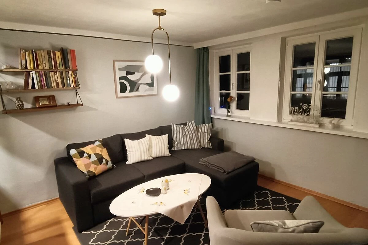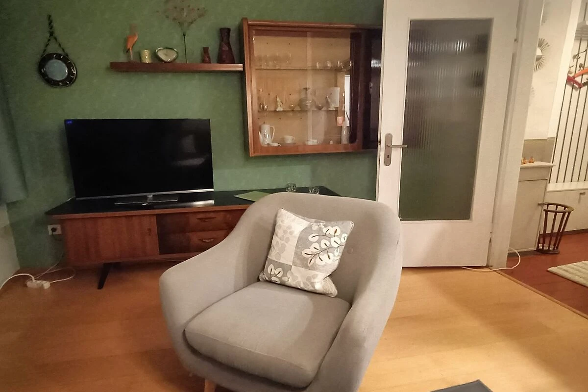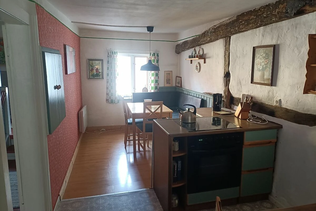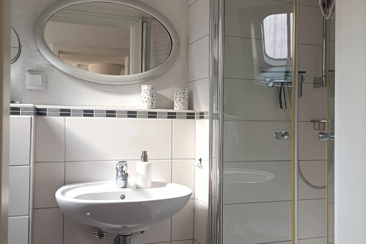 Die Ferienwohnung befindet sich in den oberen beiden Etagen. Über die Treppe geht es in den hellen Flur. Von dort geht es in das liebevoll eingerichtete Wohnzimmer. Die Küche ist gleich daneben. Sie ist mit allem was man so braucht ausgestattet. Es gibt dort eine Sitzecke mit Blick in den begrünten Hof. Über eine innenliegende Treppe gelangen sie in das Dachgeschoss. Dort sind die beiden Schlafzimmer. Eines ist im Stil der 20er Jahre mit grossem Doppelbett und Blick in den Hof. Das andere gegenüber ist mit zwei, je 90 cm breiten Betten ausgestattet. Daran liegt das Tageslichtbad mit Dusche.