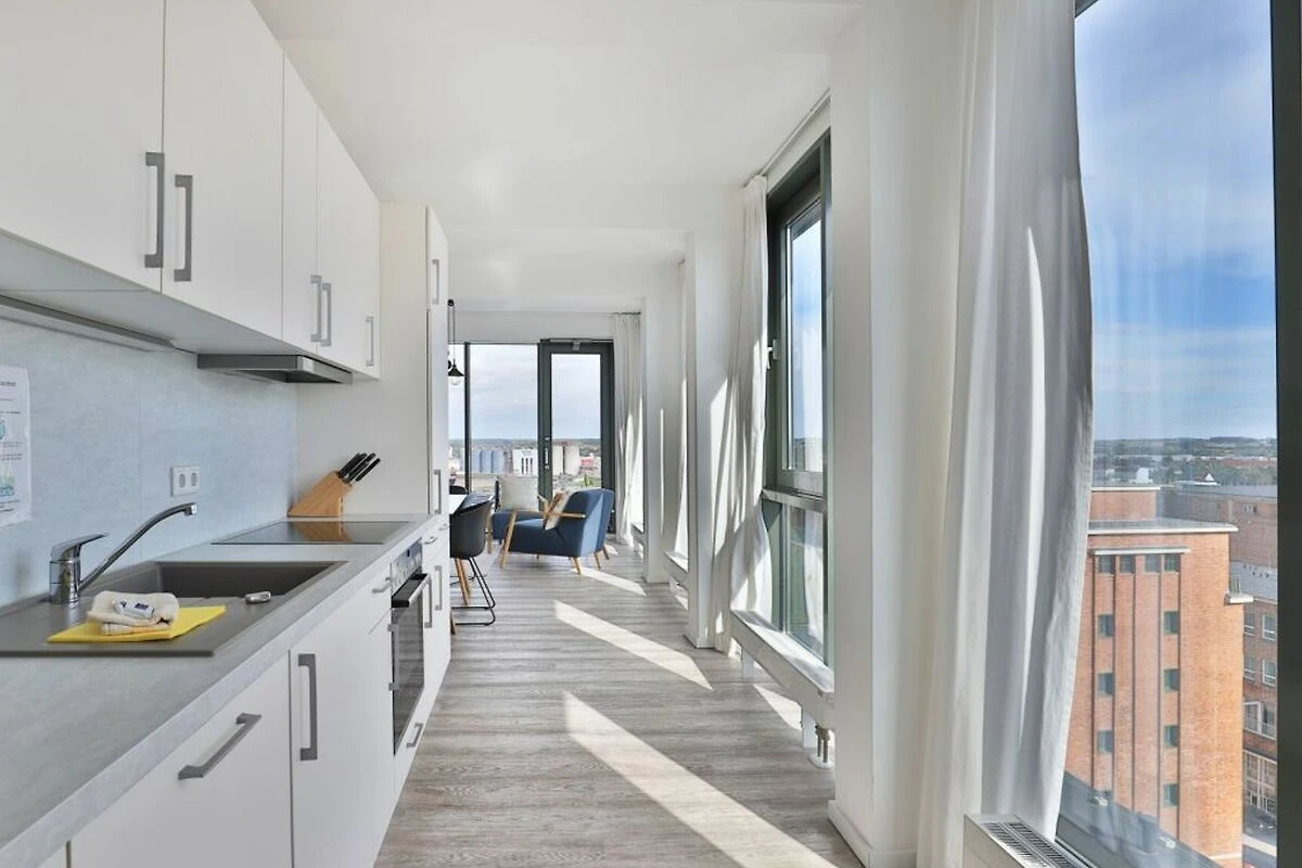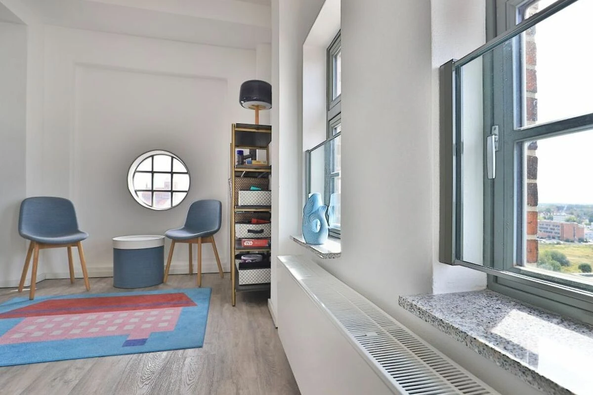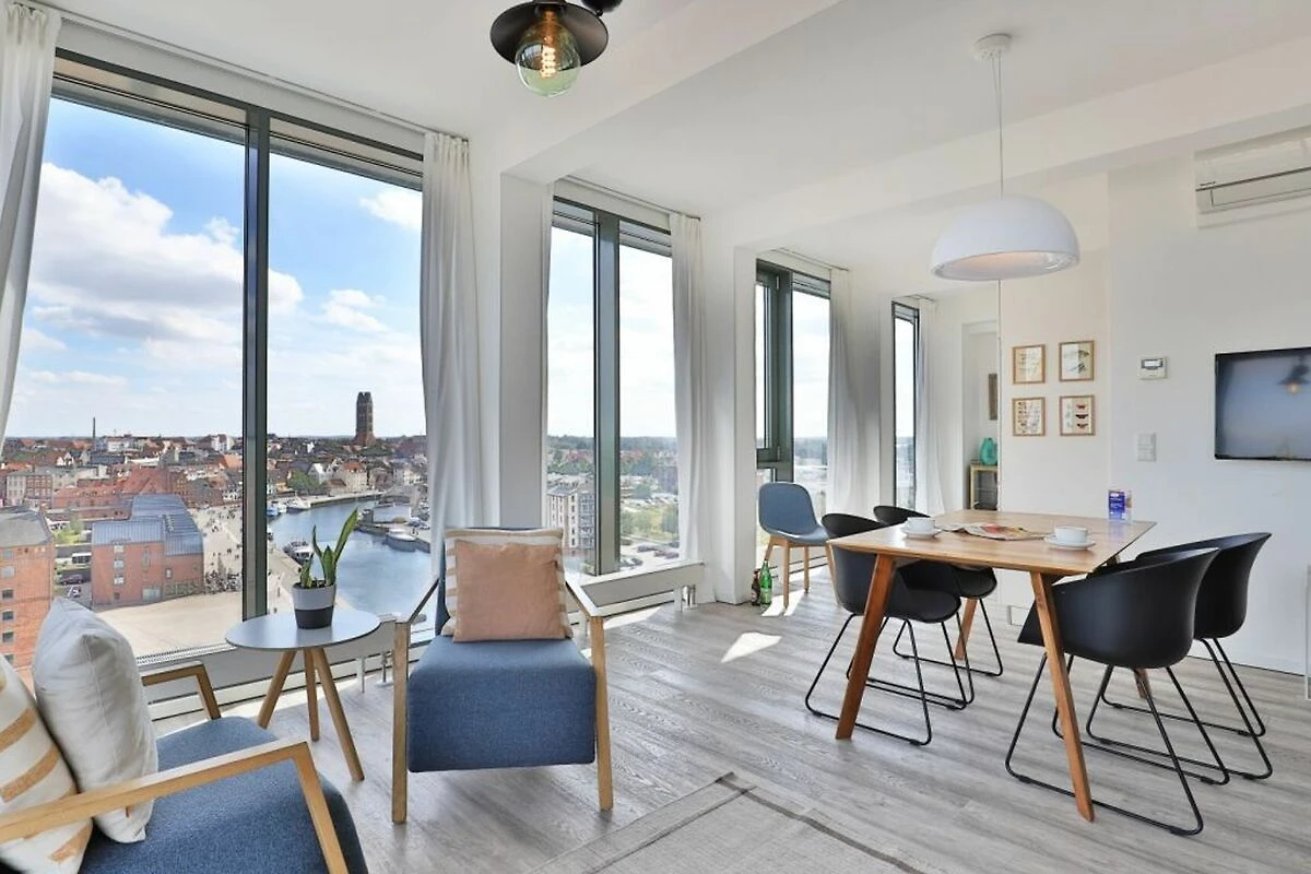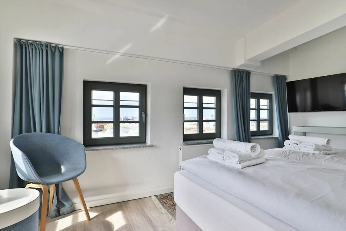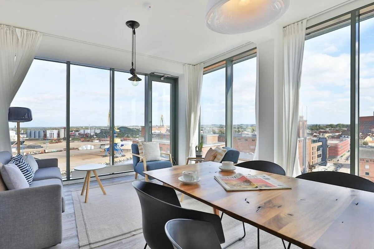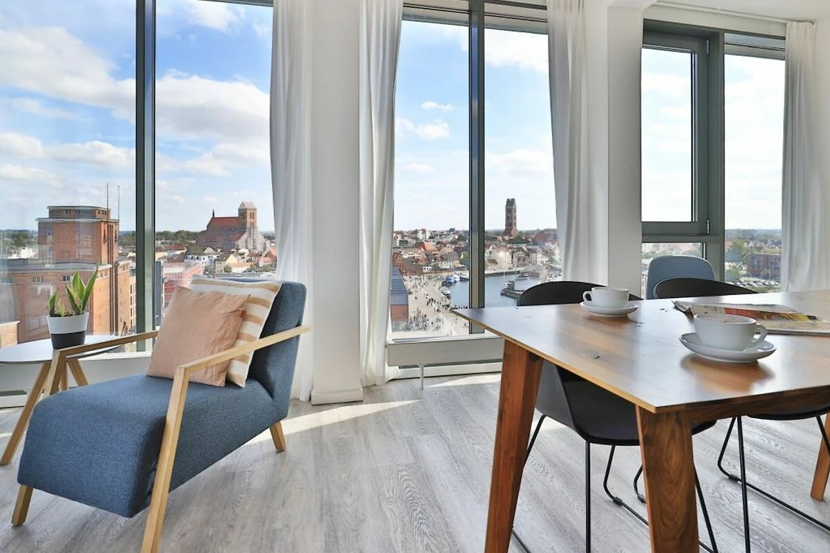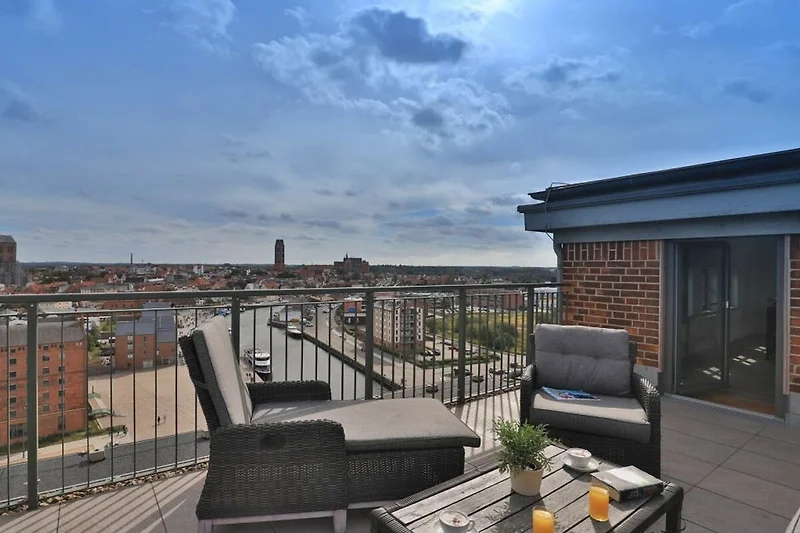 Hier residieren Sie ganz oben in der 9. und 10. Etage in einem der exklusivsten Gebäude am Wismarer Hafen. Das geschmackvoll eingerichtete 3- Zimmer-Appartement ist über den Lift leicht zu erreichen. Hier können bis zu 6 Personen auf 115 m² einen traumhaften Urlaub verbringen.