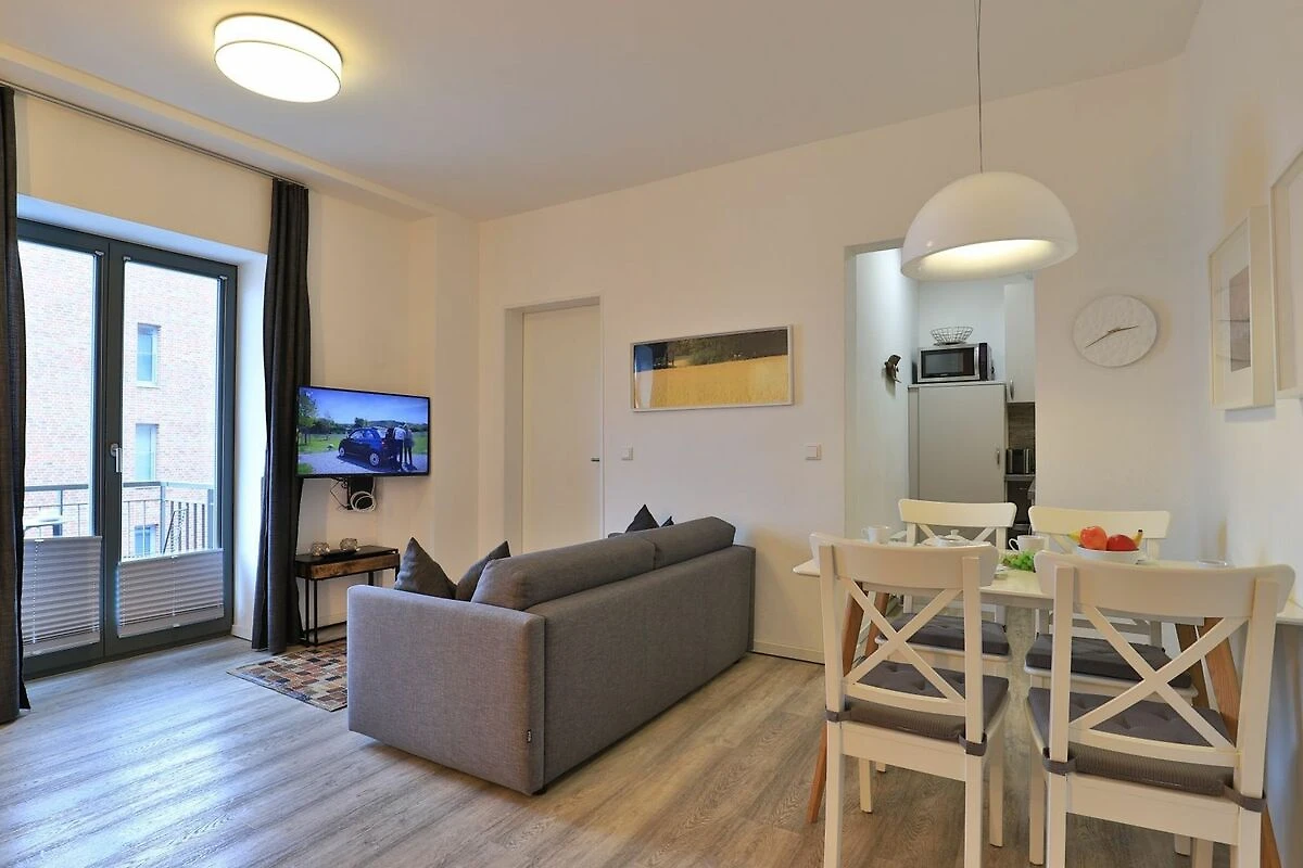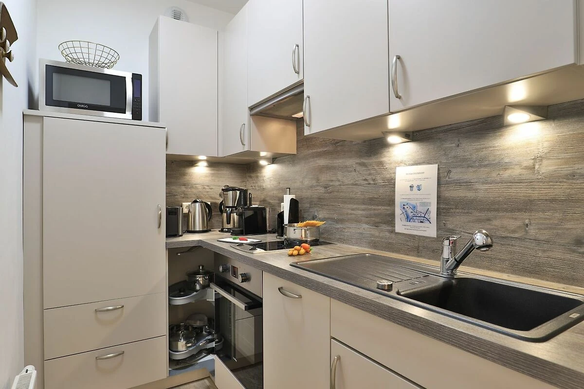 Appartementhaus mit 48 Appartements. Das hochwertig ausgestattete 3-Zimmer-Appartement befindet sich in der 2.Etage des Gebäudes. In dem Appartement können auf 63 m² bis zu 6 Personen einen traumhaften Urlaub verbringen. Das komfortable Wohnzimmer mit Fernseher und integrierter Küche lädt zum Verweilen ein. Die 2 separaten Schlafzimmer bieten für 4 Personen erholsame Nächte. Des Weiteren verfügt das stilvolle Appartement über ein Duschbad und eine Sauna. Bei Anreise sind 2 Betten bezogen und Handtücher liegen für Sie bereit. WLAN steht Ihnen kostenfrei zur Verfügung. In unmittelbarer Nähe sind öffentliche Parkplätze vorhanden.