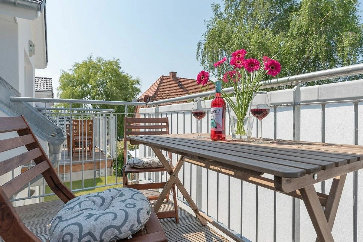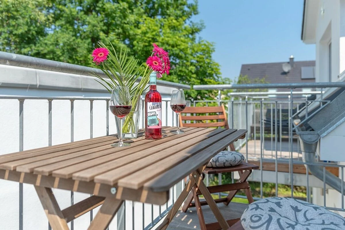 Vom Wohnbereich aus gelangen Sie zu dem Balkon, dessen zwei grosse Flügeltüren grosszügig geöffnet werden können, um den Raum mit frischer Küstenluft zu füllen. Der Balkon ist mit Tisch und Stühlen samt Sitzauflagen ausgestattet. Ausserdem gbefindet sich dort ein aufklappbarer Wäschetrockner zum Trocknen der Schwimmutensilien.