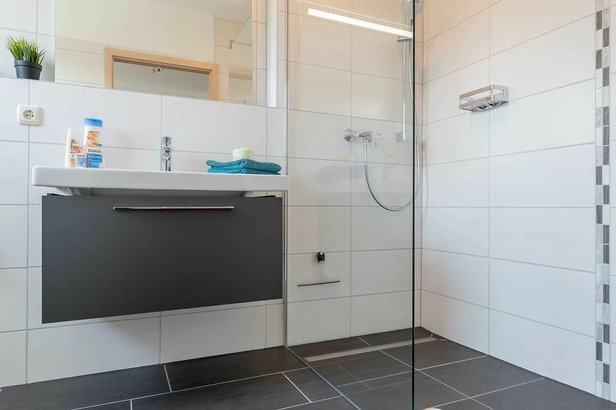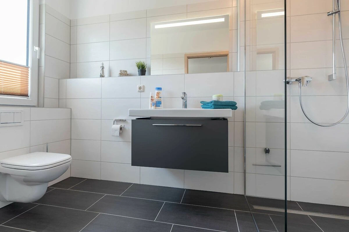 Das moderne Badezimmer mit grossem Fenster ist elegant gefliest mit ebenerdiger Dusche und verfügt über einen Waschtisch mit grossen Spiegel.