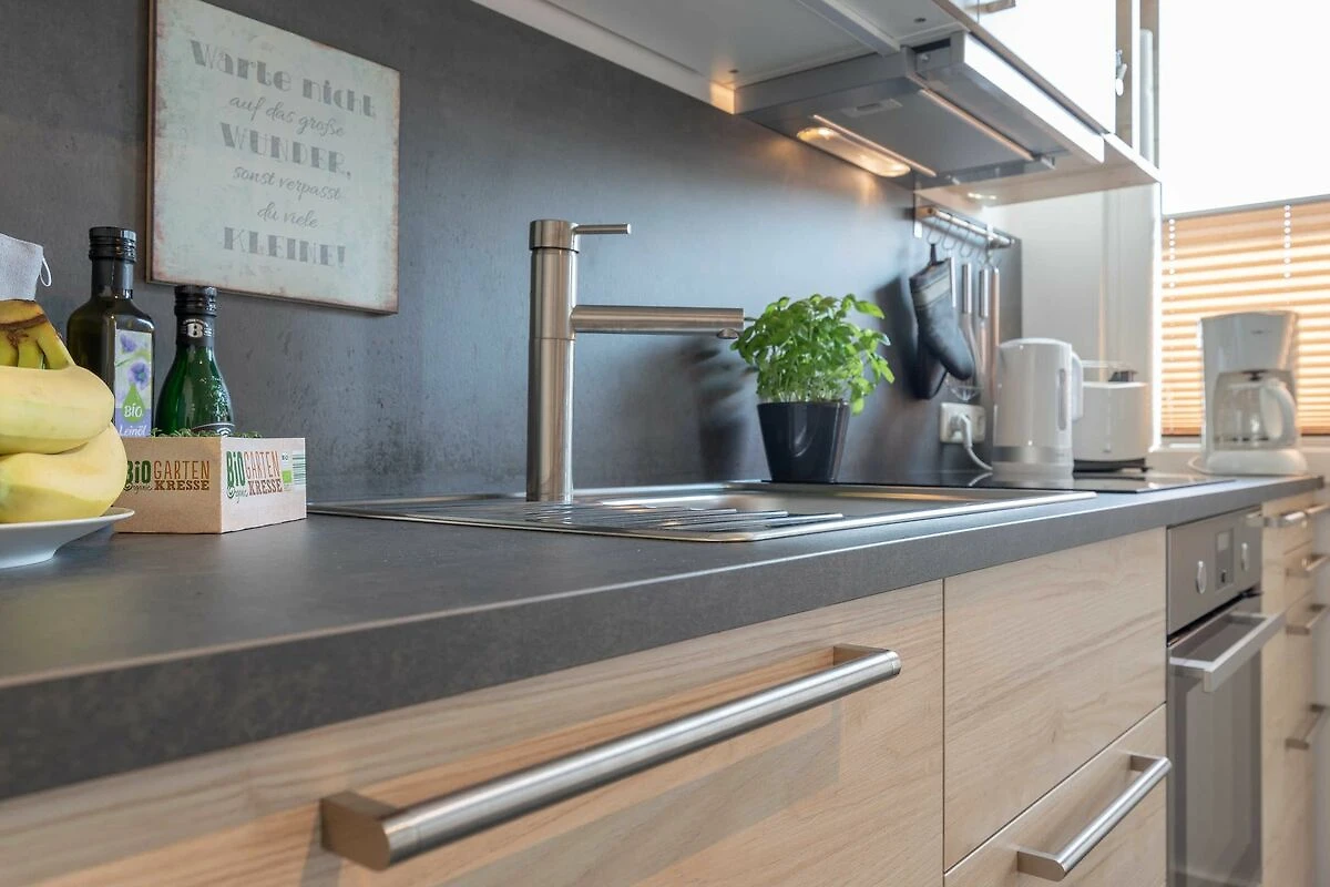 Der offene Wohn- und Essbereich ist ausgestattet mit einer modernen Einbauküche sowie diversen Küchengeräten wie Toaster, Eierkocher, Kaffeemaschine, Wasserkocher, Mikrowelle, Cerankochfeld und Backofen. So lässt es sich frisch gestärkt in ein neues Abenteuer starten. Der grosse Kühlschrank sorgt vor allem an heissen Tagen für ausreichend kalte Getränke. Im Küchenbereich runden ein grosser Tisch zum Ausziehen und vier Stühle das moderne Design ab.