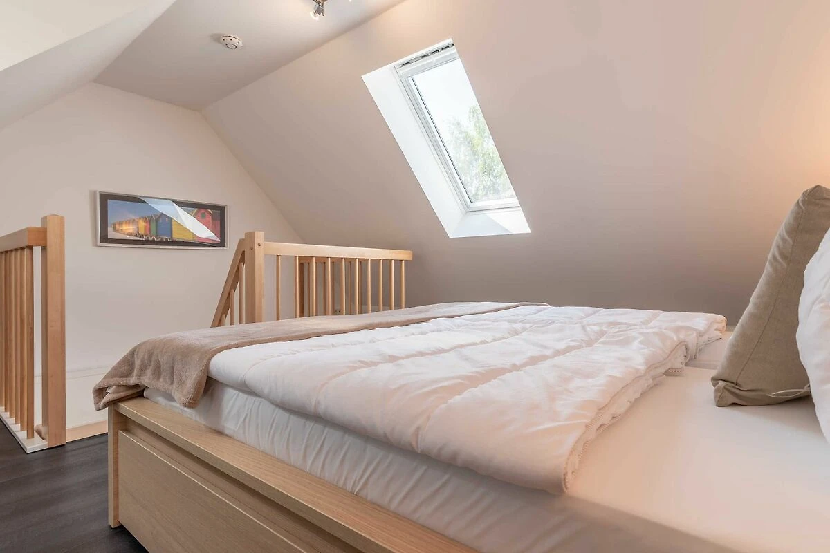 Über eine Treppe im Wohnbereich gelangt man in den Schlafbereich. Hier empfängen Sie ein Doppelbett (180 x 200 cm) mit integriertem Bettkasten (mitgetrennten Matratzen) und zwei Nachttischen. Zwei grosse Dachfenster ermöglichen ein gutes Durchlüften des Schlafzimmers. Die Fenster sind mit Spezialrollos ausgestattet, welche das Aufheizen des Raumes verhindern und den Raum sehr gut verdunkeln. Ein dritter Schlafplatz befindet sich im Wohnzimmer auf der grossen Eckcouch. Hier ist es möglich, einen grossen Hocker beizustellen, um eine geräumige Liegefläche zu schaffen. Der Schlafplatz eignet sich für eine Person bis ca. 16 Jahre.