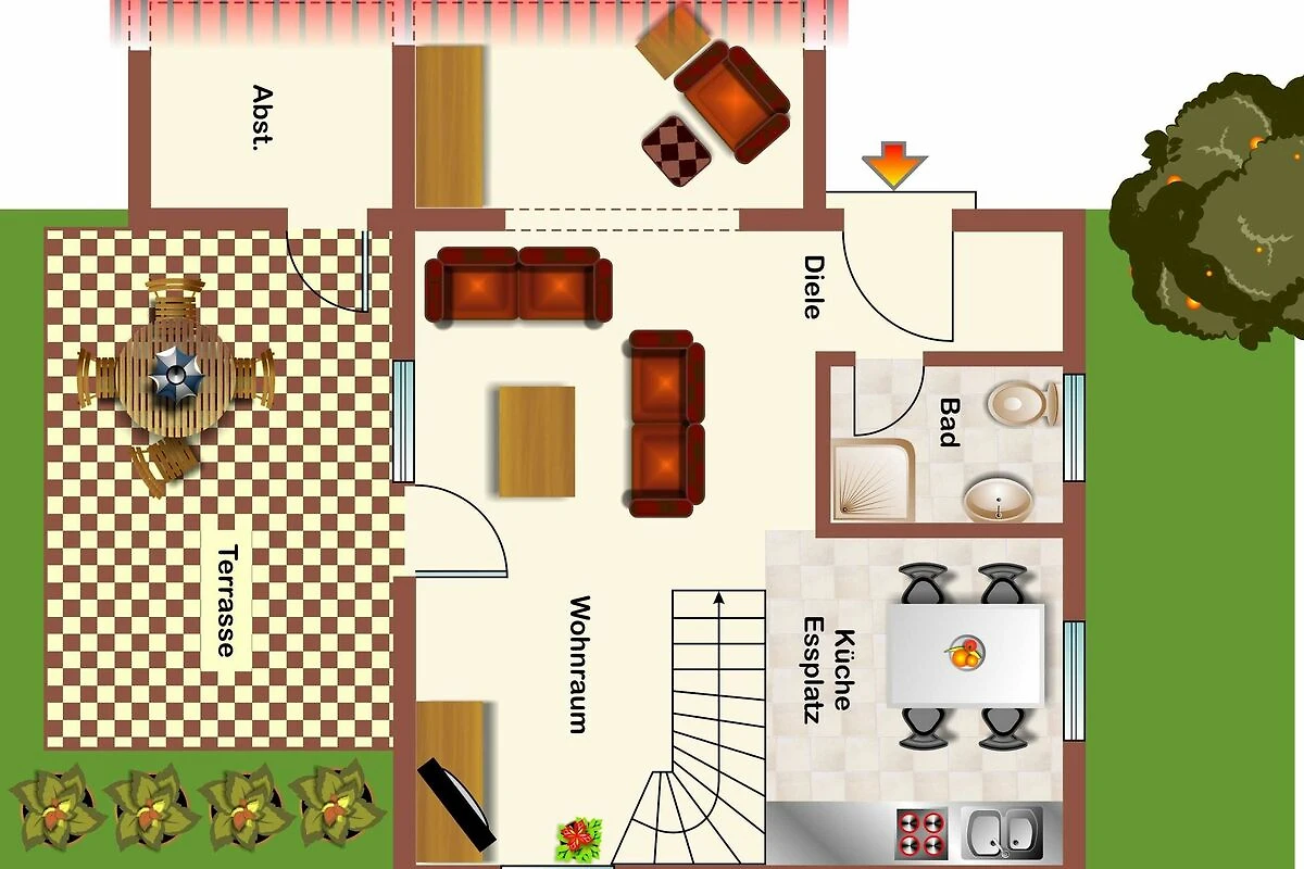 Die massiv errichteten Ferienhäuser vom Typ Scout 60 verfügen über ca. 60 m² Wohn-/Nutzfläche auf 2 Etagen und können mit bis zu 5 Personen (+ 1 Kleinkind im Kinderreisebett) belegt werden. Im Erdgeschoss befindet sich das Badezimmer (Dusche/WC), das Wohnzimmer (mit Schlafgelegenheit) mit angrenzender offener Küche mit Essplatz (Ceran-Kochfeld/Backofen - Kühlschrank/Gefrierfach, Mikrowelle und Spülmaschine). Zugang zur möblierten Terrasse vom Wohnzimmer. Über die offene Treppe im Wohnbereich gelangt man zu den beiden Schlafräumen im Obergeschoss (ein Schlafraum mit einem Doppelbett und ein Schafraum mit zwei Einzelbetten). Als Abstellmöglichkeit stehen entweder ein aussenliegender Abstellraum oder ein Gartenhäuschen zur Verfügung. Nichtraucherhäuser - kostenloses WLAN - Haustiere erlaubt - Brötchenservice von Ostern bis Oktober!