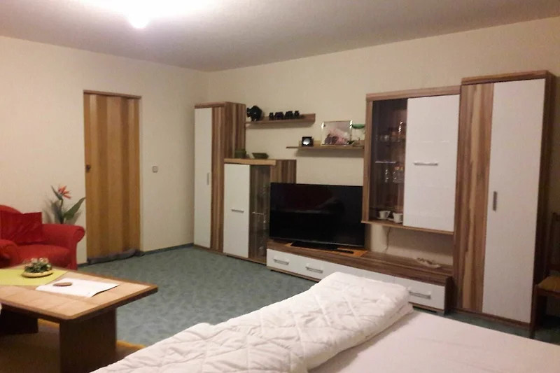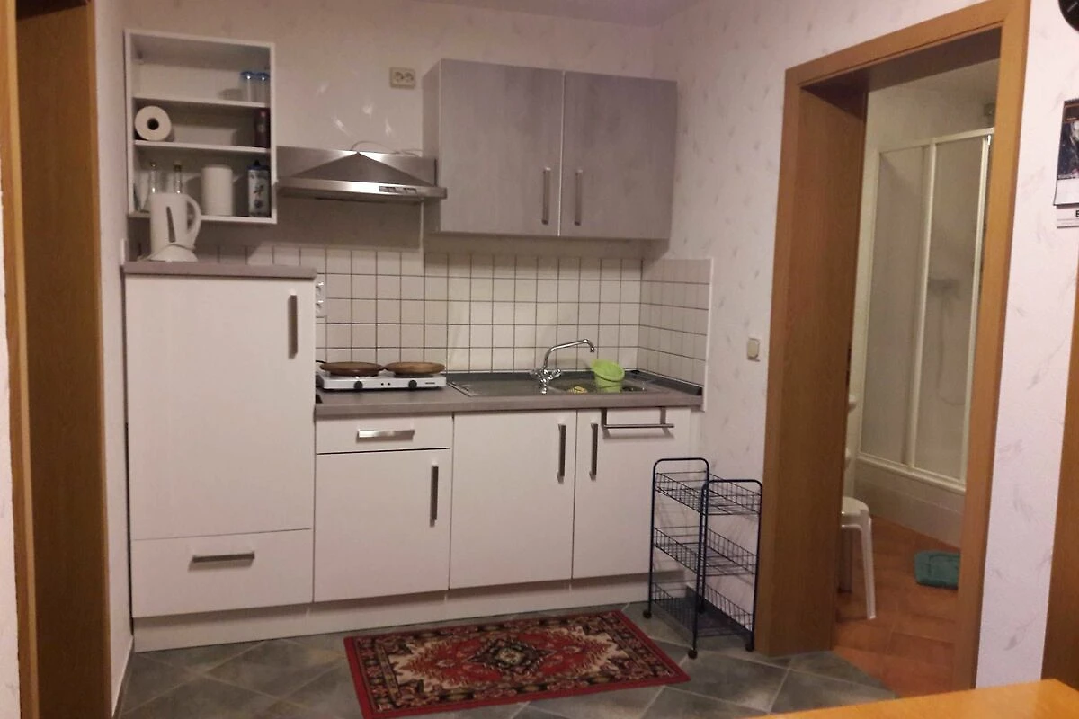 Die Ferienwohnung verfügt über einen Wohn-, und einen Schlafraum und ein Bad mit Dusche. Die voll ausgestattete Küche hat eine Küchenzeile mit Kühlschrank, Plattenkocher und einen Minibackofen.