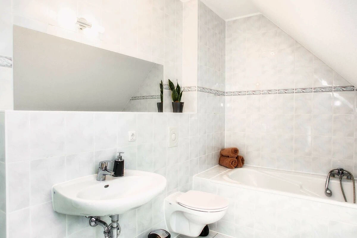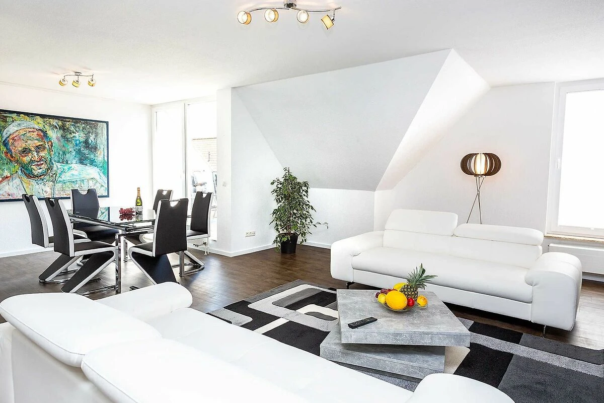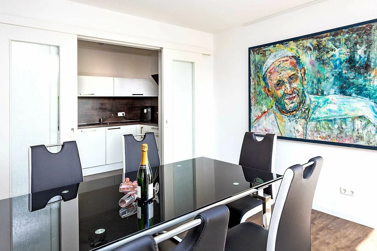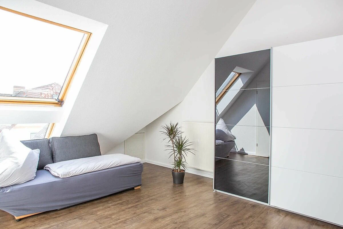 Die im Flur befindliche Treppe lässt viel Licht in den Raum und bietet den Zugang zur oberen Etage. Auf dieser Ebene findet man das zweite Schlafzimmer und ein Wannenbad mit Blick in den Himmel. In beiden Schlafzimmern ist das 5* Boxspringbett Standard. Aber auch die Aufbettungsmöglichkeit im Studio sowie in dem Wohnzimmer sind qualitativ sehr hochwertig. Rundum eine Wohnung, in der man gerne selbst wohnt.