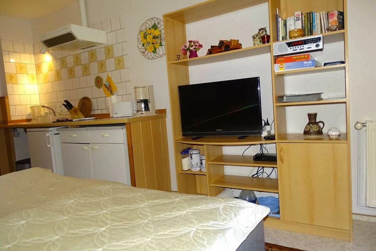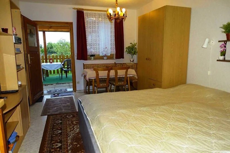 Auf 25 m² befindet sich der kombinierte Wohn- und Schlafbereich mit Doppelbett, Flat-TV, Essecke, Kleiderschrank und einem kleinen Küchenbereich mit 2 Platten-Herd, Kühlschrank, Kaffeemaschine, Toaster und Wasserkocher. Das Bad ist mit Dusche/WC und Haartrockner ausgestattet. Vor der Wohnung befindet sich eine kleine Terrasse. Die Wohnung ist für zwei Personen geeignet. Die Erstausstattung Bettwäsche und Handtücher ist bereits im Preis inklusive. Ein Parkplatz steht Ihnen kostenfrei zur Verfügung. Das W-LAN können Sie ebenfalls kostenfrei nutzen.