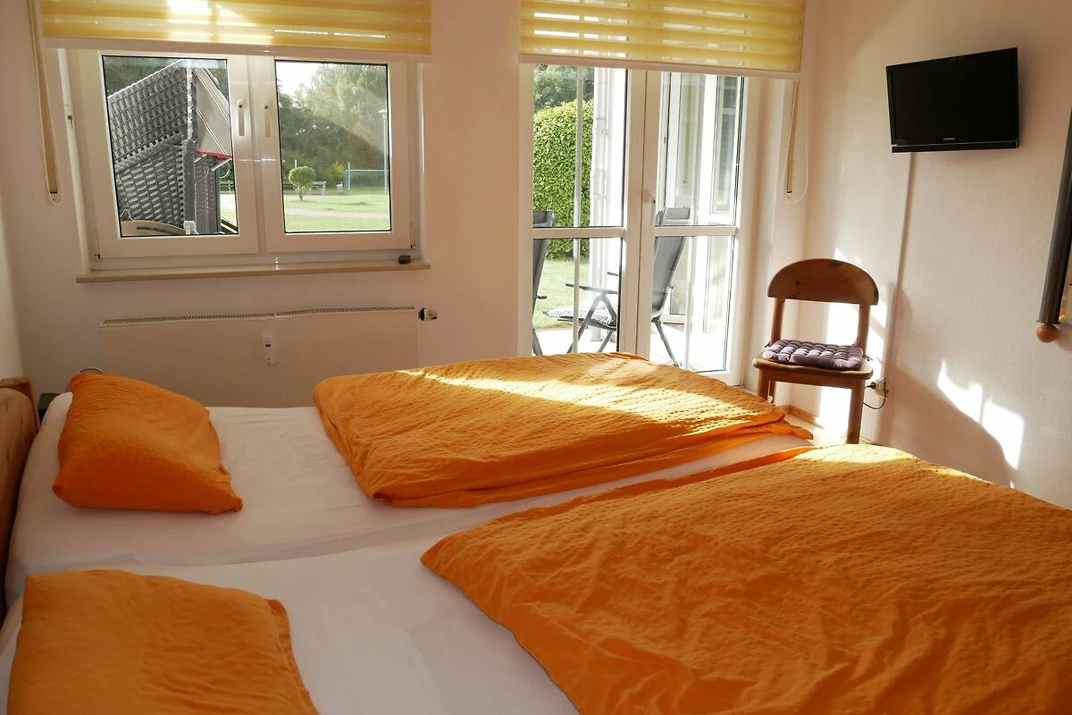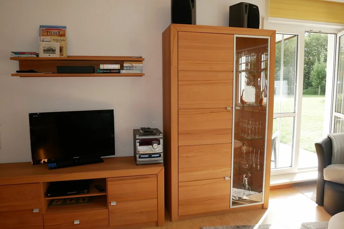 Der grosszügige Wohn- Küchenbereich ist mit einer Couch, TV- Flachbild, DVD-Player, Radio, Esstisch und einer voll ausgestatteten Küchenzeile mit Spülmaschine, Induktionsherd, Kühlschrank mit Gefriermöglichkeit, Backofen mit integrierter Mikrowelle, Kaffeemaschine, Wasserkocher und Toaster ausgestattet. Vom Wohnzimmer sowie vom Schlafzimmer aus gelangen Sie auf die möblierte Terrasse zur Südseite. Das Schlafzimmer verfügt über ein Doppelbett und einen Kleiderschrank für Ihre Urlaubsgarderobe. Das Badezimmer ist mit Dusche, WC und Waschtisch ausgestattet.
