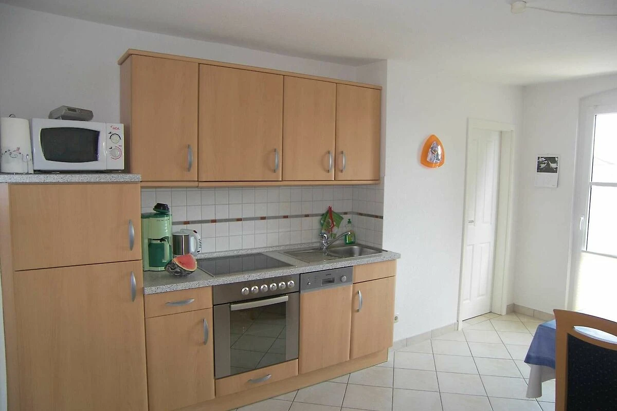 - eine offene Wohnküche mit Backofen, Herd, Mikrowelle, Spülmaschine, Kühlschrank und Kaffeemaschine