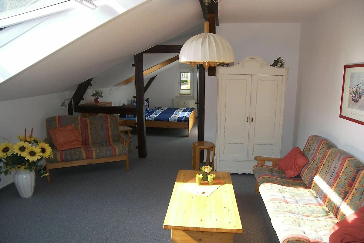 - ein kombiniertes Wohn- und Schlafzimmer mit gemütlichem Doppelbett, bequemer Couchgarnitur, freigelegten Holzbalken und charmanten Dachschrägen