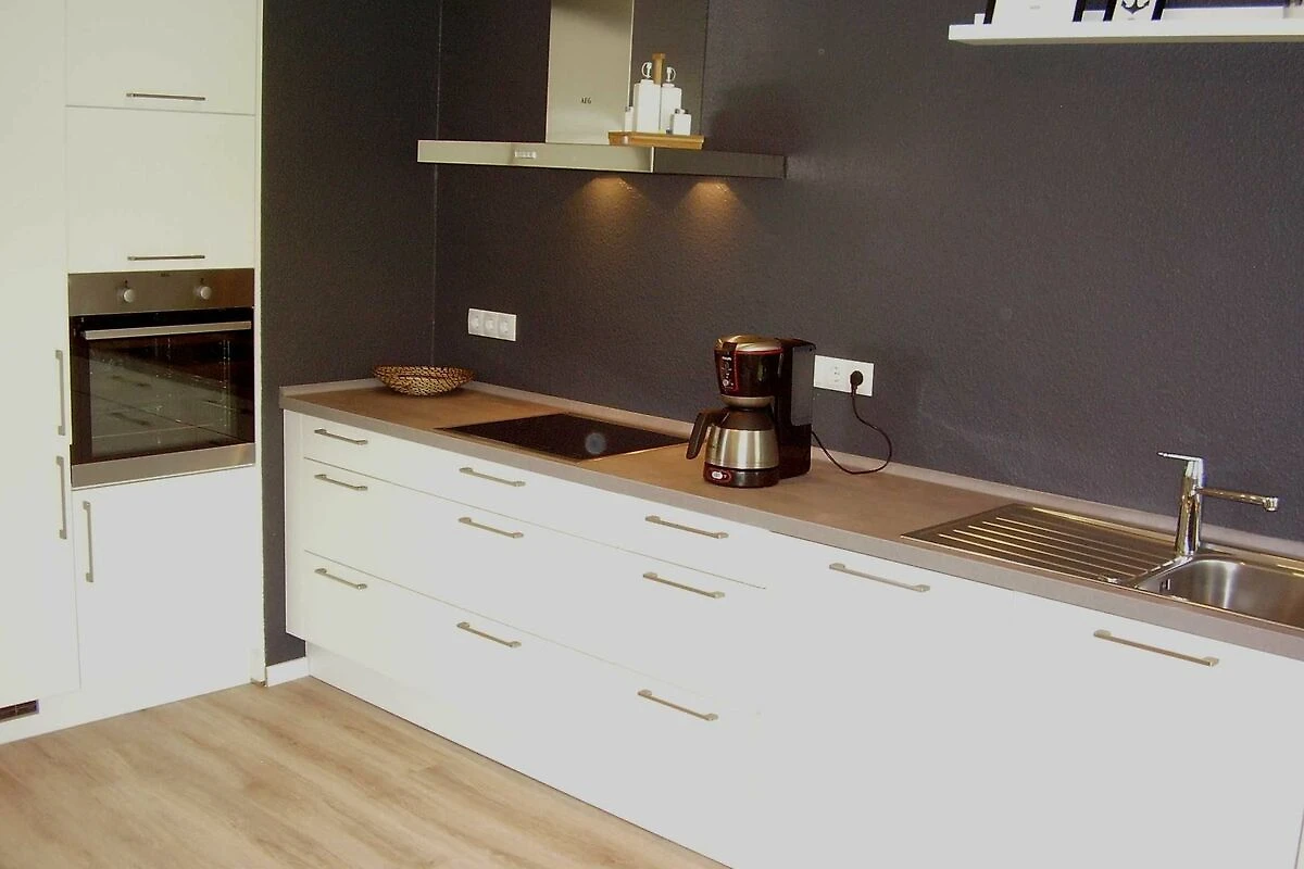 Moderne Einbauküche, die mit E-Herd mit Ceranfeld, Backofen auf Griffhöhe, grossem Kühlschrank mit Gefrierfach, Geschirrspüler, Mikrowelle, Wasserkocher, Kaffeemaschine, sonstigen erforderlichen Elektrogeräten und natürlich mit ausreichend Gläsern, Geschirr und Küchenausstattung ausgestattet ist.