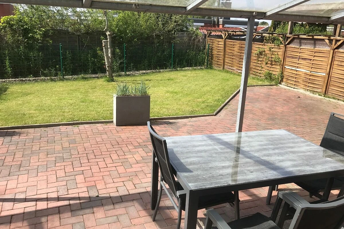 Komplett eingezäunter Garten mit überdachter Terrasse mit ausreichend Gartenmöbeln.