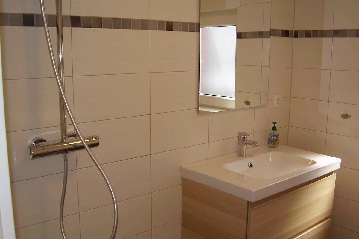 Tageslicht Badezimmer mit ebenerdiger Dusche und WC.