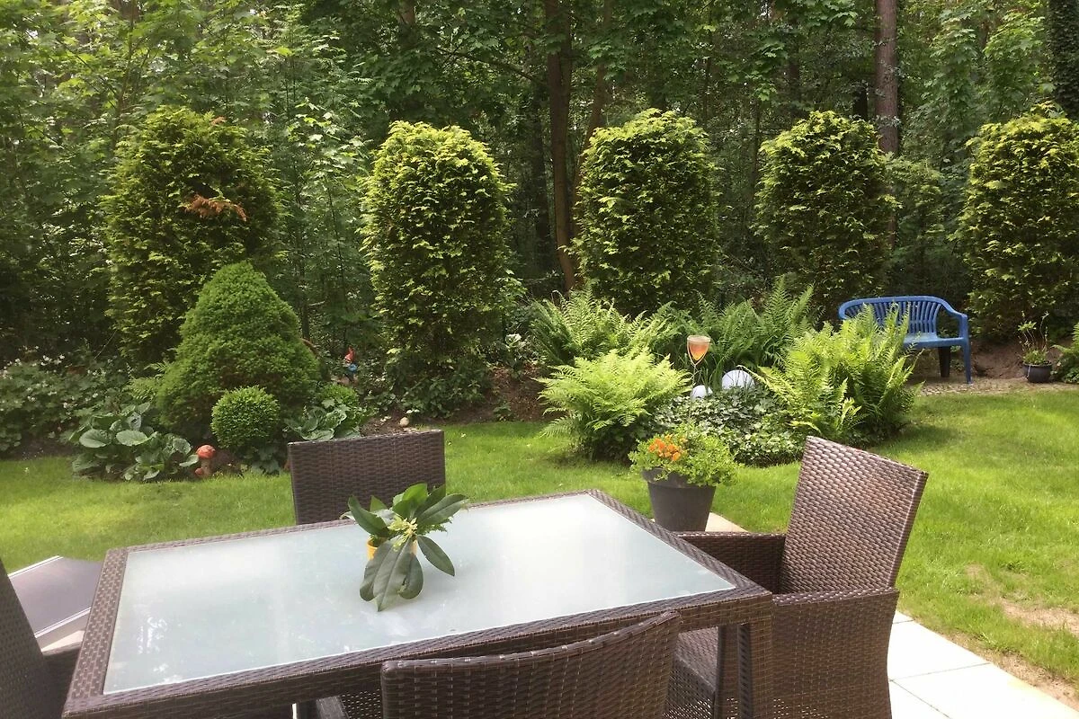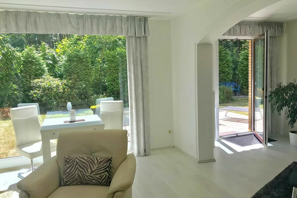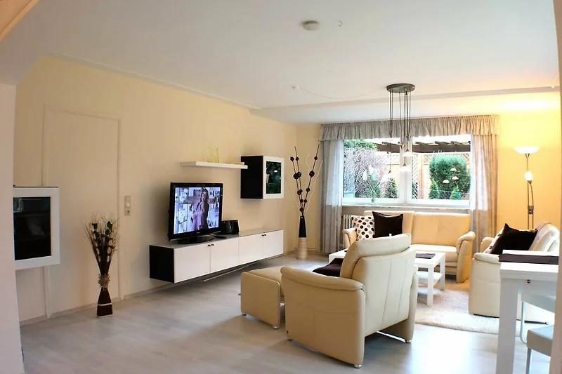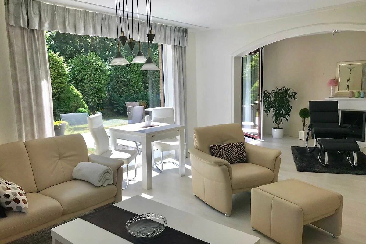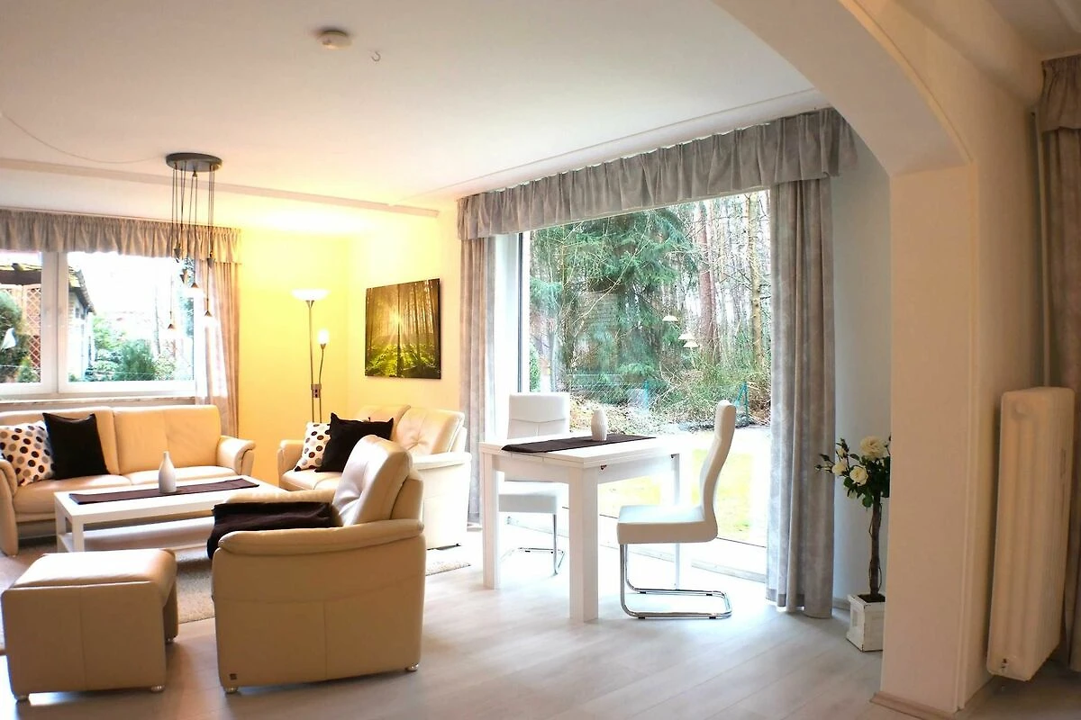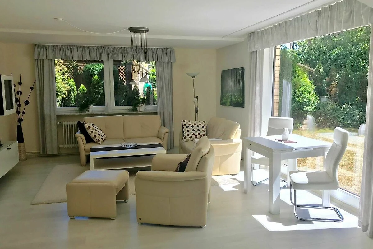 3-Zimmer Ferienwohnung (110 qm) im Haus Heidelerche in Bad Bevensen! Wir nennen diese Wohnung auch: Das Bonbon! Sämtliche Zimmer sind sehr geräumig und mit weissem Laminat ausgelegt.Das grosse Wohnzimmer ist noch einmal mit einem dekorativen Rundbogen aufgeteilt. Vom vorderen Teil des Raumes geht es durch die Terrassentür auf die Terrasse in den Garten. Die grossen Fenster lassen den Raum sehr schön hell erscheinen. Am Fenster steht ein kleiner Tisch als würde man schon im Garten sitzen - lassen sich Vögel und Eichhörnchen, die von dem kleinen Biotop angezogen werden, sehr gut beobachten. Eine grosse Sitzgarnitur lädt zum Entspannen ein. Der Flachbild-TV steht gegenüberliegend im Schrank. Ein Safe ist ebenfalls vorhanden. In einem weissen Schrank im vorderen Teil des Raumes ist noch ein fünftes Bett integriert. Eine grosse moderne Küche mit Blick in den Garten und Geschirr für mind. 10 Personen. Dazu gehören Geschirrspüler, Mikrowelle, Gefrierschrank, Backofen, Kaffeemaschine, Toaster und Wasserkocher. Ein grosser Esstisch steht in der Mitte des Raumes. Zwei geräumige Schlafzimmer mit Doppelbetten und sehr guten Matratzen (getrennt), Kleiderschrank Wäscheschrank und einer 2er Sitzgelegenheit. In dem anderen steht ein abschliessbarer Schreibtisch mit Stühlen und einem Sessel. Ein Badezimmer mit Dusche, Badewanne und WC und Sitzhocker, ausserdem mit einem Spiegelschrank, Fön, Kosmetiktüchern und kleinen Seifenpaketen ausgestattet. Bademäntel gern auf Anfrage.