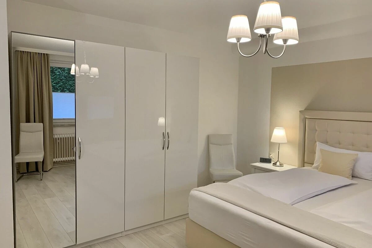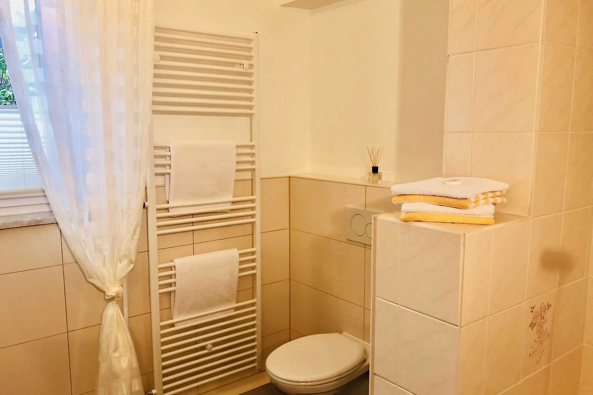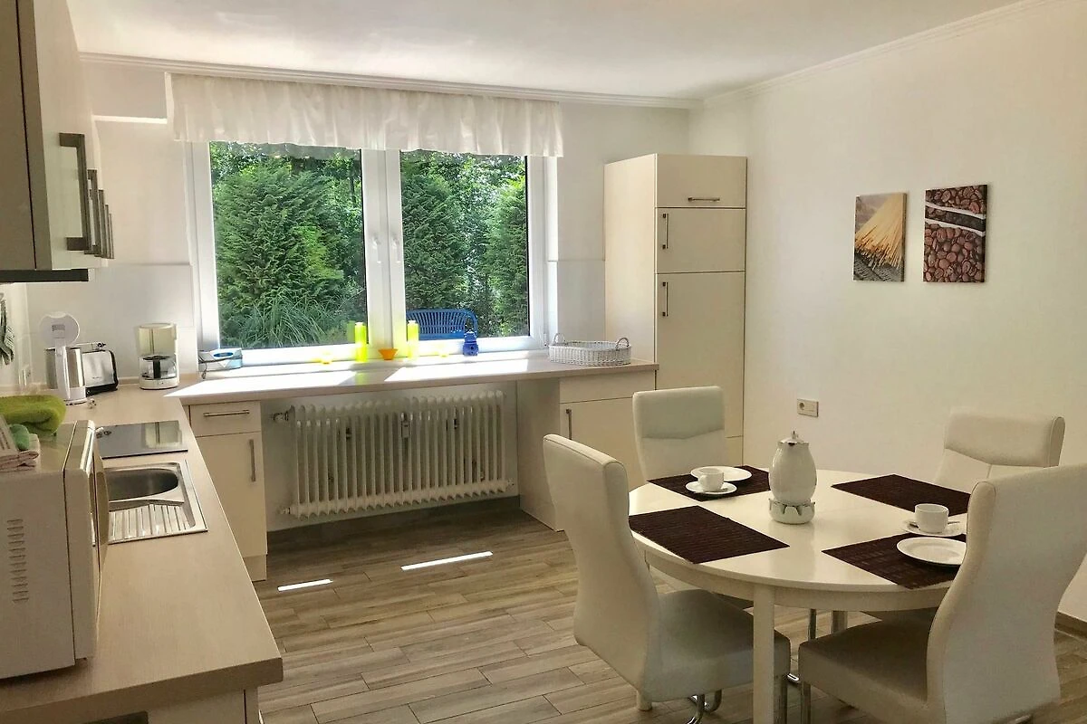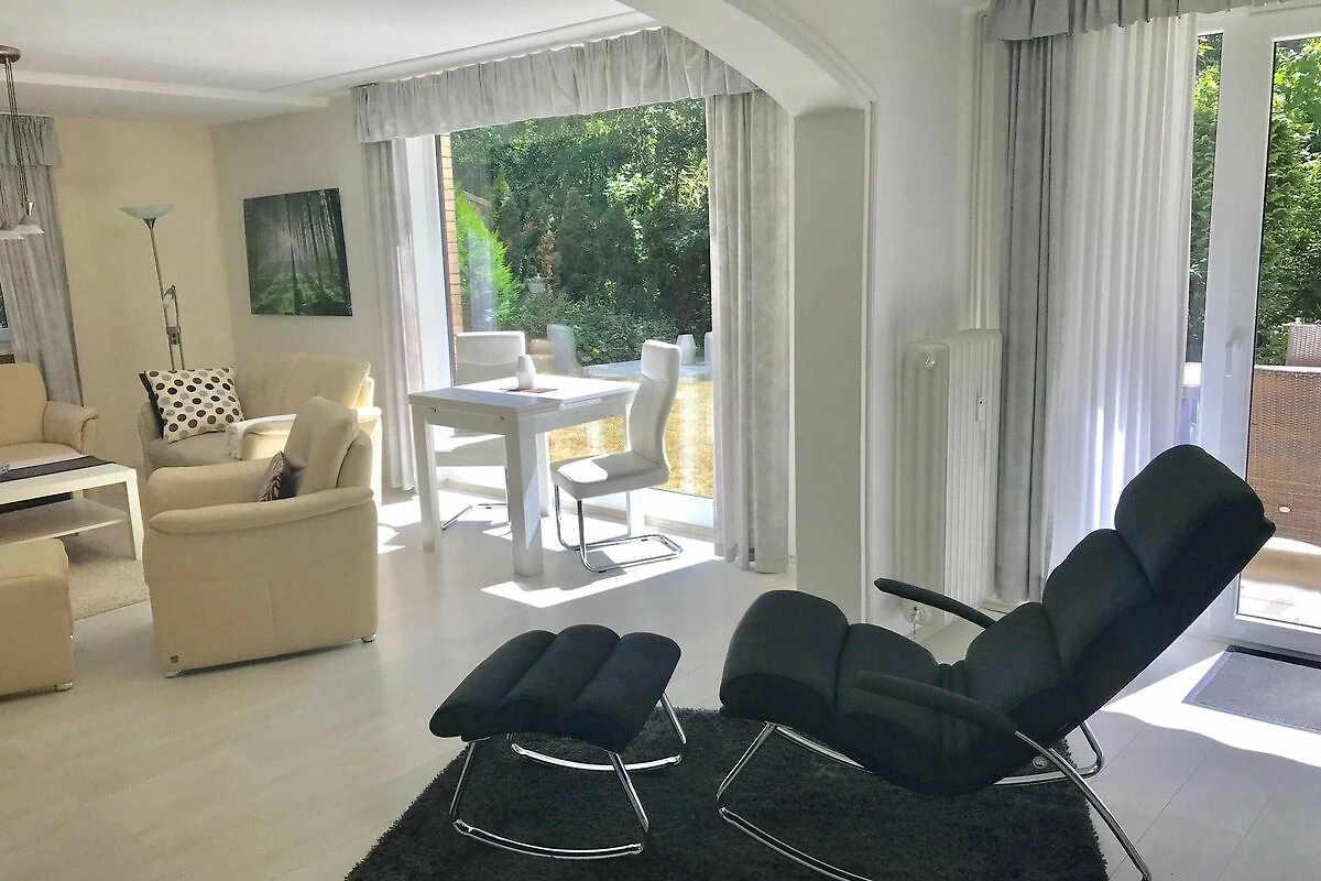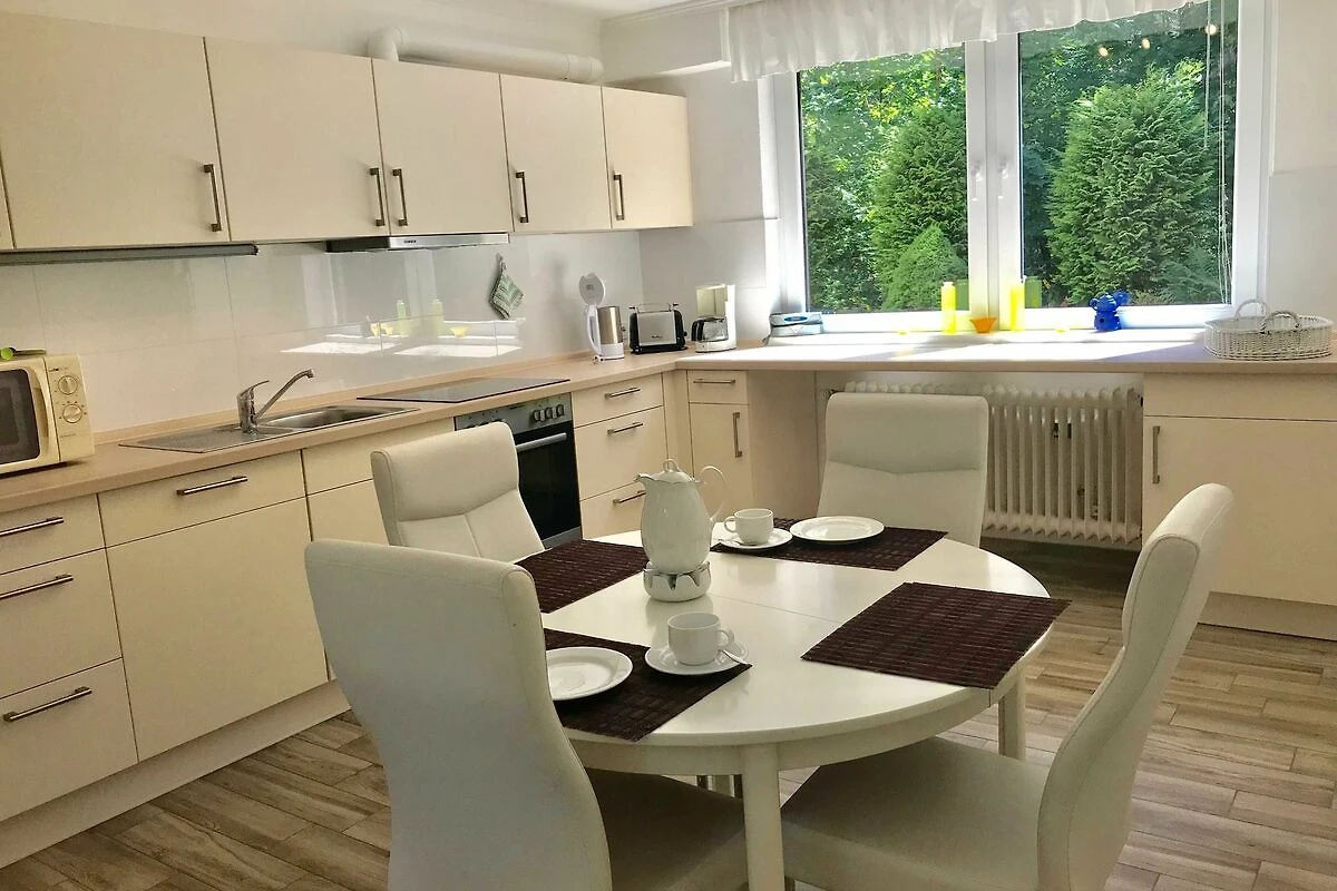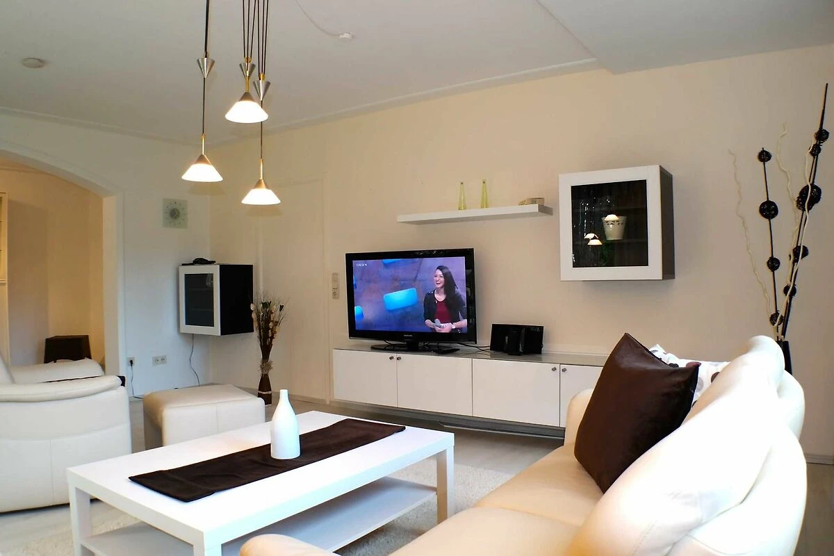 3-Zimmer Ferienwohnung (110 qm) im Haus Heidelerche in Bad Bevensen! Wir nennen diese Wohnung auch: Das Bonbon! Sämtliche Zimmer sind sehr geräumig und mit weissem Laminat ausgelegt.Das grosse Wohnzimmer ist noch einmal mit einem dekorativen Rundbogen aufgeteilt. Vom vorderen Teil des Raumes geht es durch die Terrassentür auf die Terrasse in den Garten. Die grossen Fenster lassen den Raum sehr schön hell erscheinen. Am Fenster steht ein kleiner Tisch als würde man schon im Garten sitzen - lassen sich Vögel und Eichhörnchen, die von dem kleinen Biotop angezogen werden, sehr gut beobachten. Eine grosse Sitzgarnitur lädt zum Entspannen ein. Der Flachbild-TV steht gegenüberliegend im Schrank. Ein Safe ist ebenfalls vorhanden. In einem weissen Schrank im vorderen Teil des Raumes ist noch ein fünftes Bett integriert. Eine grosse moderne Küche mit Blick in den Garten und Geschirr für mind. 10 Personen. Dazu gehören Geschirrspüler, Mikrowelle, Gefrierschrank, Backofen, Kaffeemaschine, Toaster und Wasserkocher. Ein grosser Esstisch steht in der Mitte des Raumes. Zwei geräumige Schlafzimmer mit Doppelbetten und sehr guten Matratzen (getrennt), Kleiderschrank Wäscheschrank und einer 2er Sitzgelegenheit. In dem anderen steht ein abschliessbarer Schreibtisch mit Stühlen und einem Sessel. Ein Badezimmer mit Dusche, Badewanne und WC und Sitzhocker, ausserdem mit einem Spiegelschrank, Fön, Kosmetiktüchern und kleinen Seifenpaketen ausgestattet. Bademäntel gern auf Anfrage.