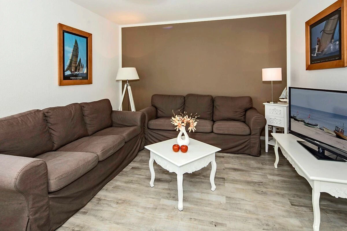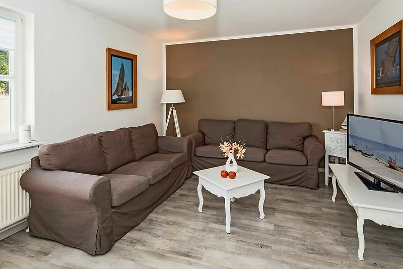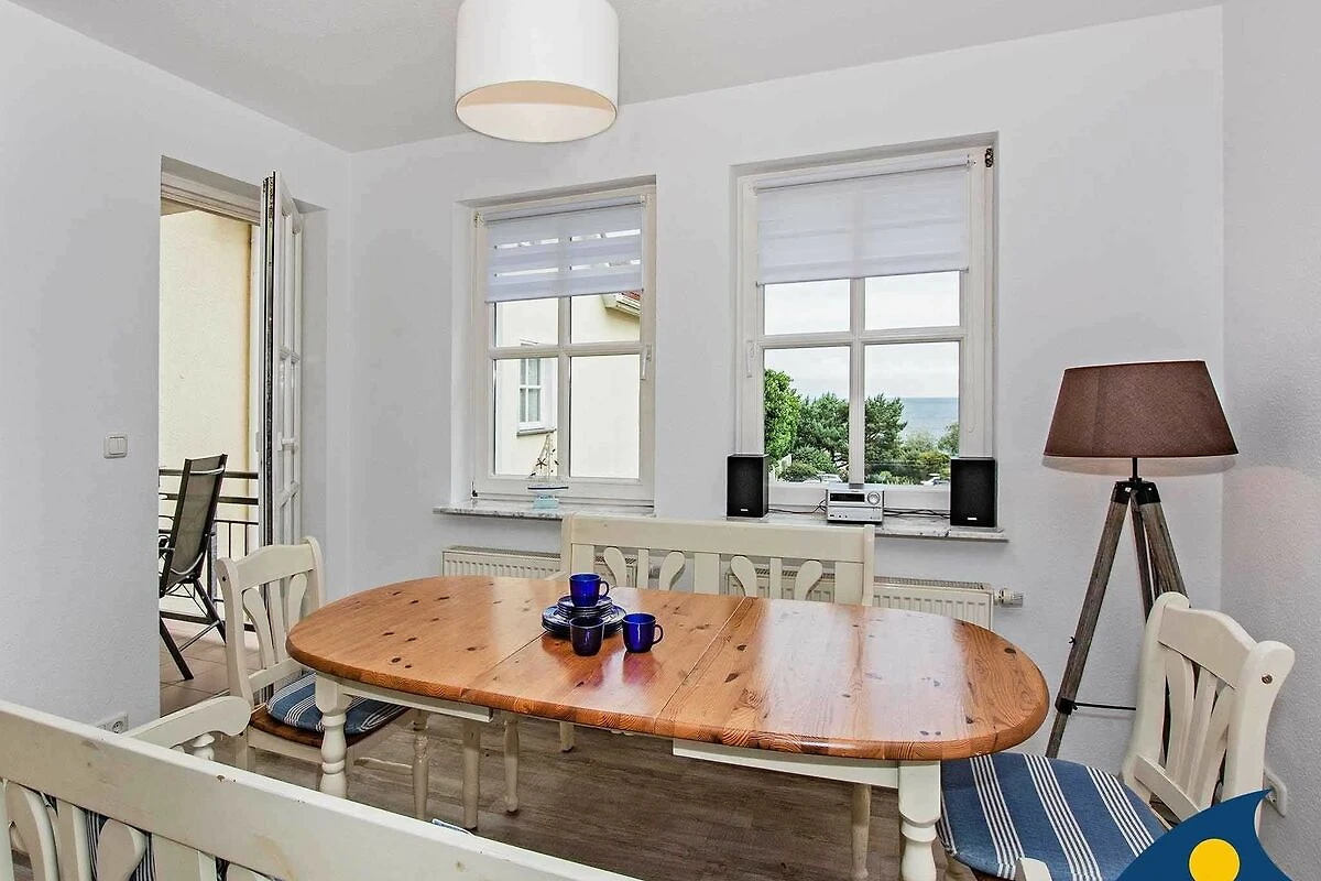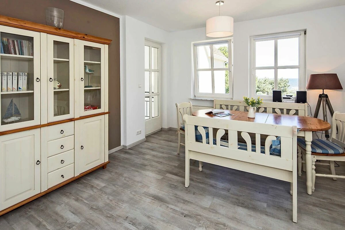 Das geräumige Wohnzimmer mit Meerblick lädt zu gemutlichen Fernseh- oder Spieleabenden ein. Der grosse Tisch am Fenster dient als Essplatz und wird auch gerne zum Schreiben der Urlaubsgrusse genutzt. Denn auch von hier geniessen Sie die schöne Aussicht auf die Ostsee.
