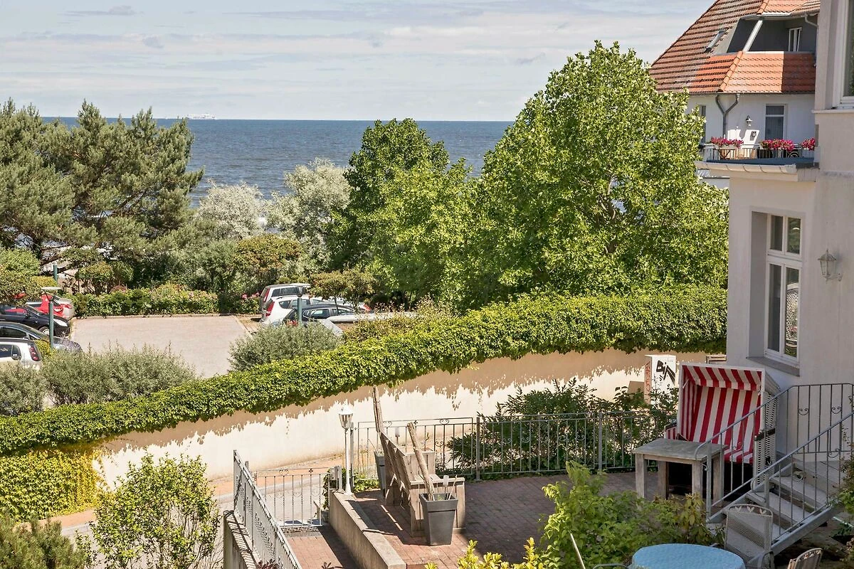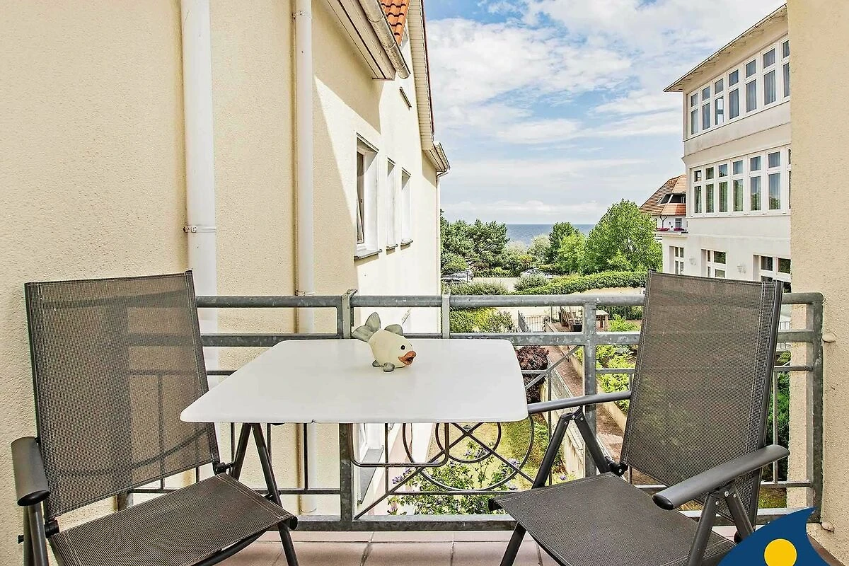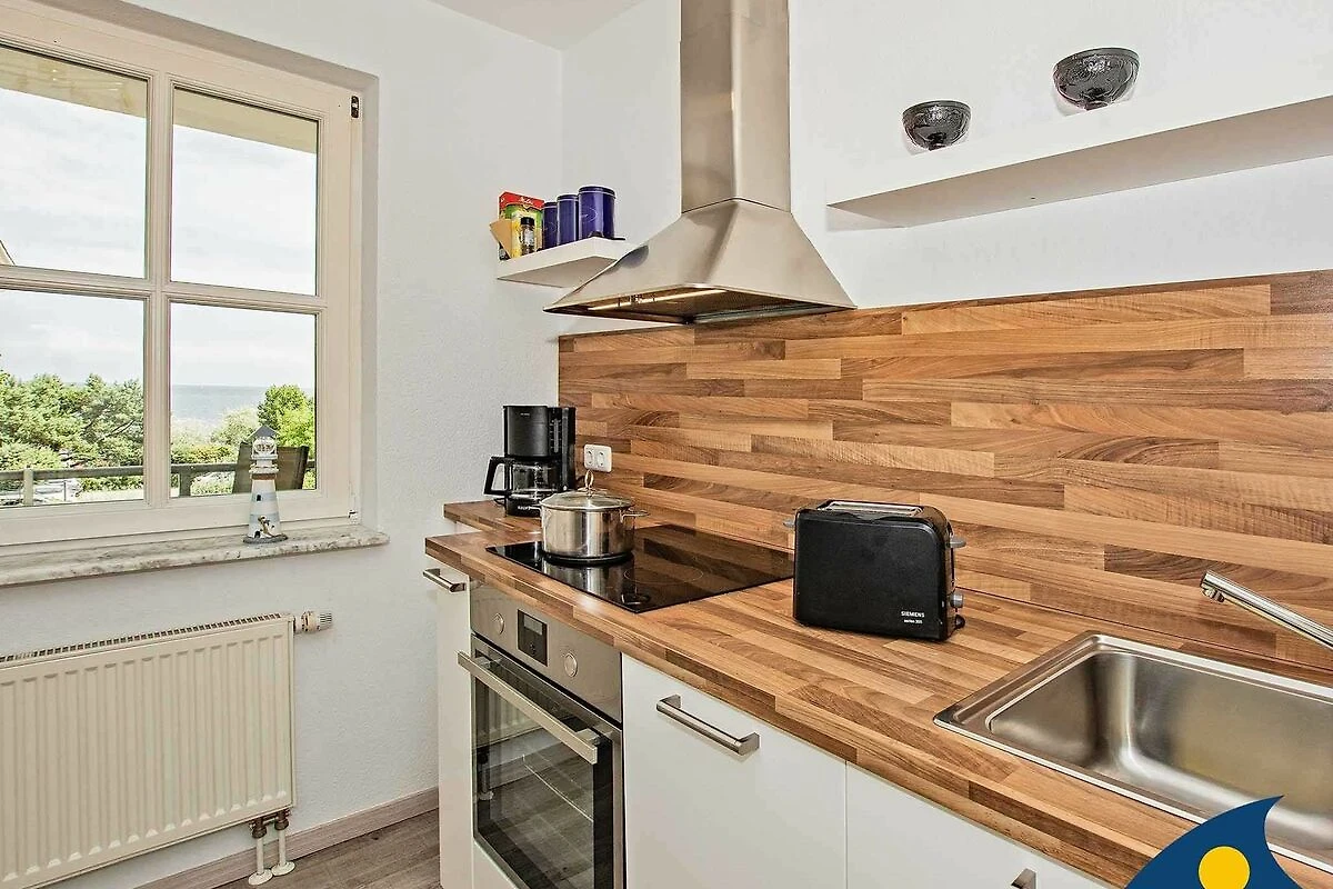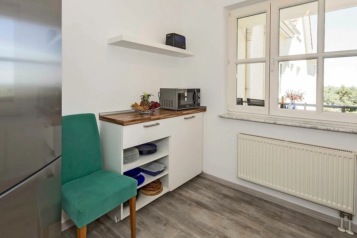 Das geräumige Wohnzimmer mit Meerblick lädt zu gemutlichen Fernseh- oder Spieleabenden ein. Der grosse Tisch am Fenster dient als Essplatz und wird auch gerne zum Schreiben der Urlaubsgrusse genutzt. Denn auch von hier geniessen Sie die schöne Aussicht auf die Ostsee.