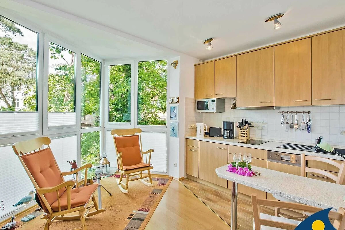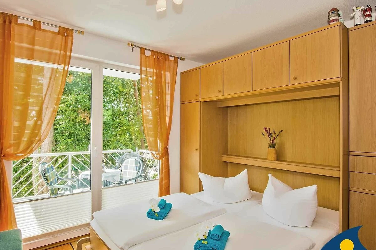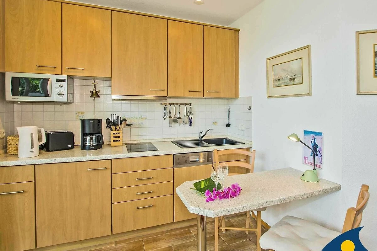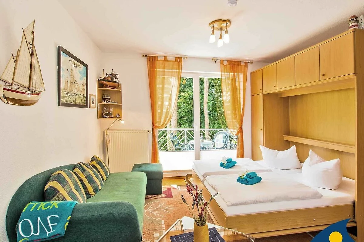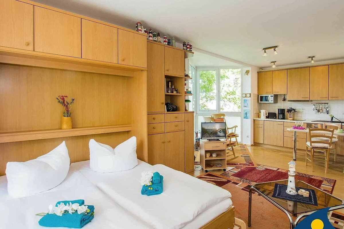 Dieses moderne, liebevolle und mit vielen maritimen Gegenständen eingerichtete Einraumappartement in der 3. Etage verfügt über ein komfortables Schrankbett mit Federkernmatratzen und eine sehr gut ausgestatteten Küchenzeile. In zwei Schaukelstühlen sitzend geniessen Sie aus dem Glaserker den Blick auf Meer und Strand. Vom Balkon aus reicht der Blick bis zum idyllisch gelegenen Schloonsee mit den vielen Wildenten, Schwänen und anderem Federvieh.