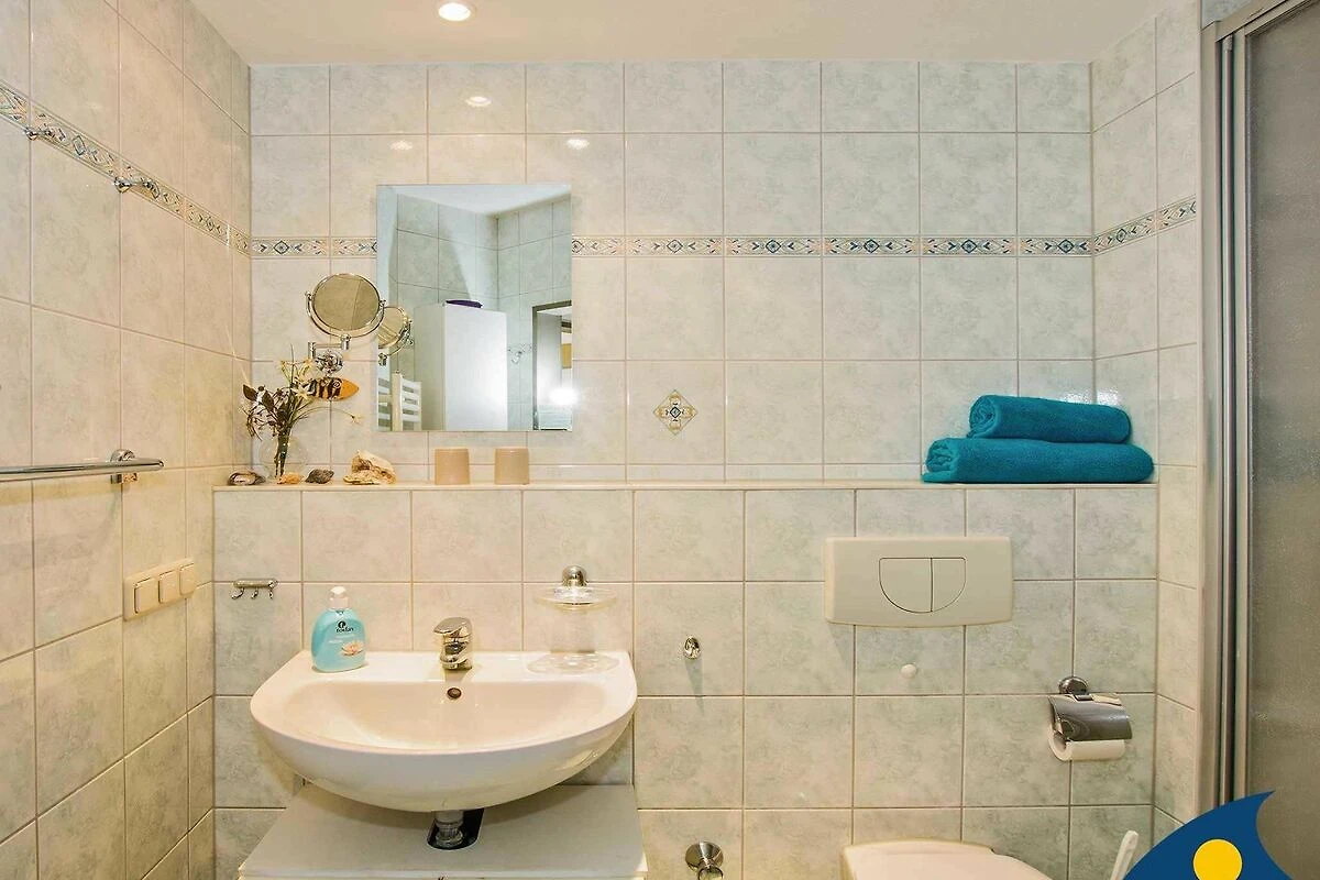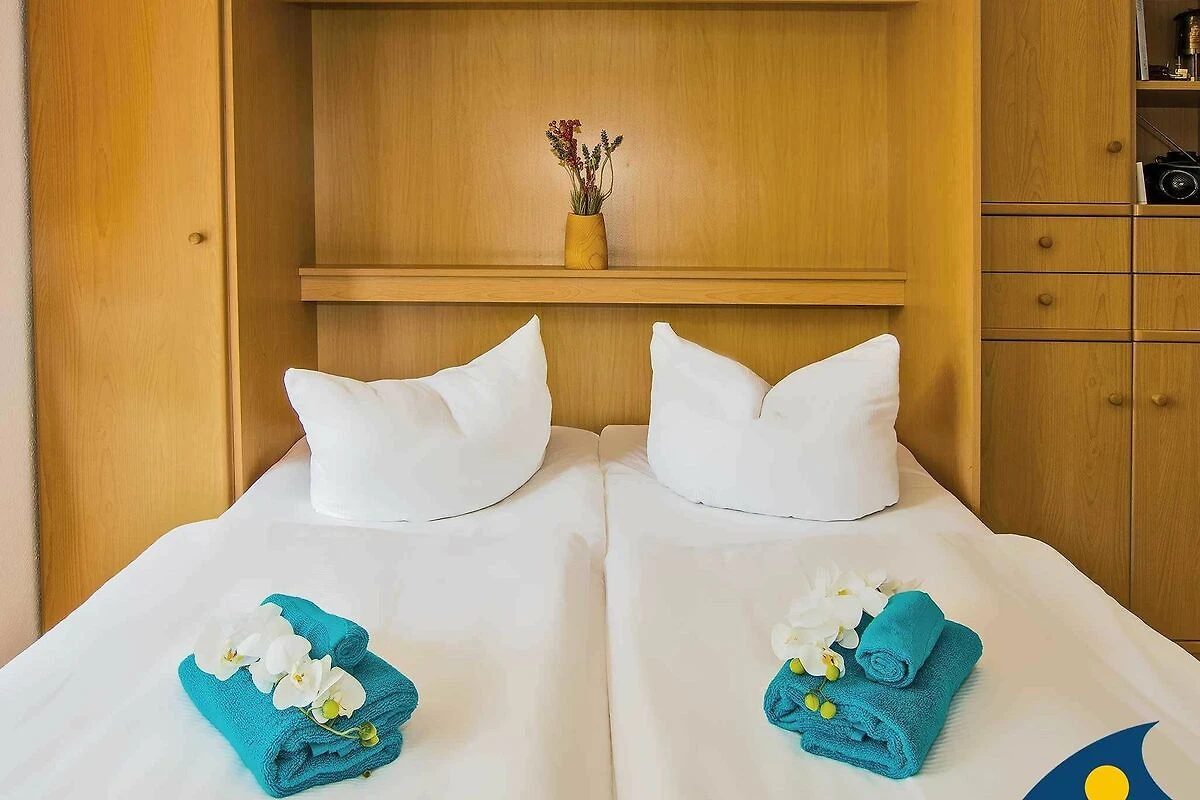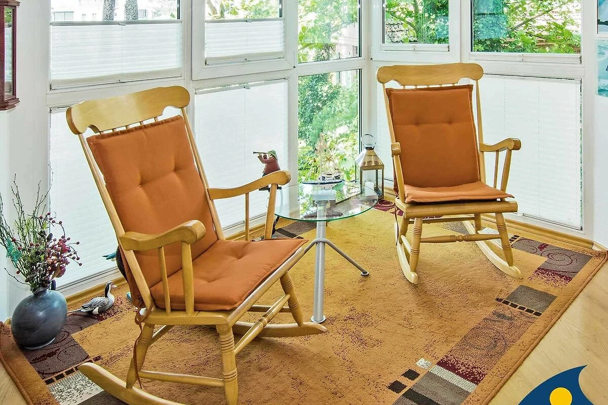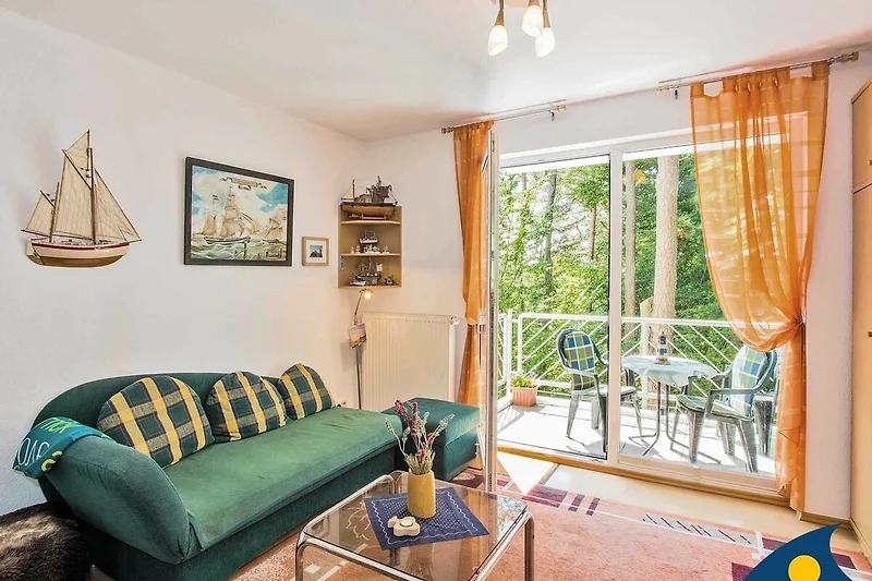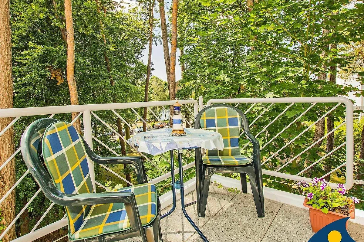 Dieses moderne, liebevolle und mit vielen maritimen Gegenständen eingerichtete Einraumappartement in der 3. Etage verfügt über ein komfortables Schrankbett mit Federkernmatratzen und eine sehr gut ausgestatteten Küchenzeile. In zwei Schaukelstühlen sitzend geniessen Sie aus dem Glaserker den Blick auf Meer und Strand. Vom Balkon aus reicht der Blick bis zum idyllisch gelegenen Schloonsee mit den vielen Wildenten, Schwänen und anderem Federvieh.