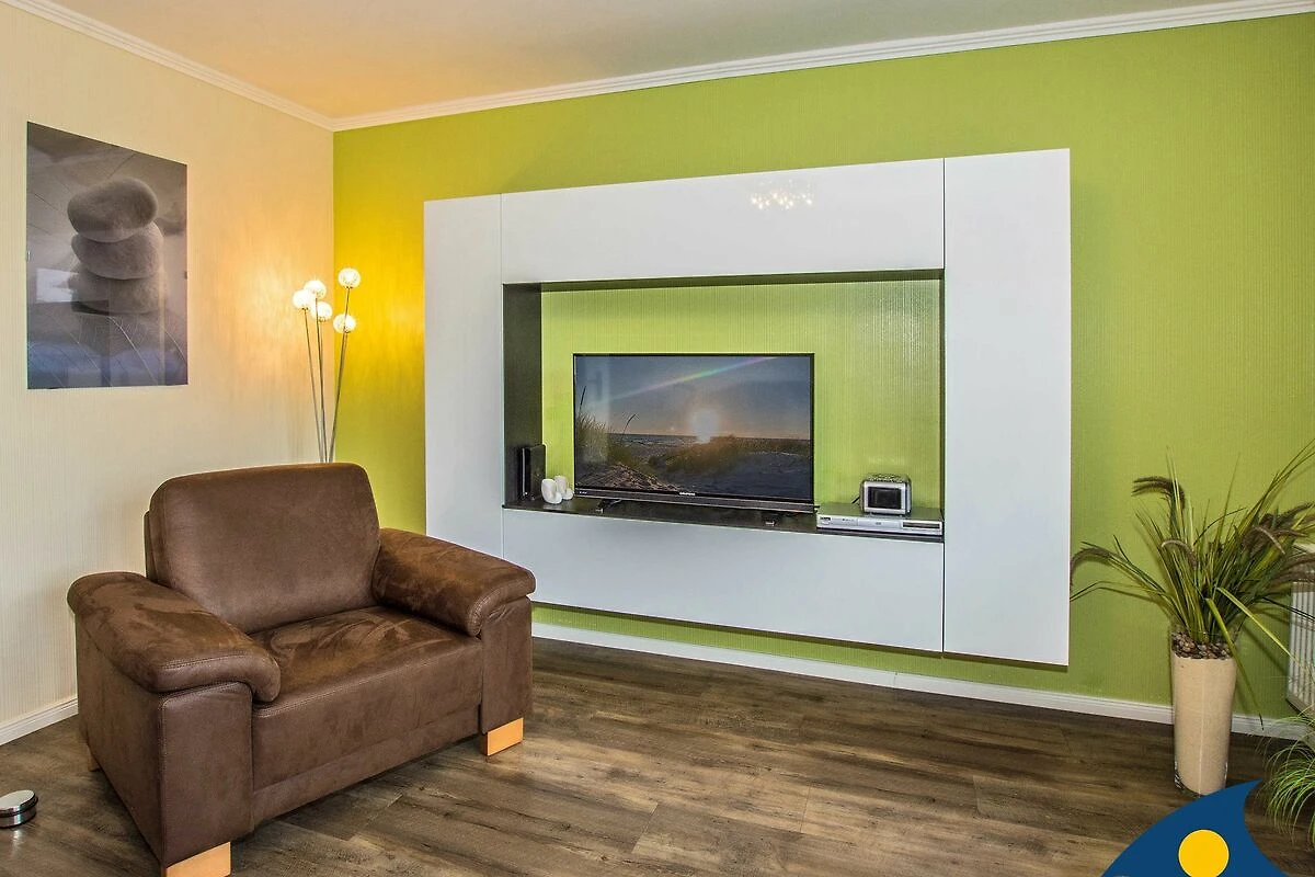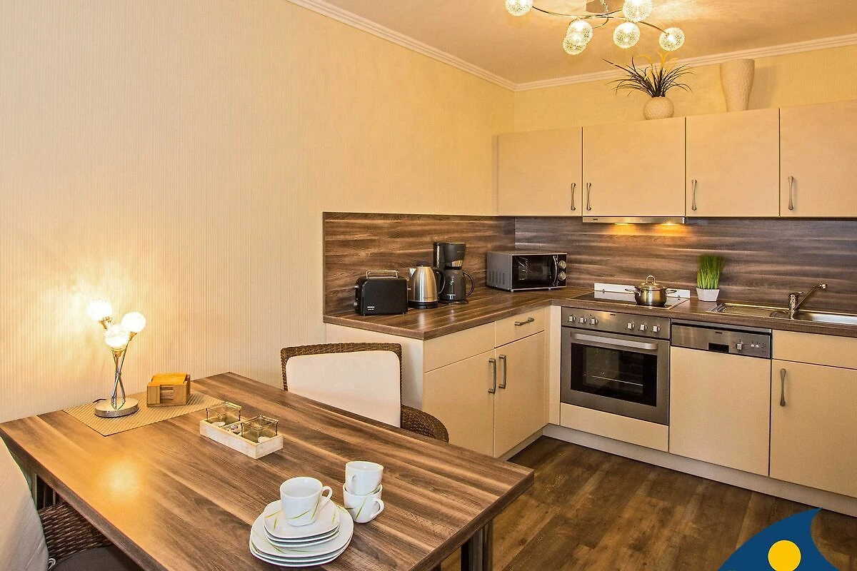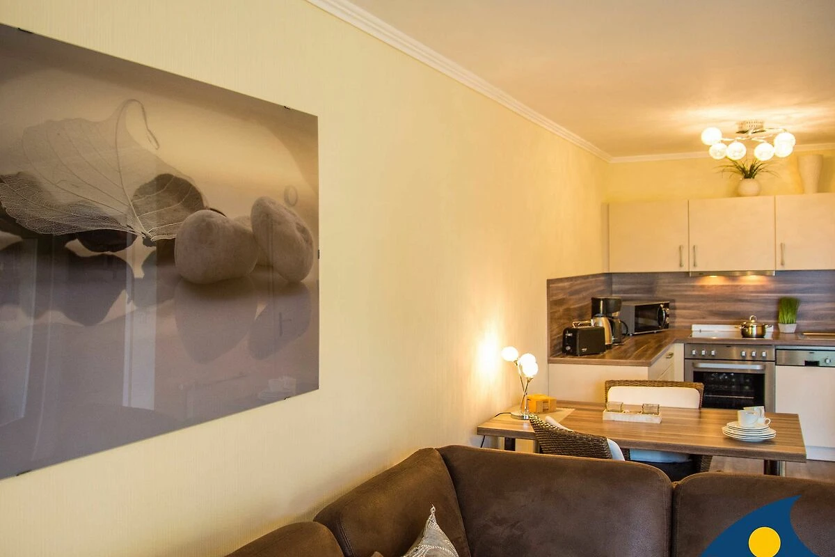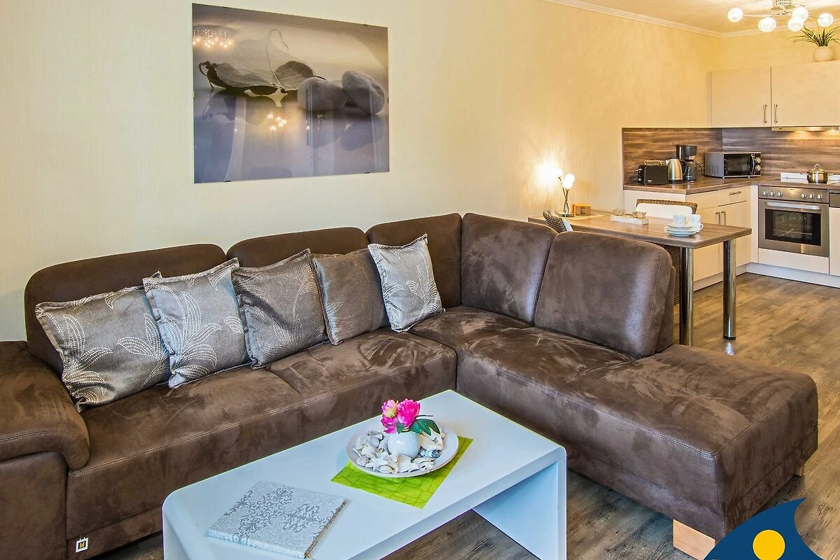 Modern, liebevoll und gemütlich ausgestattet begrüsst Sie diese herrliche 2-Raum-Ferienwohnung. Das Wohnzimmer mit dem bequemen Sofa, der grossen Fensterfront und der offenen Küche lässt Sie einen traumhaften Urlaub zu Zweit erleben. Der schöne Balkon lädt zum Frühstücken, zum Stöbern in einem schönen Buch oder einem Gläschen Wein ein. Von hier aus reicht der Blick bis zum Meer und zum weissen Sandstrand. Diesen erreichen Sie in 3 Minuten zu Fuss.