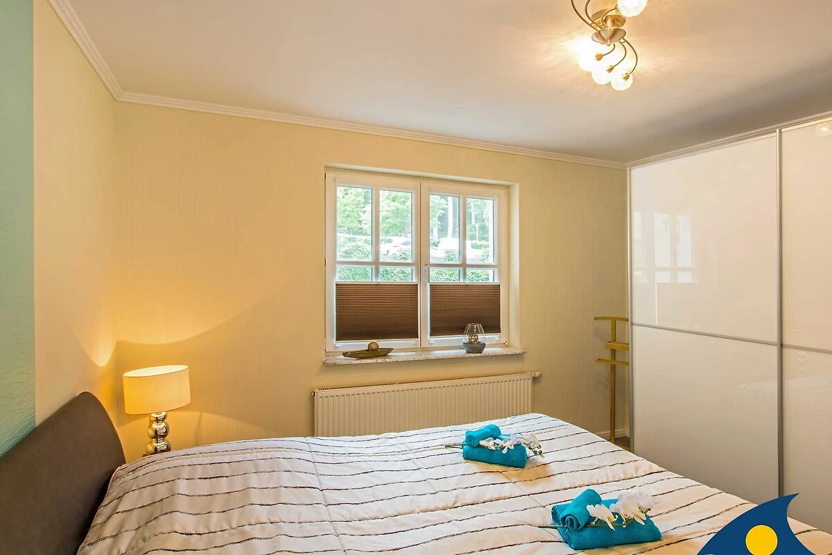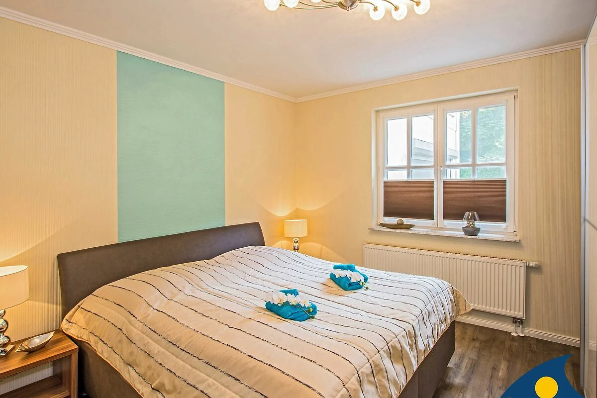 Das Schlafzimmer mit dem gemütlichen Doppelbett und das elegante Badezimmer mit WC und Dusche lassen Ihren Usedom Urlaub perfekt werden.