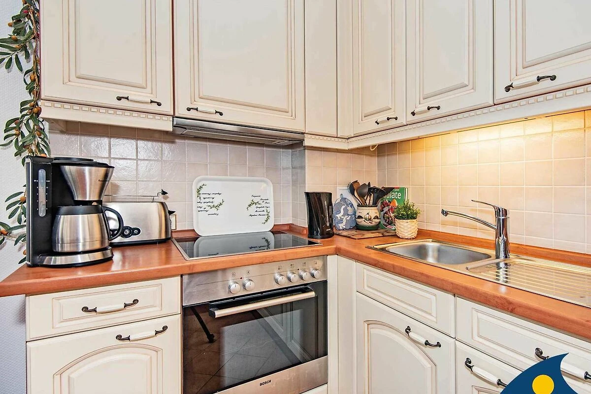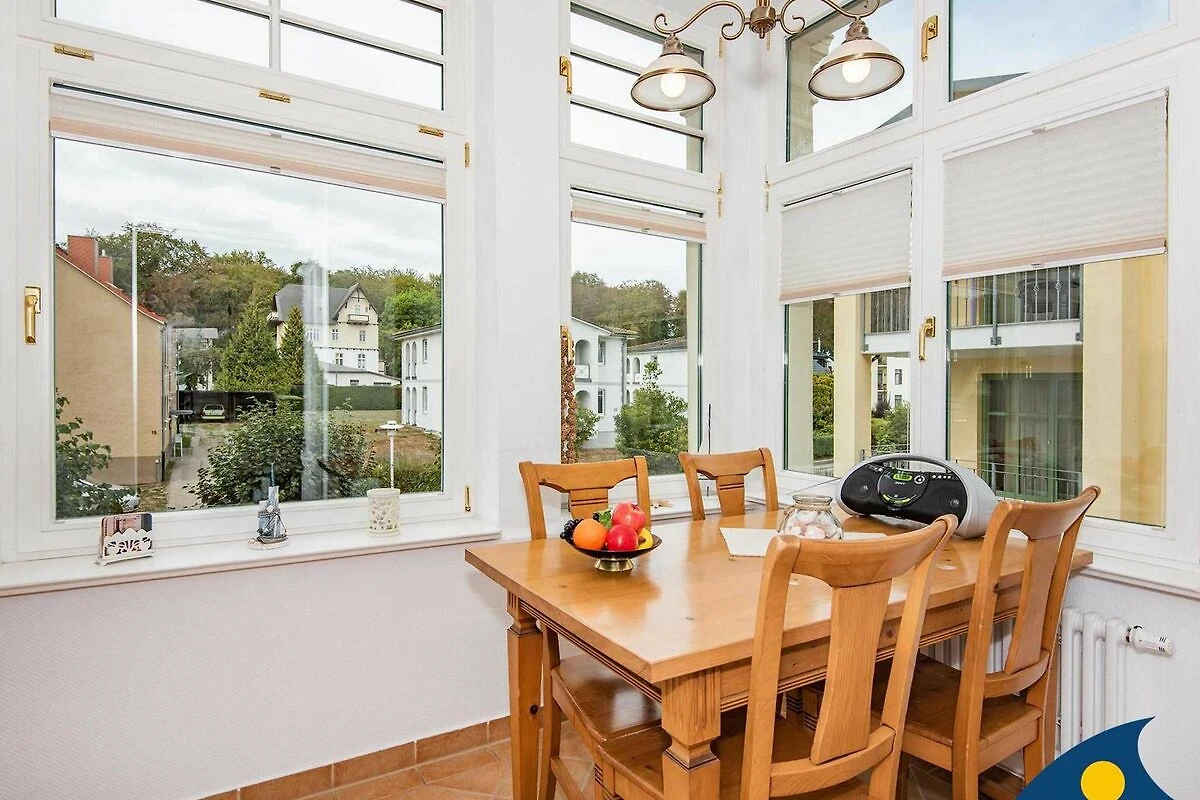 Die Küchenzeile ist im Wohnzimmer integriert und beherbergt viele nützliche Dinge für die tägliche Selbstverpflegung. Der Essplatz in der Loggia bietet Ihnen einen herrlichen Ausblick auf die angrenzenden Villen und den Buchenpark.