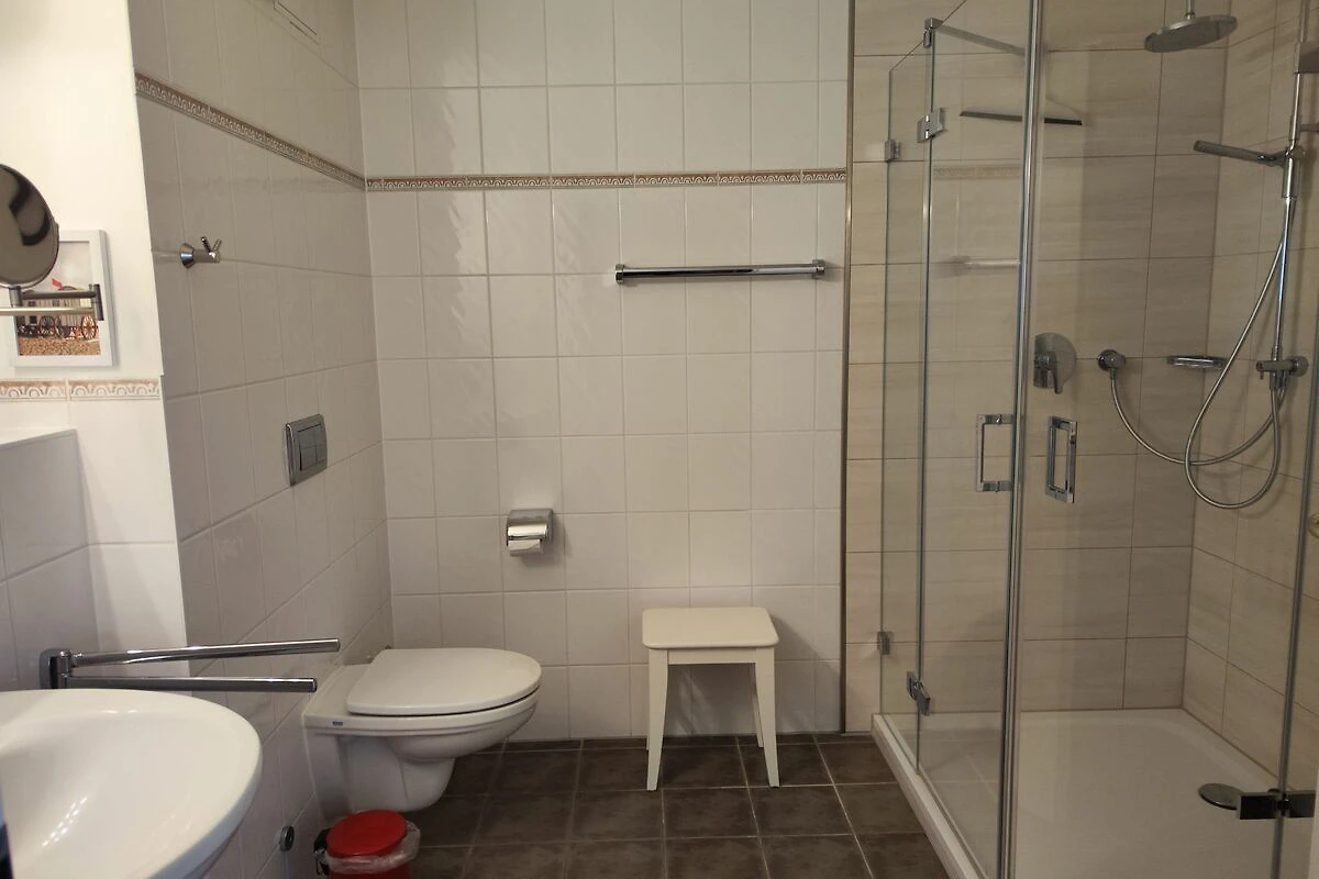 Das Bad ist mit Dusche, WC und Fön ausgestattet. Pro Person liegen ein grosses und ein kleines Handtuch bereit.
