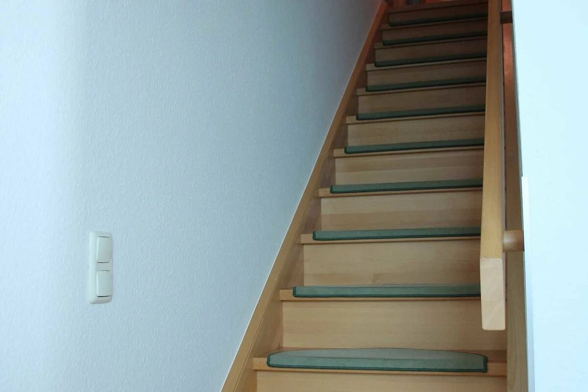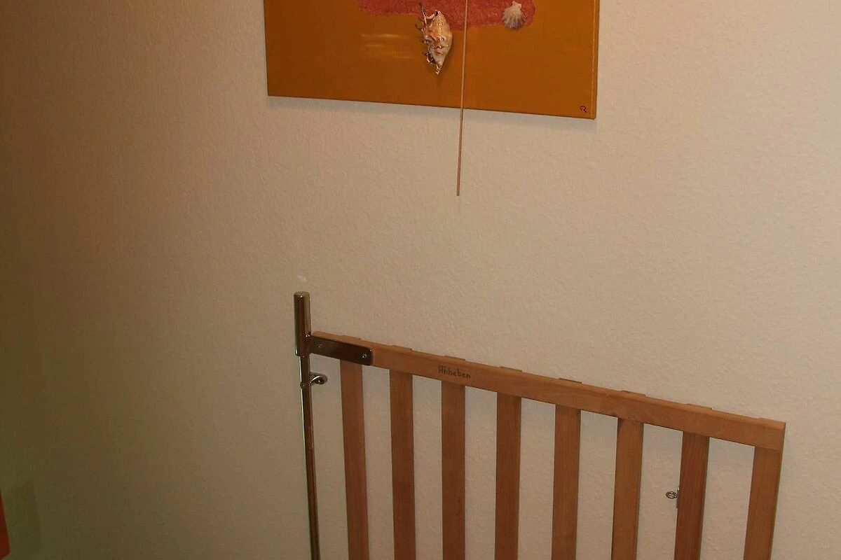 Im 1. Obergeschoss befinden sich der Wohnbereich mit Küche und der Zugang zum Balkon. Über eine Innentreppe gelangt man in die obere Etage mit zwei Schlafzimmern (1x Doppelbett, 1x Schlafcouch, zusätzlich Platz für ein Babybett).