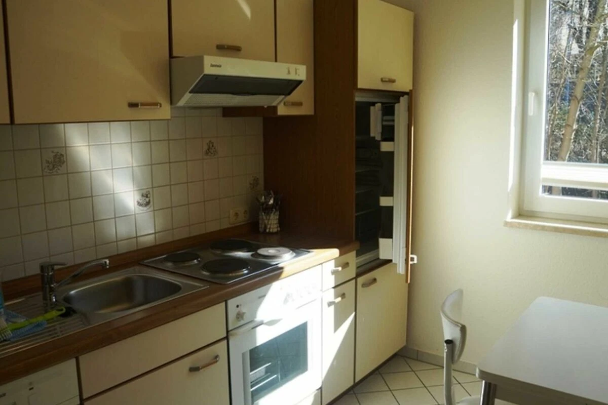 Zu der 3 Raum Ferienwohnung gehört ein Wohnzimmer mit Couch und TV ein Badezimmer mit Dusche und eine extra Küche. In der Küche befindet sich ein Backofen, ein Geschirrspüler und die zusätzliche komplette Ausstattung.