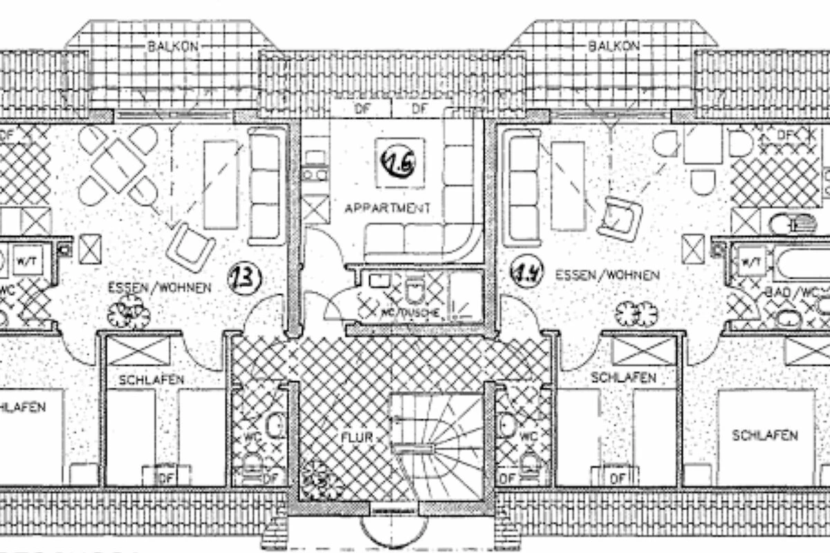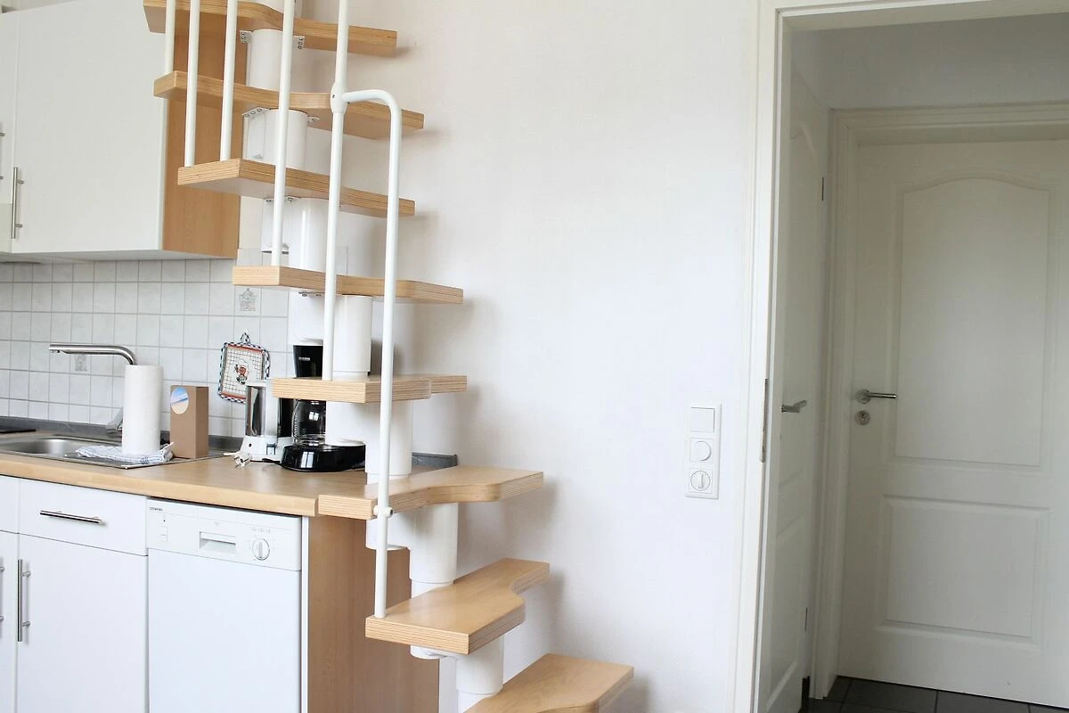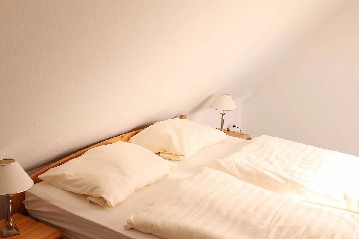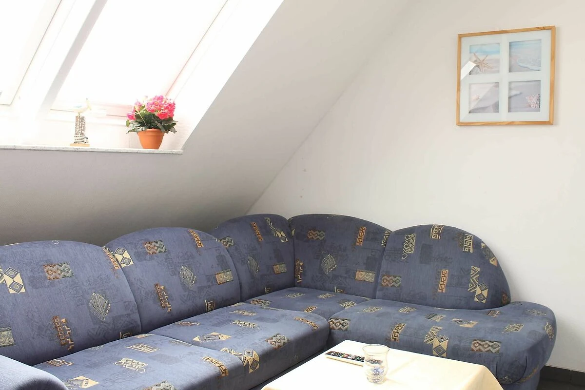 Sie wohnen in einer 45 qm grossen 3-Raum Komfort-Dachgeschoss-Wohnung für 4 Personen. Der helle Wohnbereich hat eine komfortable Wohnlandschaft mit Essbereich. Die angrenzende, offene Küchenzeile ist ausgestattet mit einen 2 Platten Kochfeld, Kühlschrank, Spülmaschine und Kaffeemaschine. Über eine Raumspartreppe (steile, gewendelte Treppe, nicht geeignet für Ältere & Kleinkinder) erreichen Sie die beiden Schlafräume. Ein Schlafraum verfügt über ein Doppelbett mit Kleiderschrank, das andere Schlafzimmer hat 2 Einzelbetten und einen Kleiderschrank. Das Bad verfügt über eine Dusche, Waschbecken und WC. Die Dachgeschosswohnung ist mit Direktwahltelefon, WLAN und LED TV ausgestattet. Auf dem Grundstück steht den Gästen eine Terrasse zur Verfügung. Die Erstausstattung Bettwäsche und Handtücher ist bereits inklusive.