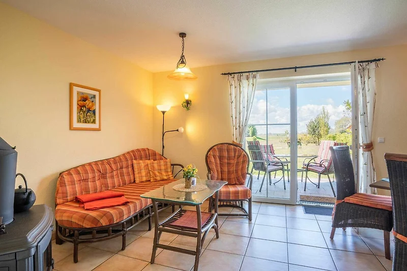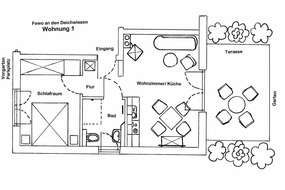Die 2-Raum-Ferienwohnungen 01,02,05 und 06 befinden sich im Erdgeschoss und verfügen alle über eine Terrasse zum Garten.