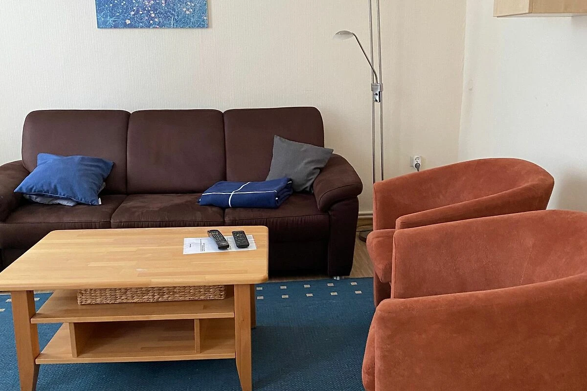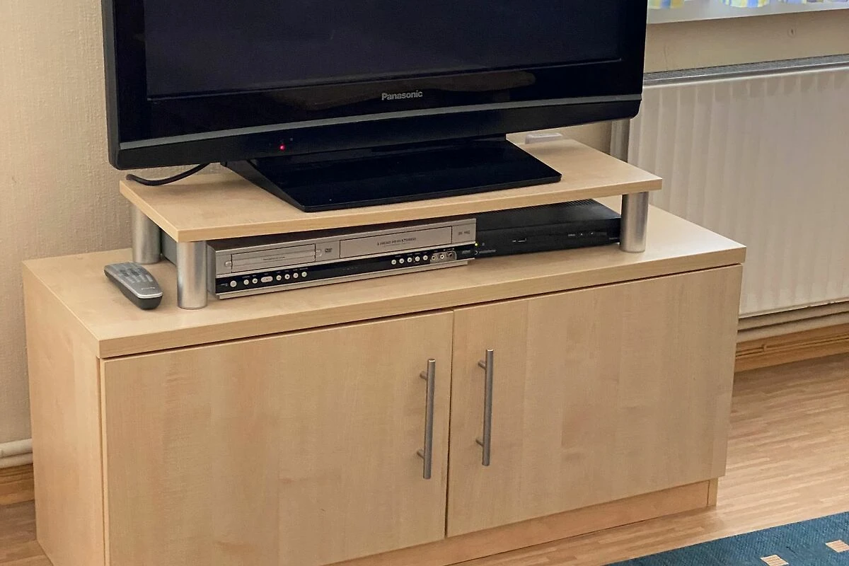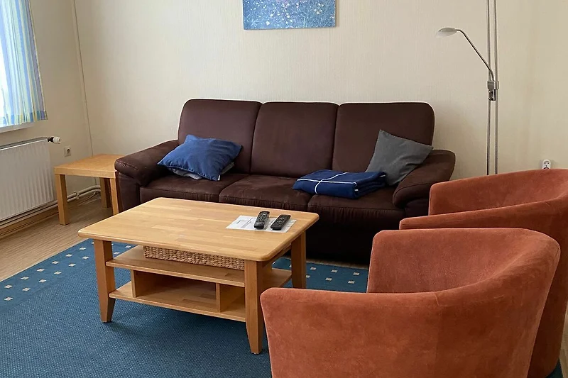 Das Wohnzimmer hat eine Fläche von ca. 26 qm und bietet mit einer Sitzgarnitur und einer Essecke mit ausziehbarem Esstisch genügend Raum für 4 Personen. Kabelfernsehen, Radio, Video- und DVD-Player sind vorhanden.
