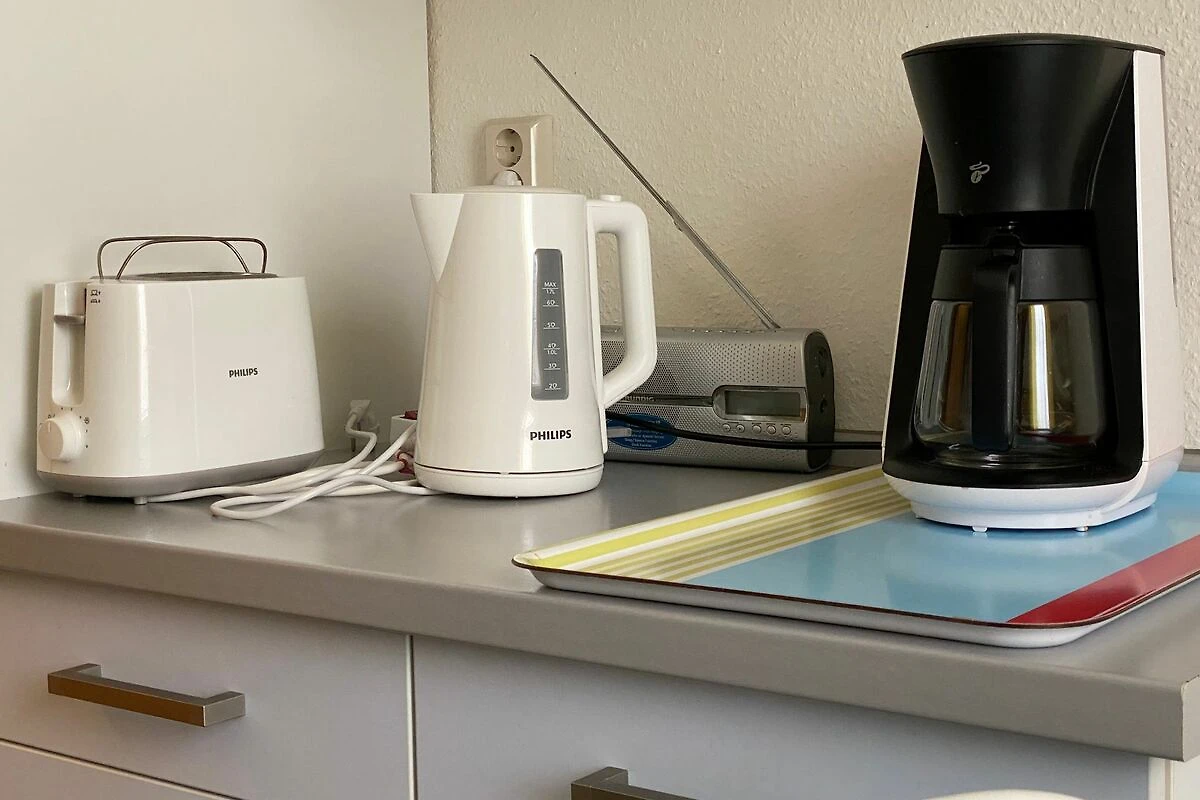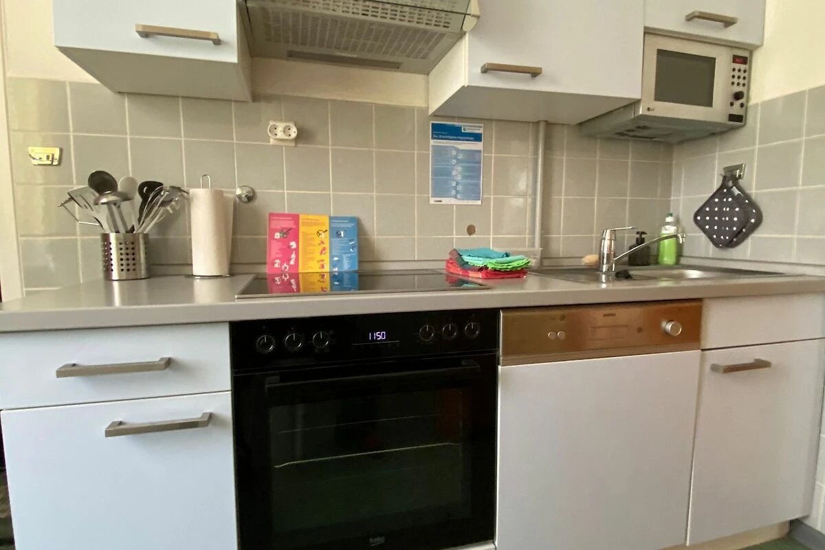 Die Küche ist komplett ausgestattet mit einer Sitzgruppe für 4 Personen, E-Herd und Backofen, Mikrowelle, Geschirrspüler, Kühlschrank mit Frosterfach, Kaffeemaschine, Toaster, Wasserkocher sowie Geschirr,Töpfe und Pfannen.