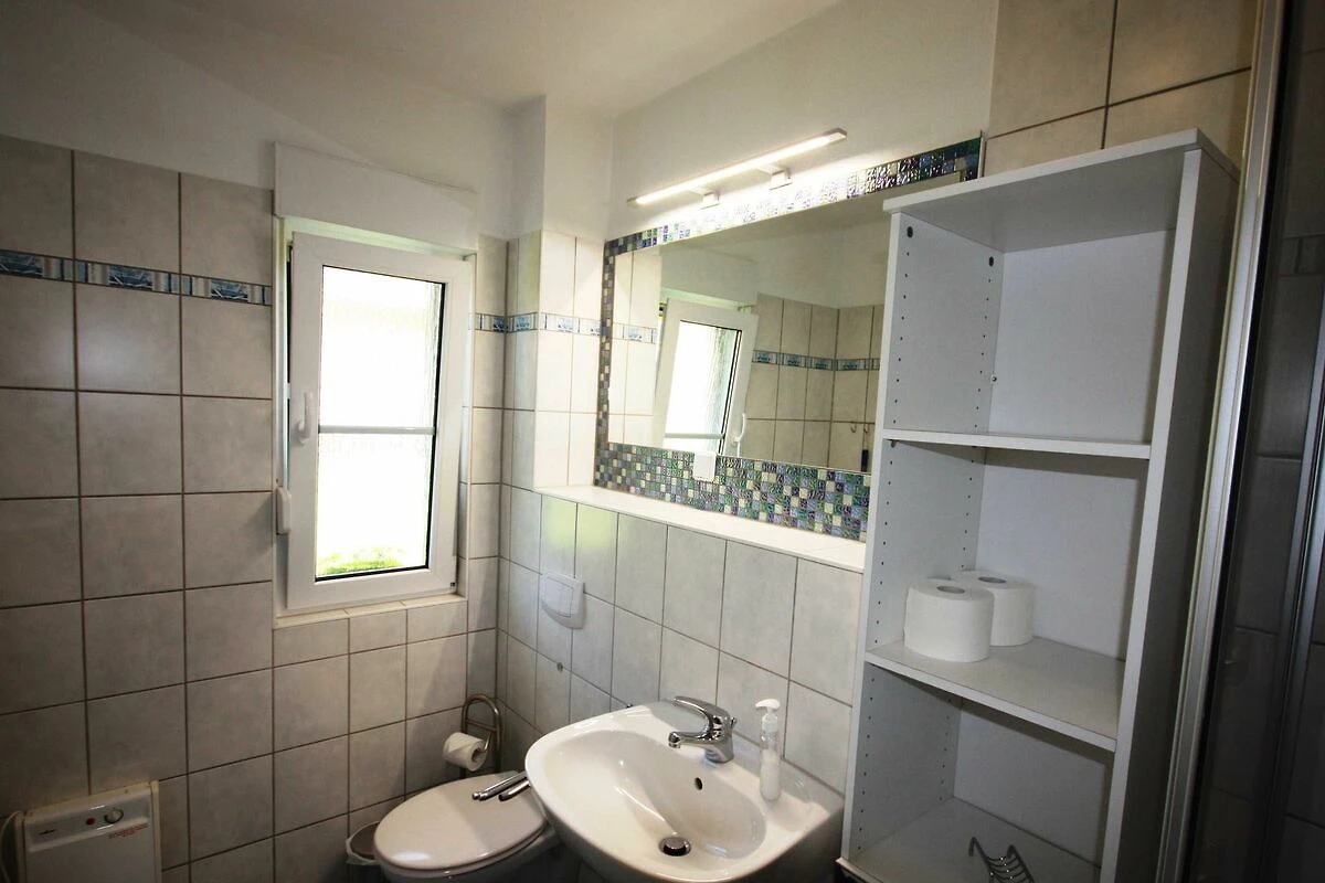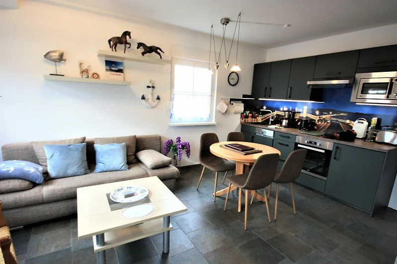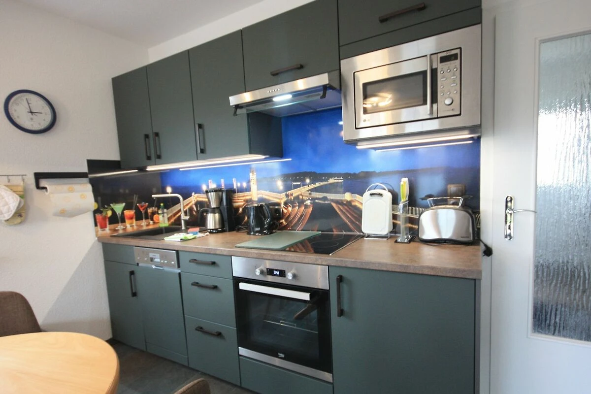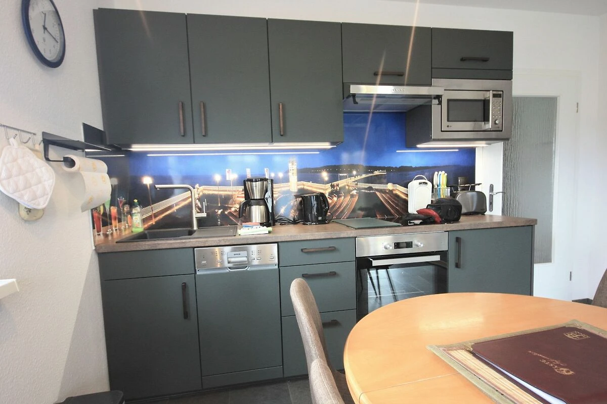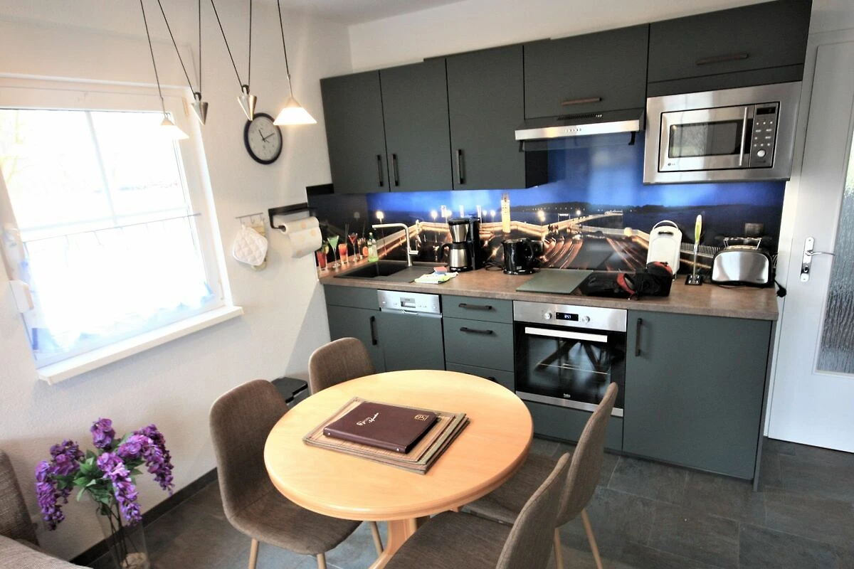 Die Ferienwohnung liegt im Erdgeschoss des Ferienhauses links. Sie besteht aus Wohnzimmer, kompl. ausgestatteter Küche, Balkon mit Sitzmöbeln, Schlafzimmer und Tageslichtbad. Die Ausstattung der buchefarbenen Einbauküche ist neuwertig funktional und qualitativ hochwertig unter anderem mit Toaster, Kaffeemaschine, Mikrowelle mit Grill, Ceran-Kochfeld, Geschirrspüler, Gefrierfach. Grosse Süd-West-Terrasse mit Blick auf den Wald und den Sonnenuntergang, Grill.