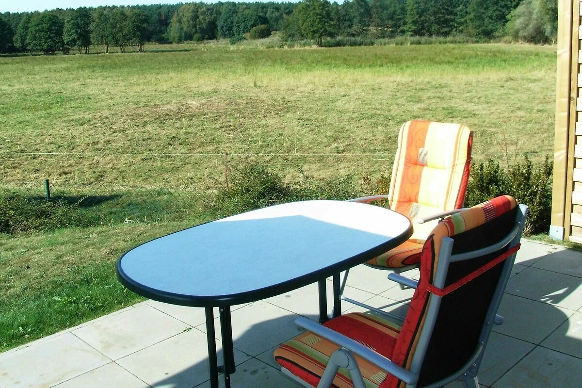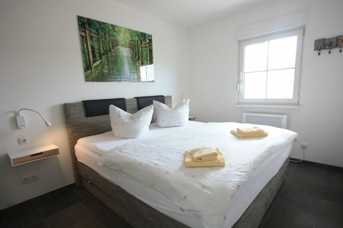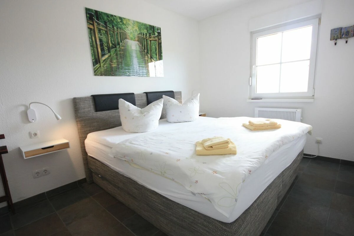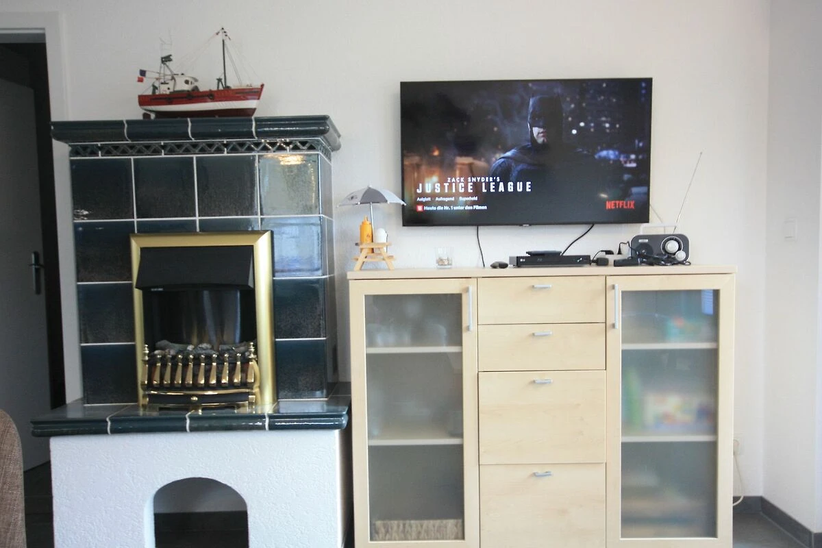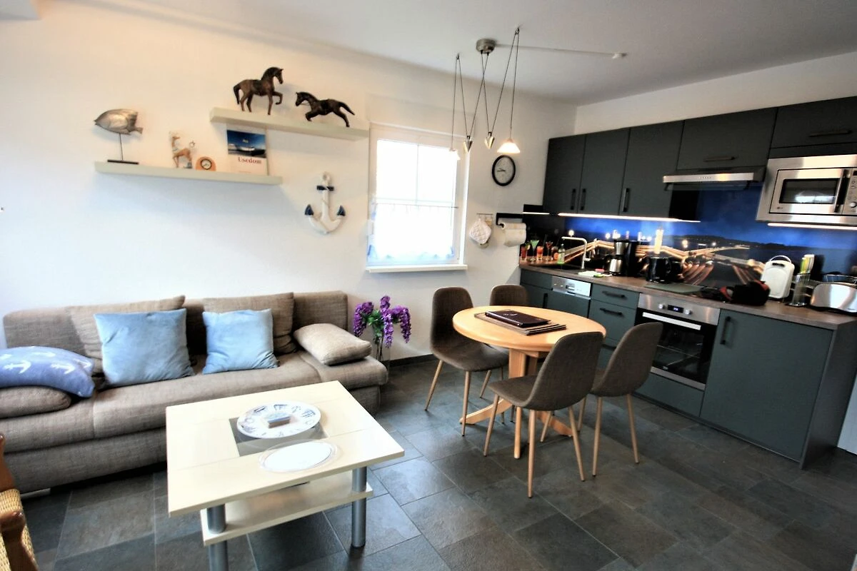 Die Ferienwohnung liegt im Erdgeschoss des Ferienhauses links. Sie besteht aus Wohnzimmer, kompl. ausgestatteter Küche, Balkon mit Sitzmöbeln, Schlafzimmer und Tageslichtbad. Die Ausstattung der buchefarbenen Einbauküche ist neuwertig funktional und qualitativ hochwertig unter anderem mit Toaster, Kaffeemaschine, Mikrowelle mit Grill, Ceran-Kochfeld, Geschirrspüler, Gefrierfach. Grosse Süd-West-Terrasse mit Blick auf den Wald und den Sonnenuntergang, Grill.