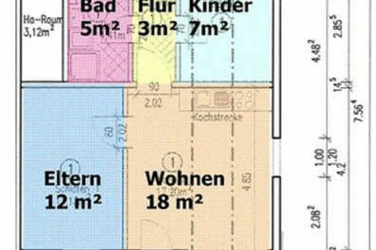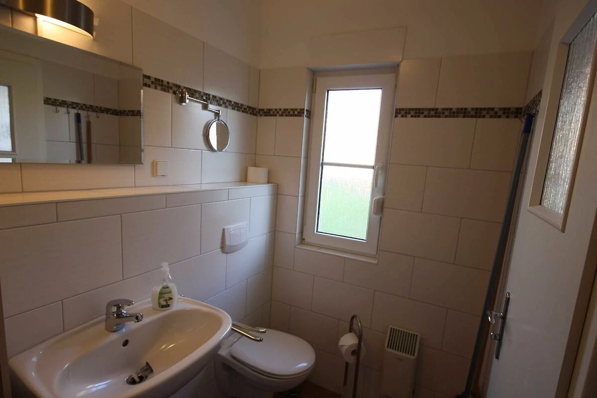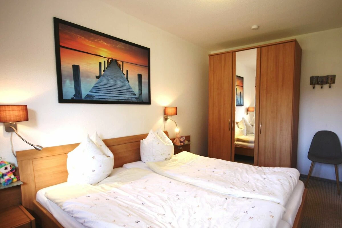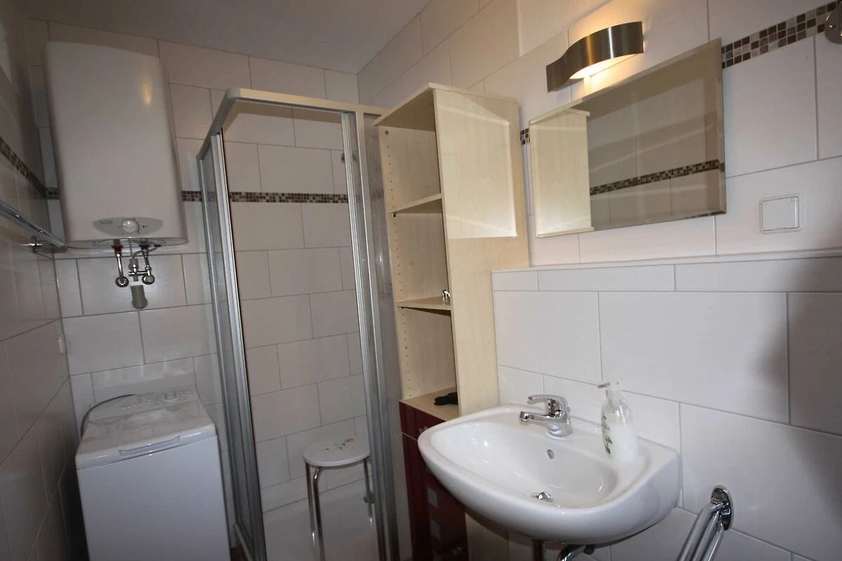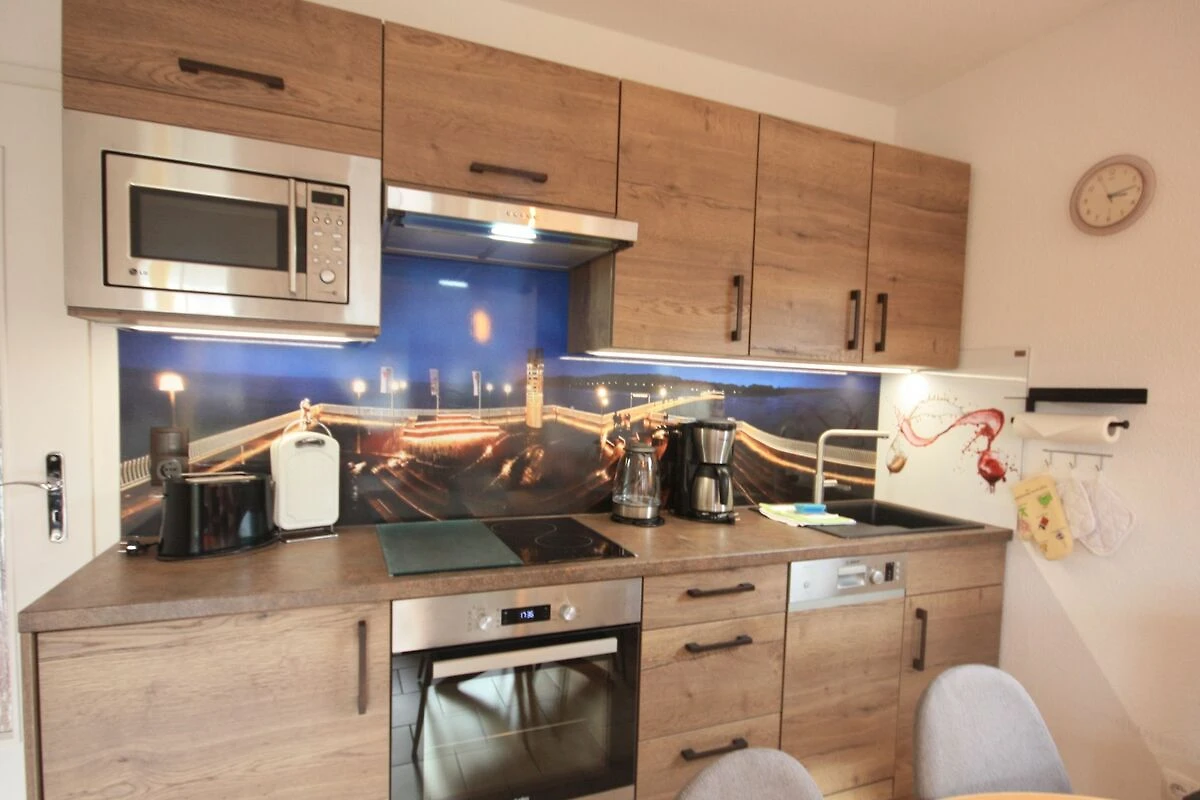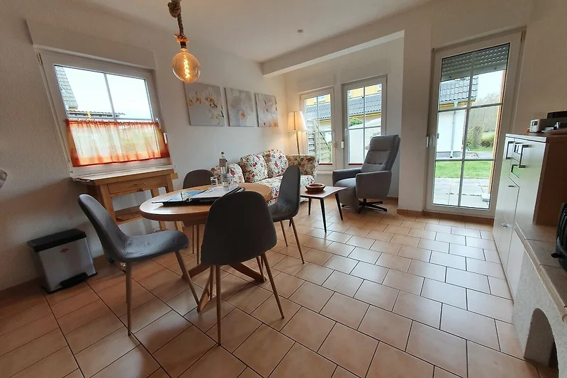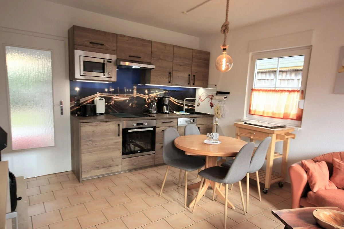 Die Ferienwohnung liegt im Erdgeschoss des Ferienhauses links. Sie besteht aus Wohnzimmer, kompl. ausgestatteter Küche, Balkon mit Sitzmöbeln, Schlafzimmer und Tageslichtbad. Die Ausstattung der bordeauxfarbenen Einbauküche ist neuwertig funktional und qualitativ hochwertig unter anderem mit Toaster, Kaffeemaschine, Mikrowelle mit Grill, Ceran-Kochfeld, Geschirrspüler, Gefrierfach. Grosse Süd-West-Terrasse mit Blick auf den Wald und den Sonnenuntergang, Grill.