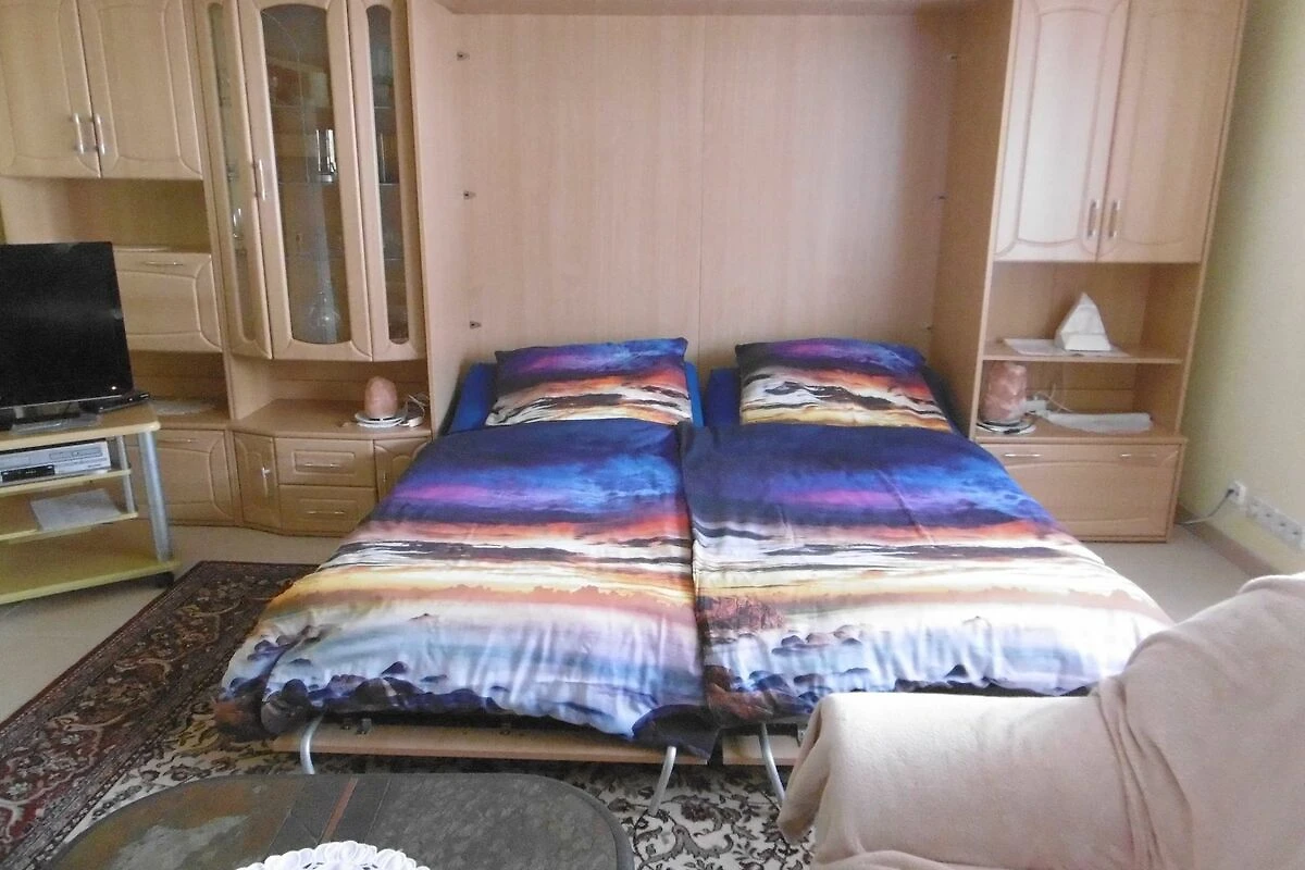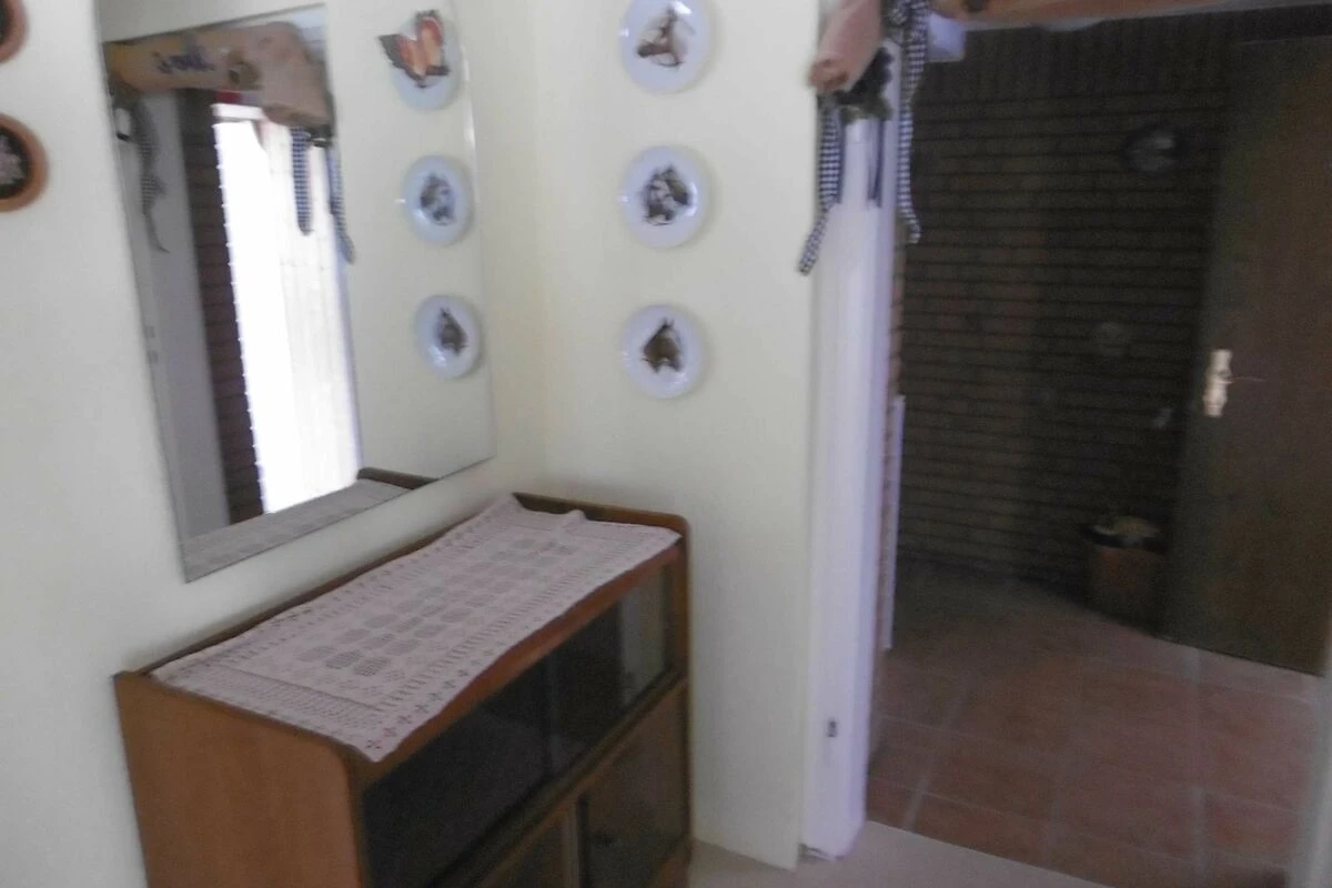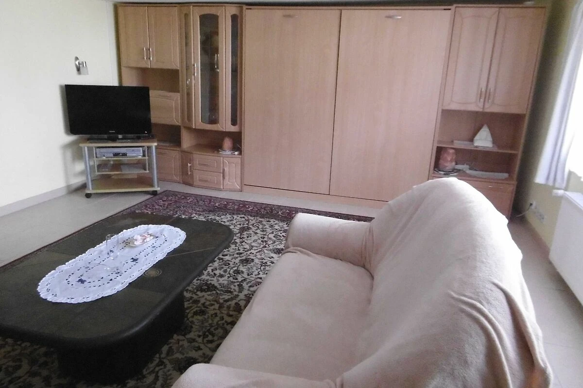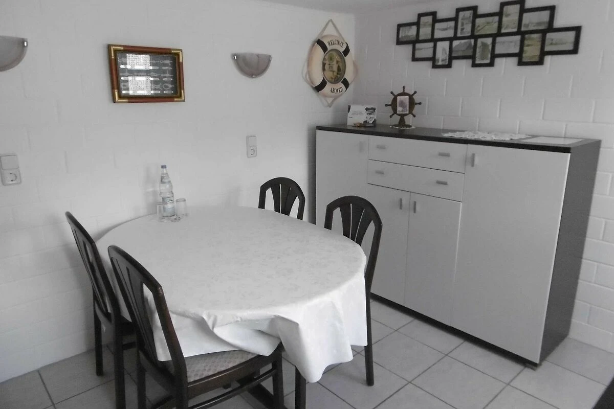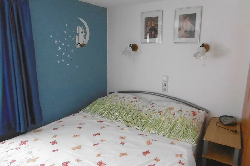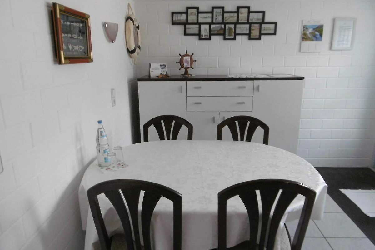 Ebenerdig gibt es eine Veranda mit einem Esstisch für 4 Personen, ein Schlafzimmer mit einem Doppelbett (1,40 X 2 m ), ein Bad mit DU/WC, sowie auch ein Wohnbereich mit einer Schrankwand mit integriertem Doppelbett (180 X 190 cm) und SAT - TV.Für Kinder ist viel Spielzeug und Beschäftigungsmaterial im Ferienhaus. Auch gibt es für Leseratten eine Auswahl vielfältiger Bücher.
