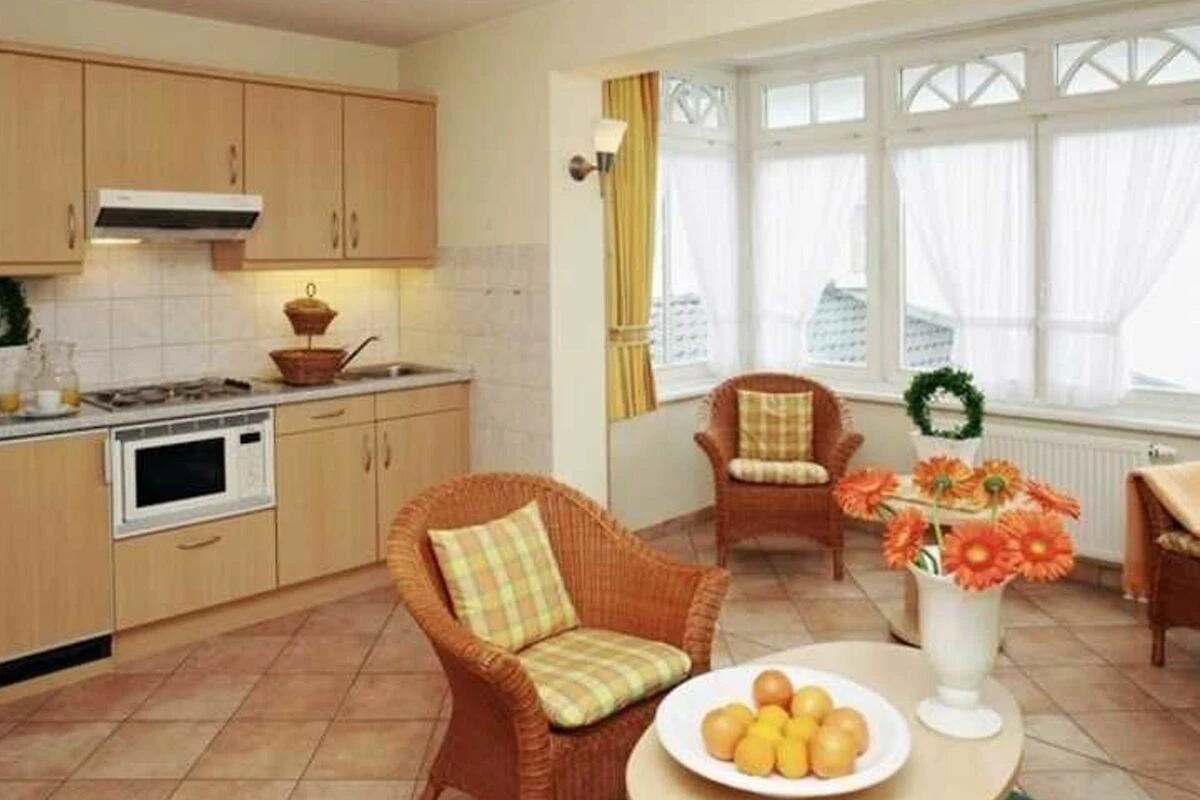 Ins Wohnzimmer gelangen Sie über einen kleinen Flur mit teilweise Abstellraum für Gepäck und Ähnliches. Hier finden Sie, neben einer bequem ausziehbaren Doppelbettcouch, Sesseln und einem Couchtisch, eine gemütliche Veranda mit Sitzecke, eine Essecke für 6 Personen selbstverständlich auch Farb-TV, DVD- und CD-Player, Stereo-Radio, Durchwahltelefon, WLan und Sprechanlage, sowie eine vollständig eingerichtete Küche. Mikrowelle mit Grillfunktion, 4-Plattenherd,Toaster, Kaffeemaschien, Geschirrspüler und Kühlschrank. Die Erdgeschoss-Wohnung Nr. 1 verfügt über eine eigene Terrasse und kann gern auch von Rollstuhlfahrern genutzt werden.( rollstuhlgeeignet)
