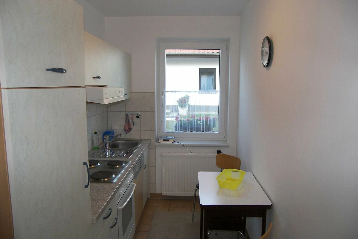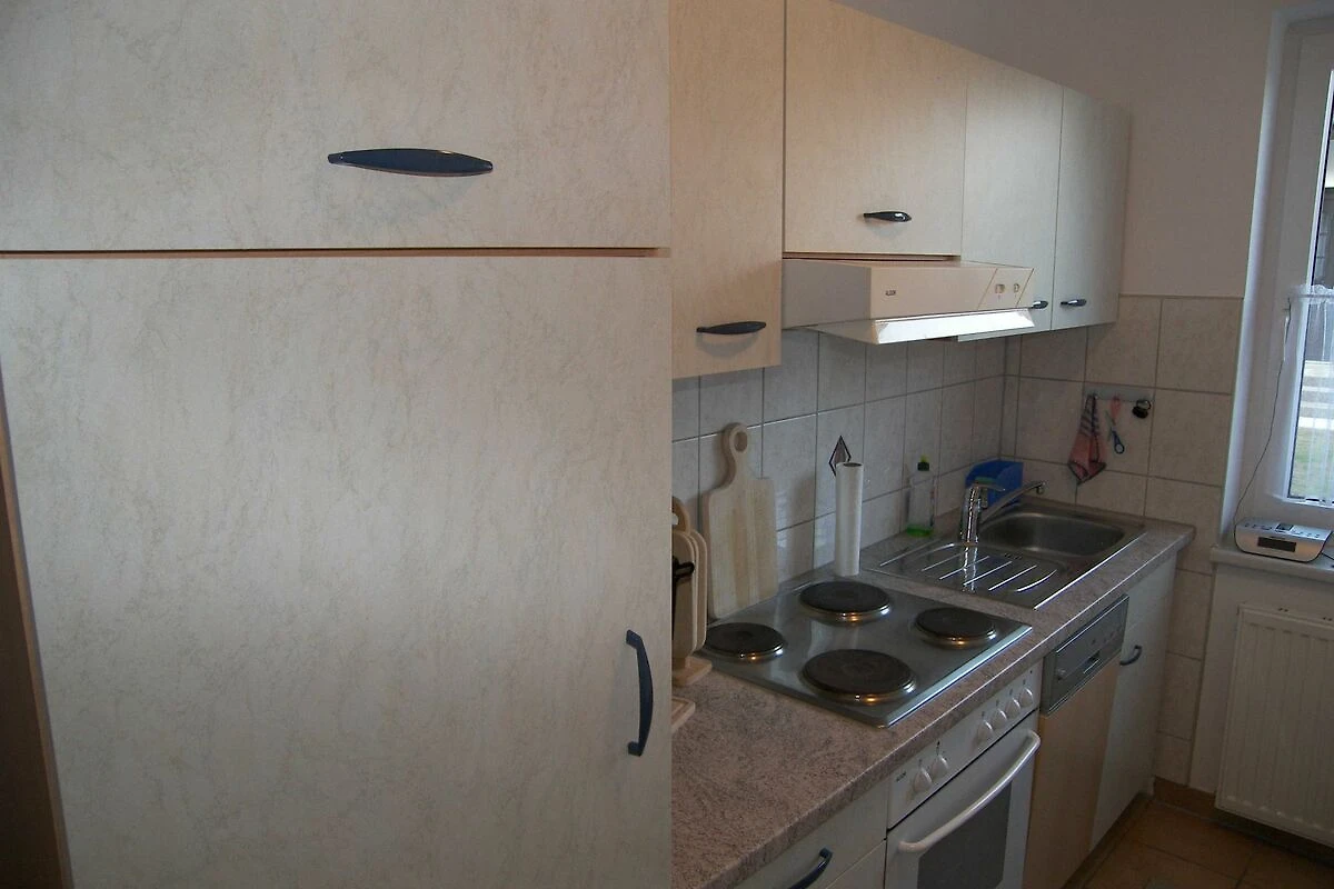 Die Wohnung verfügt über eine separate Küche mit 4 Platten-Herd mit Backofen, Wasserkocher, Toaster und Kaffeemaschine und einem kleinen Esstisch mit 2 Stühlen.